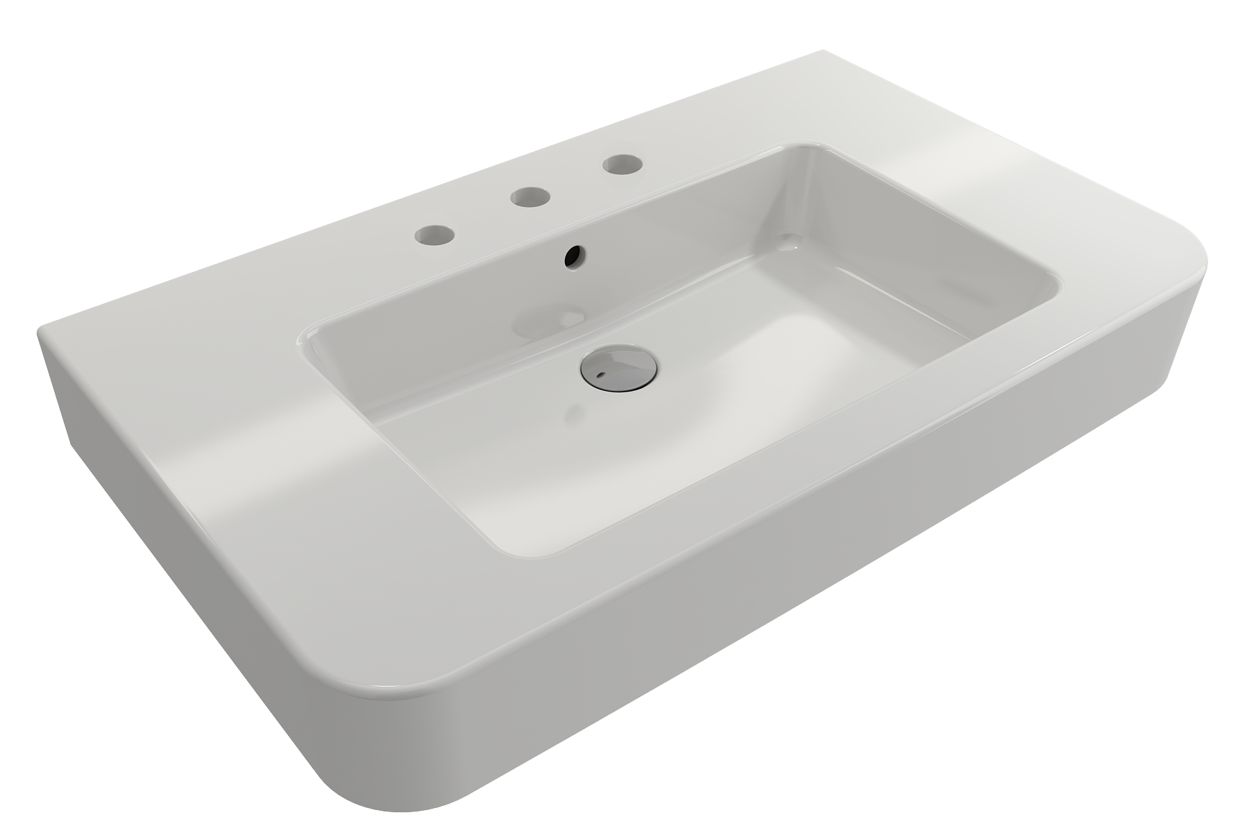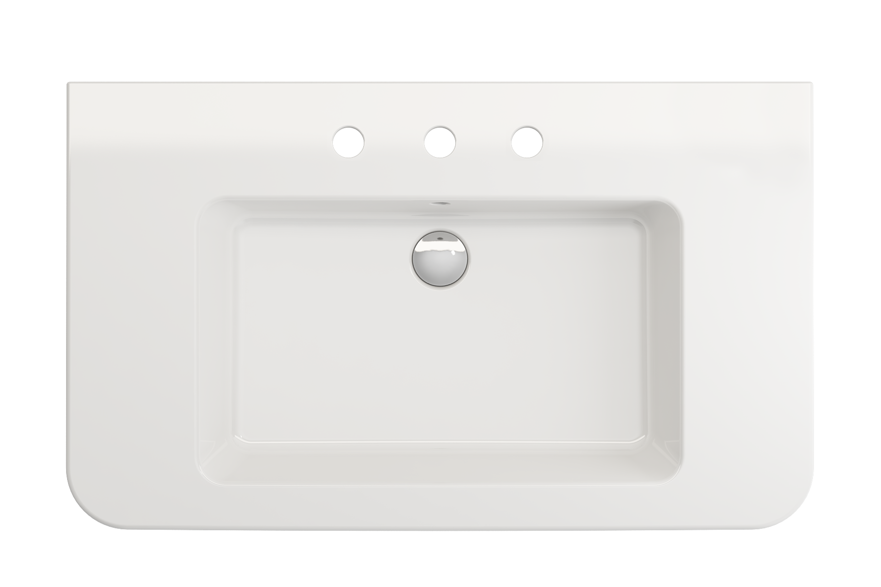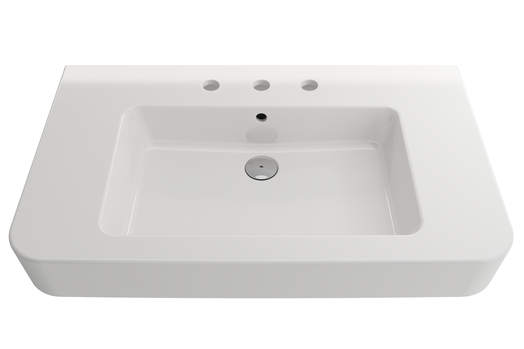 Bathroom sink with 3-hole (8in.) faucet setting. May be wall-hung, used with metal console legs, or counterset.