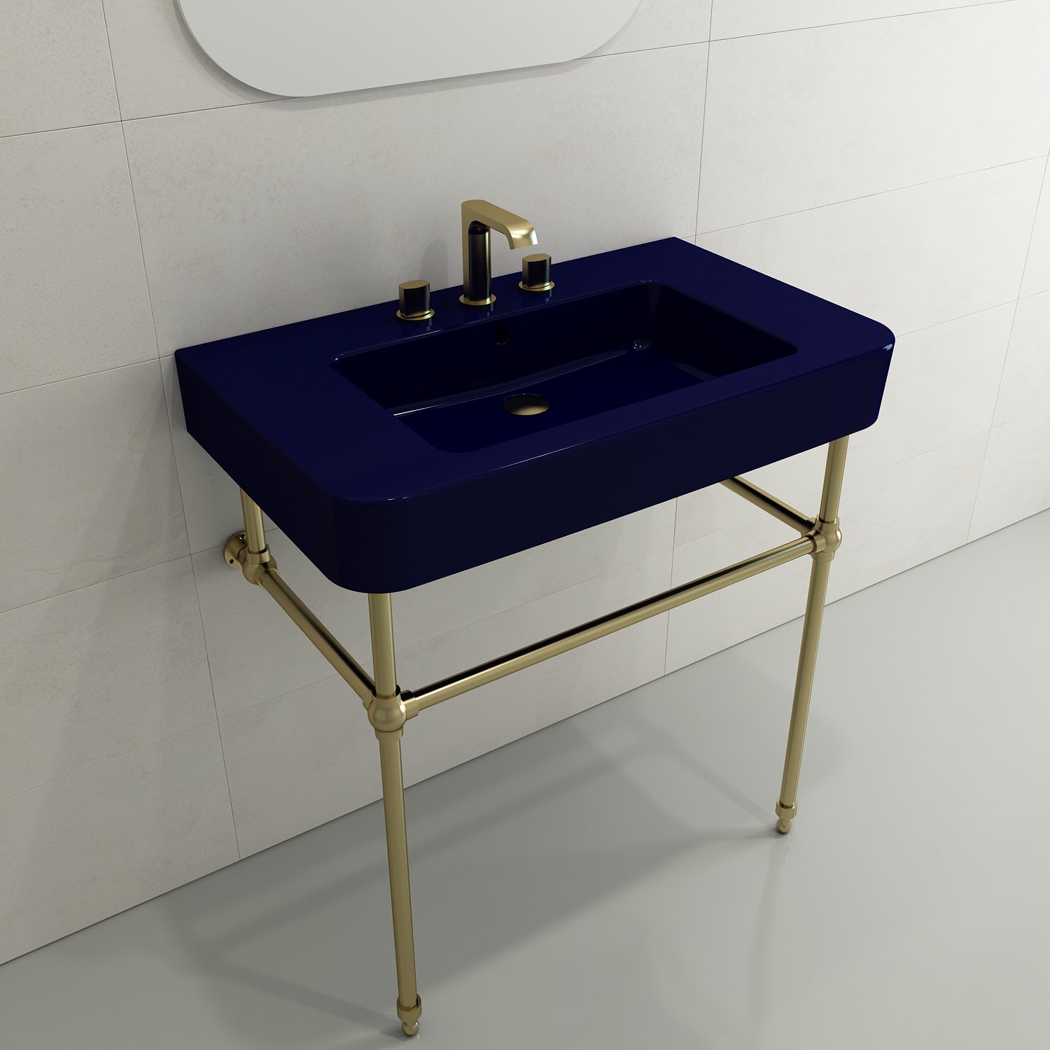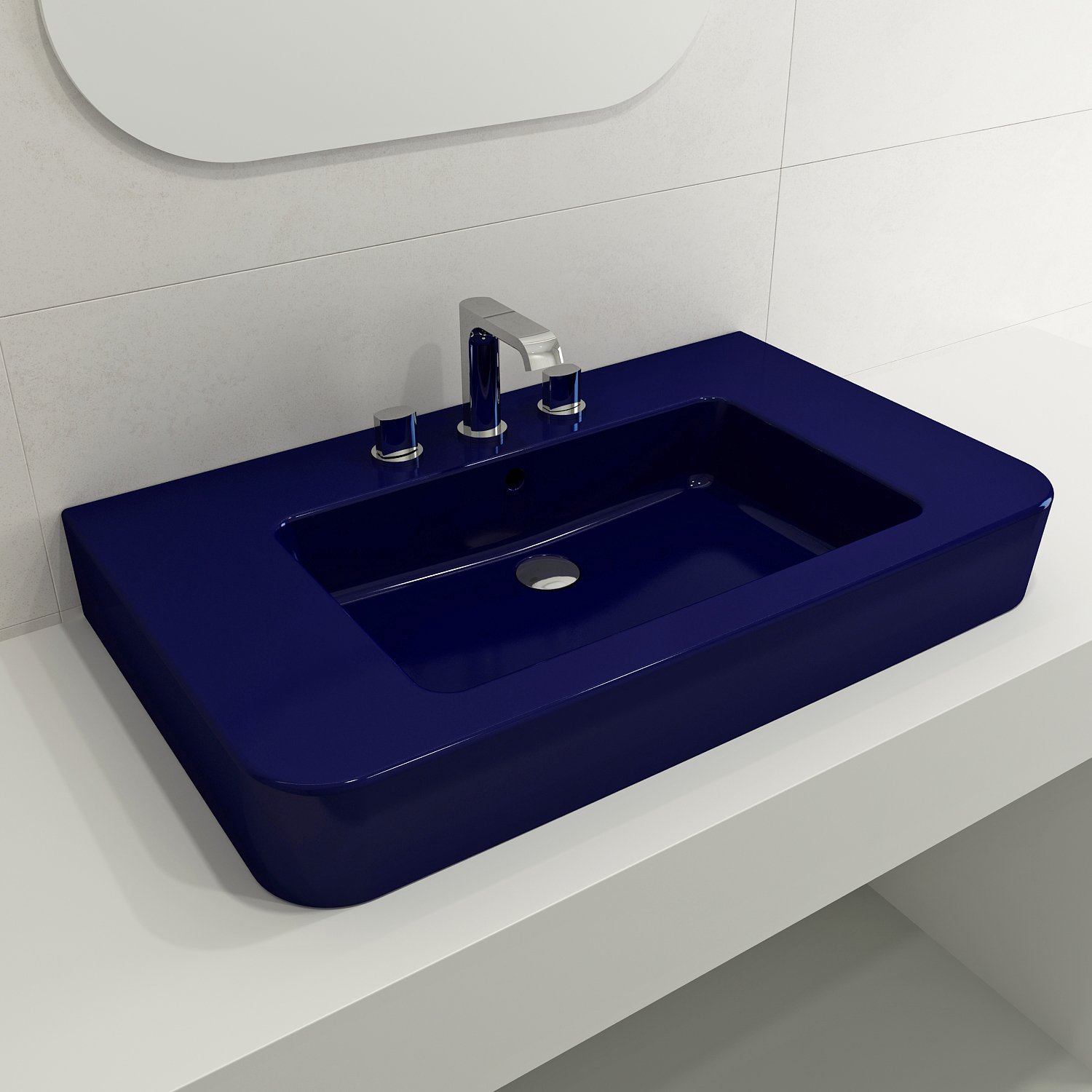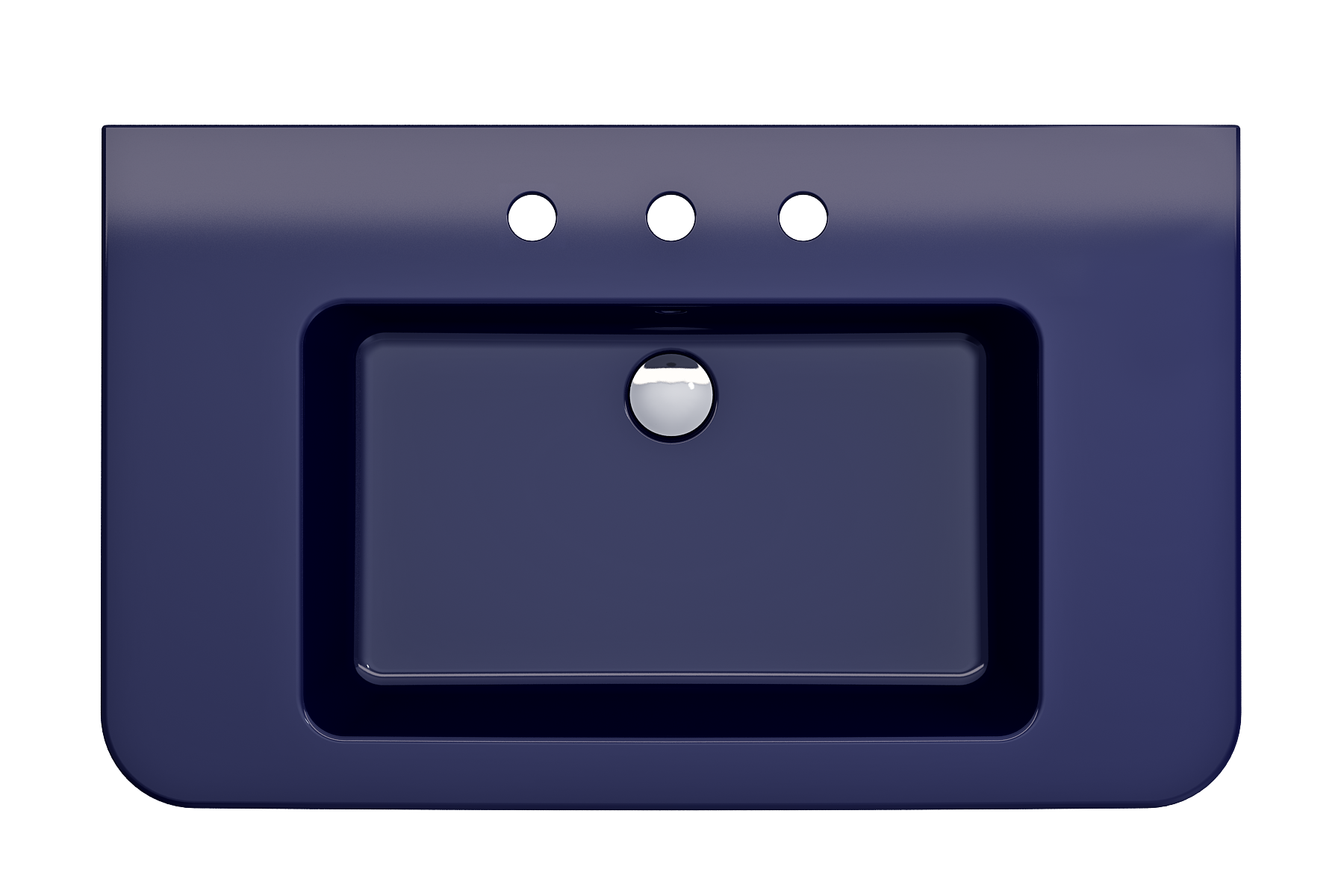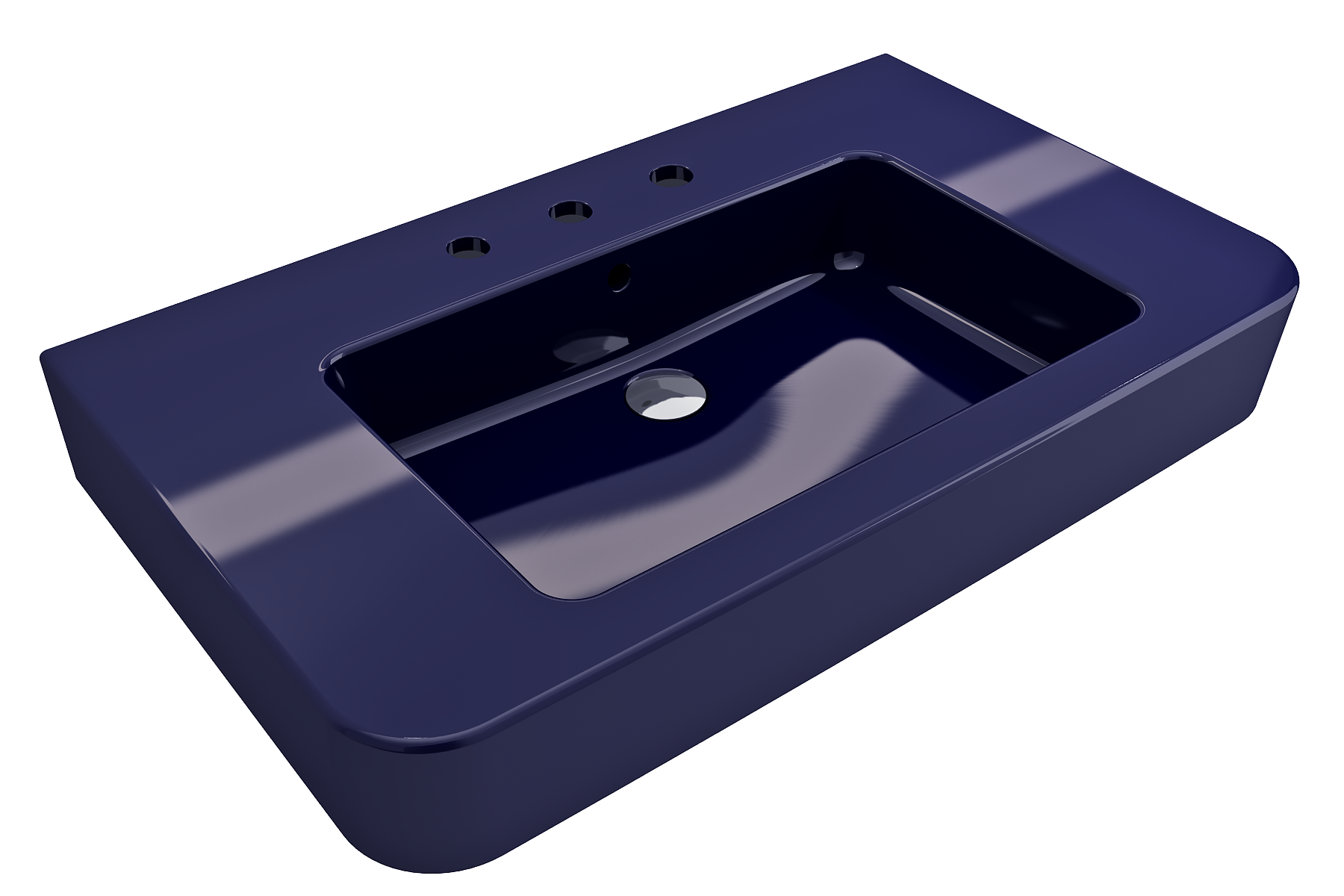 Bathroom sink with 3-hole (8in.) faucet setting. May be wall-hung, used with metal console legs, or counterset.