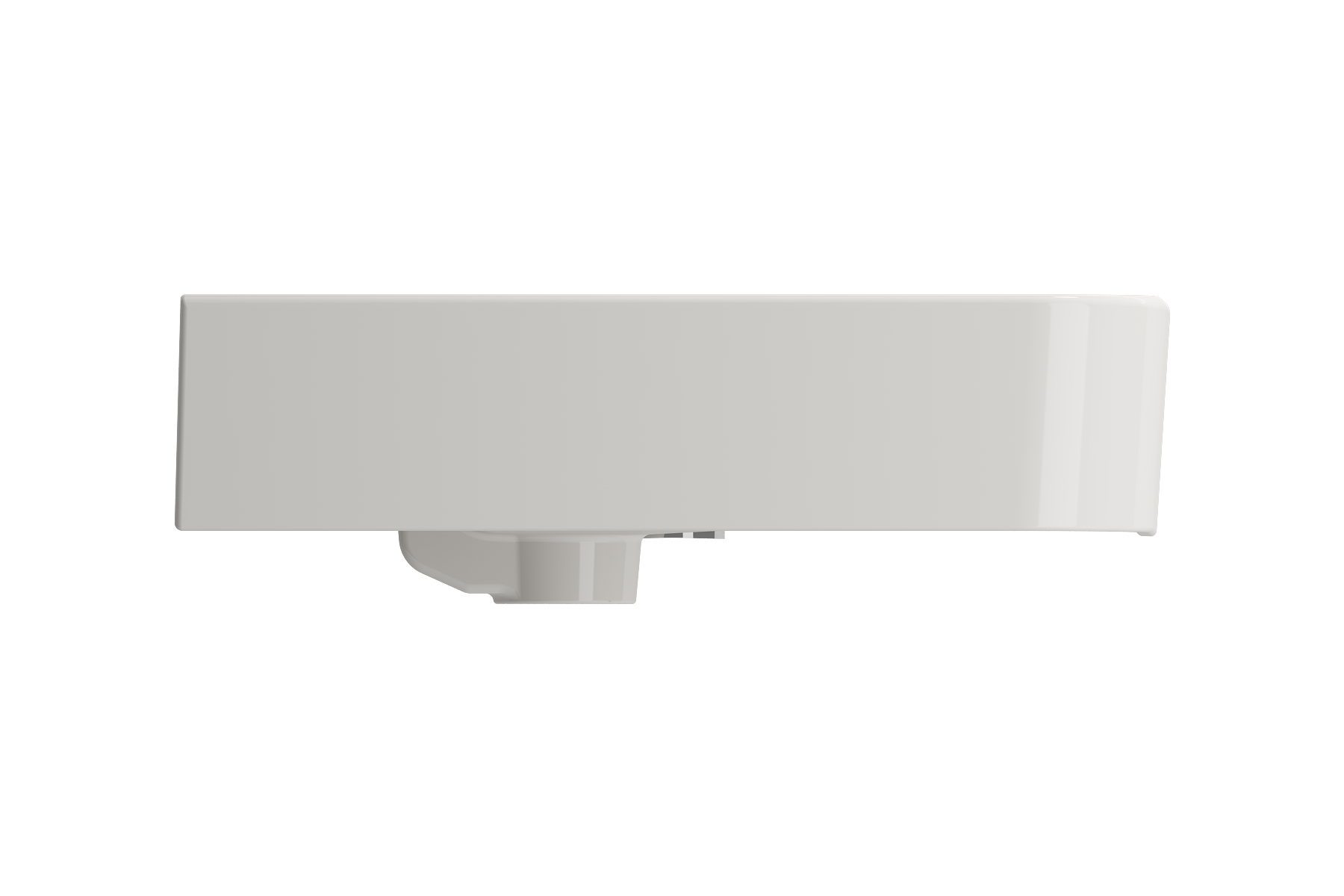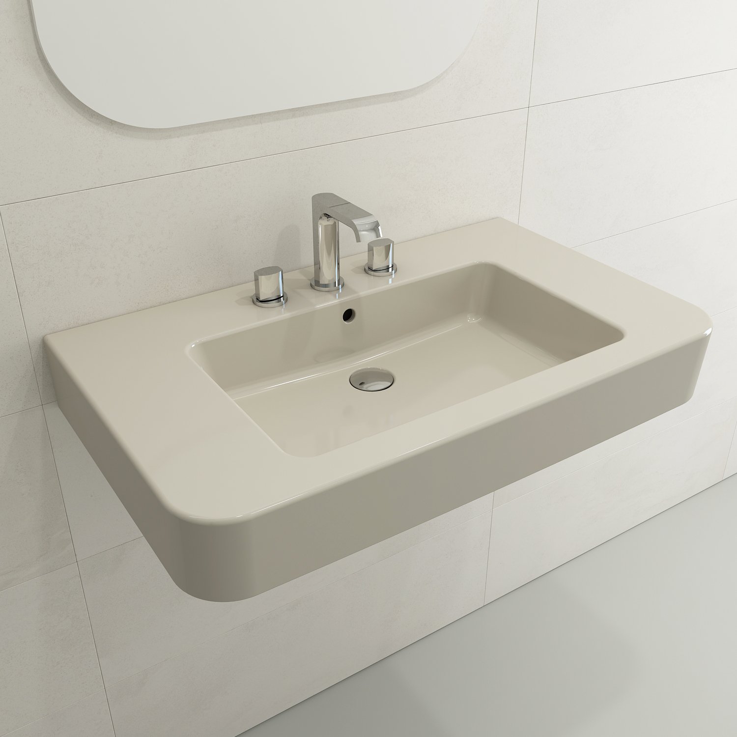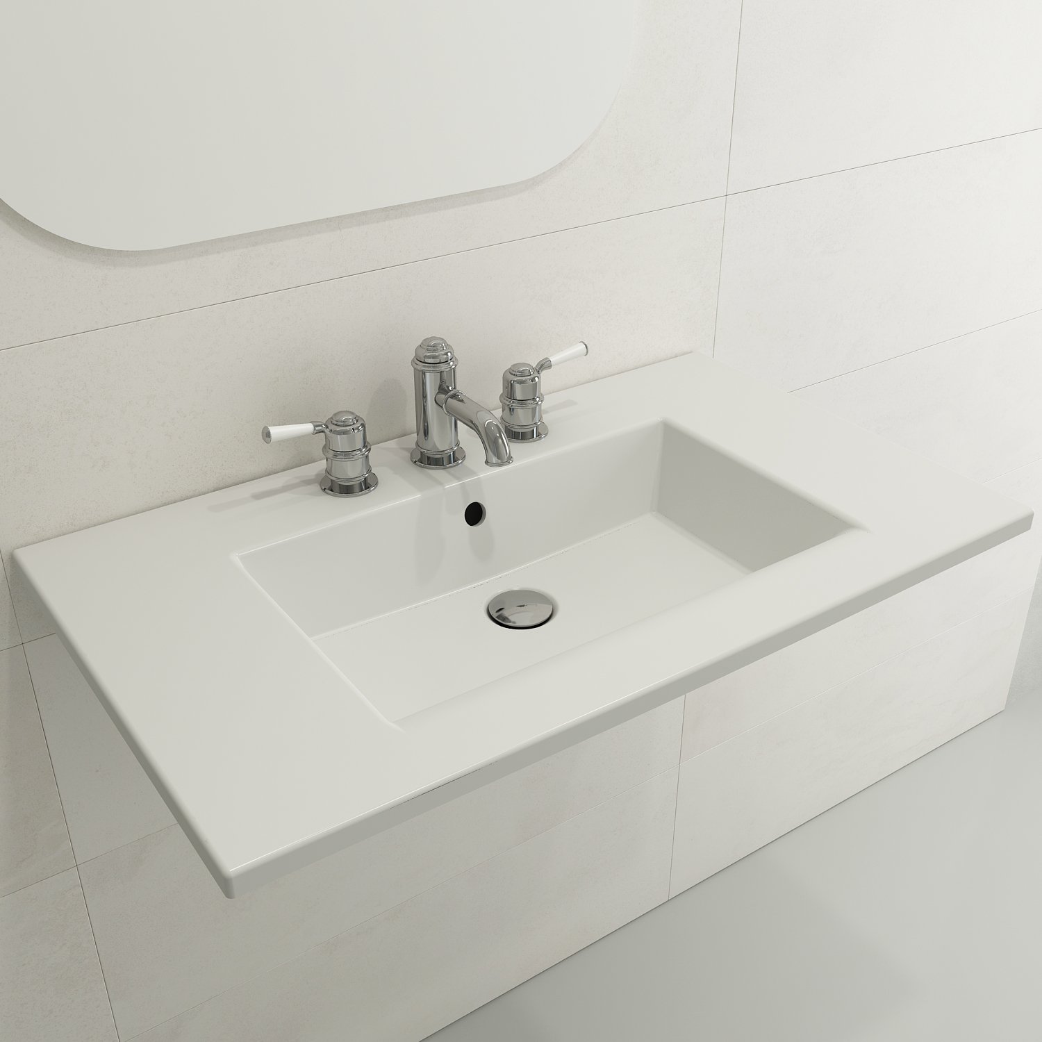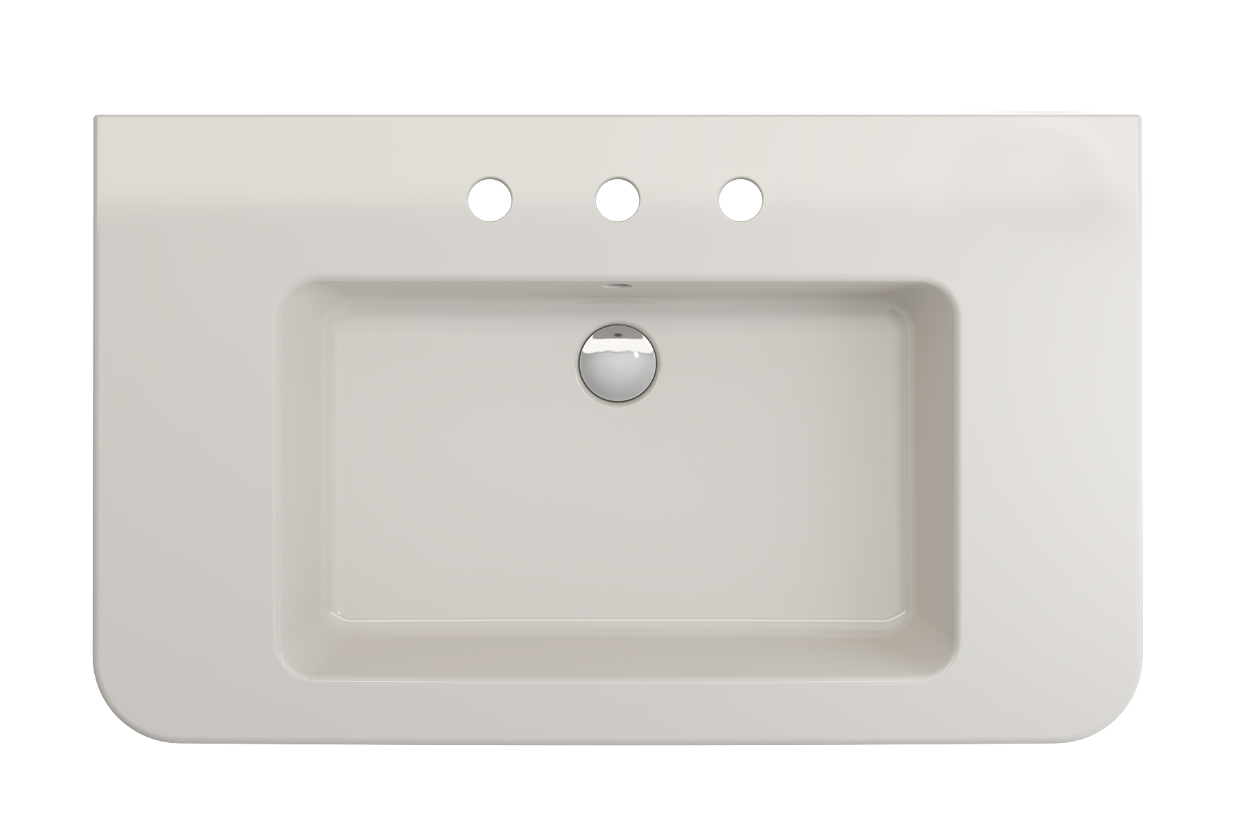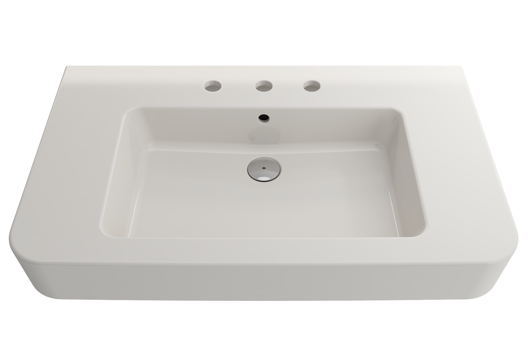 Bathroom sink with 3-hole (8in.) faucet setting. May be wall-hung, used with metal console legs, or counterset.