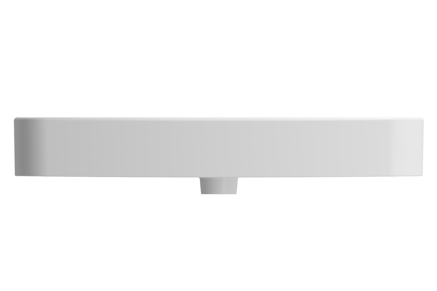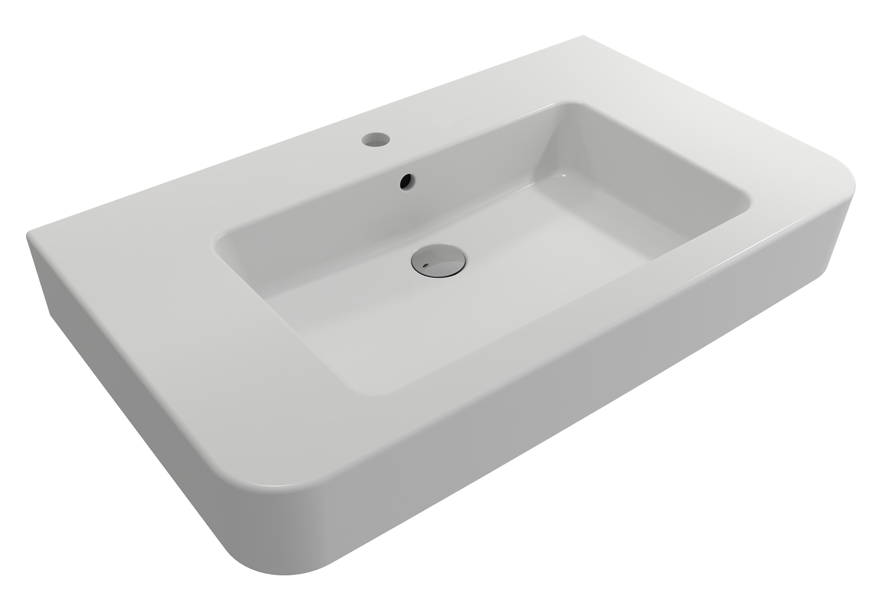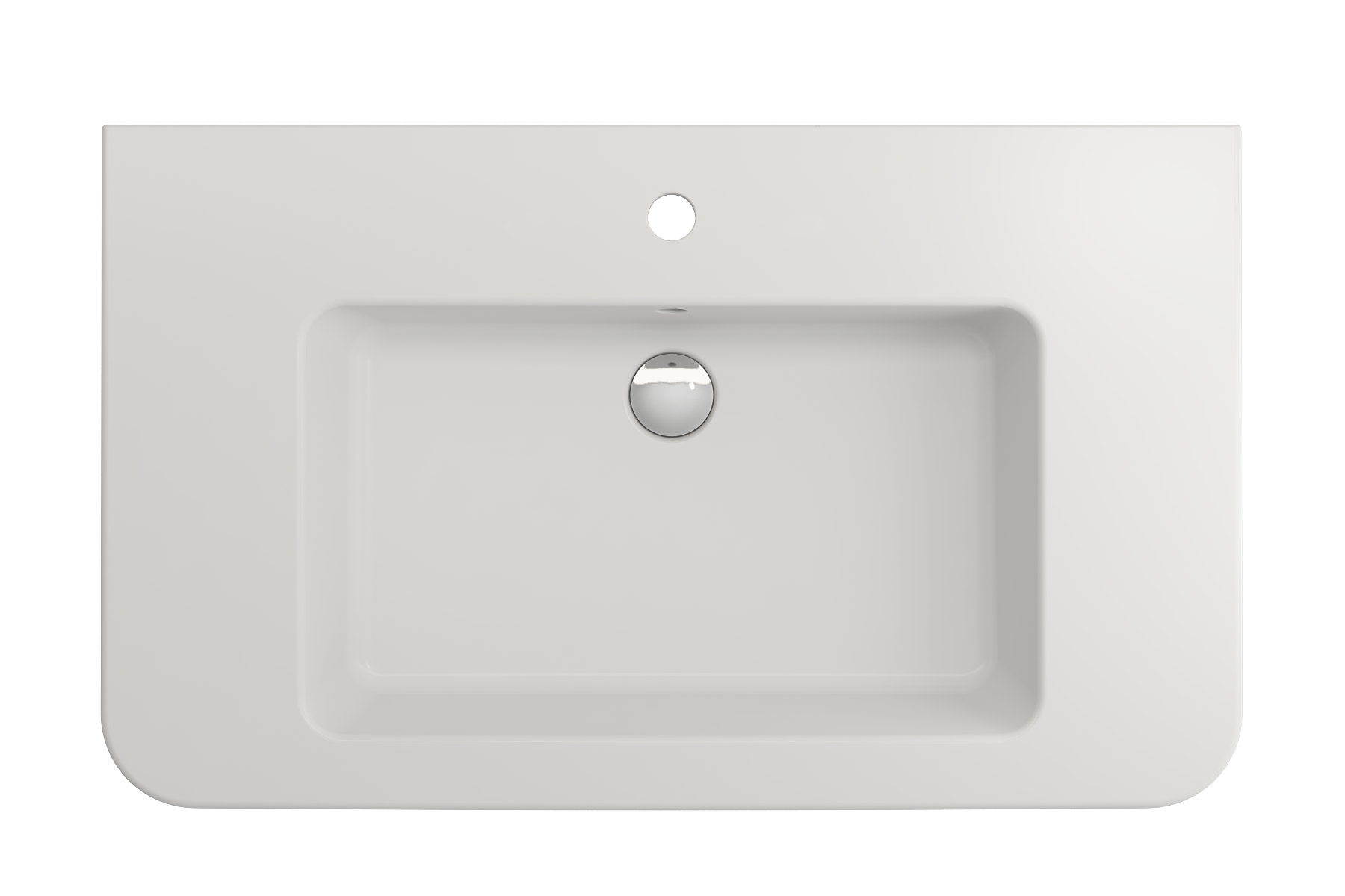 Bathroom sink with single-hole faucet setting. May be wall-hung, used with metal console legs, or counterset.