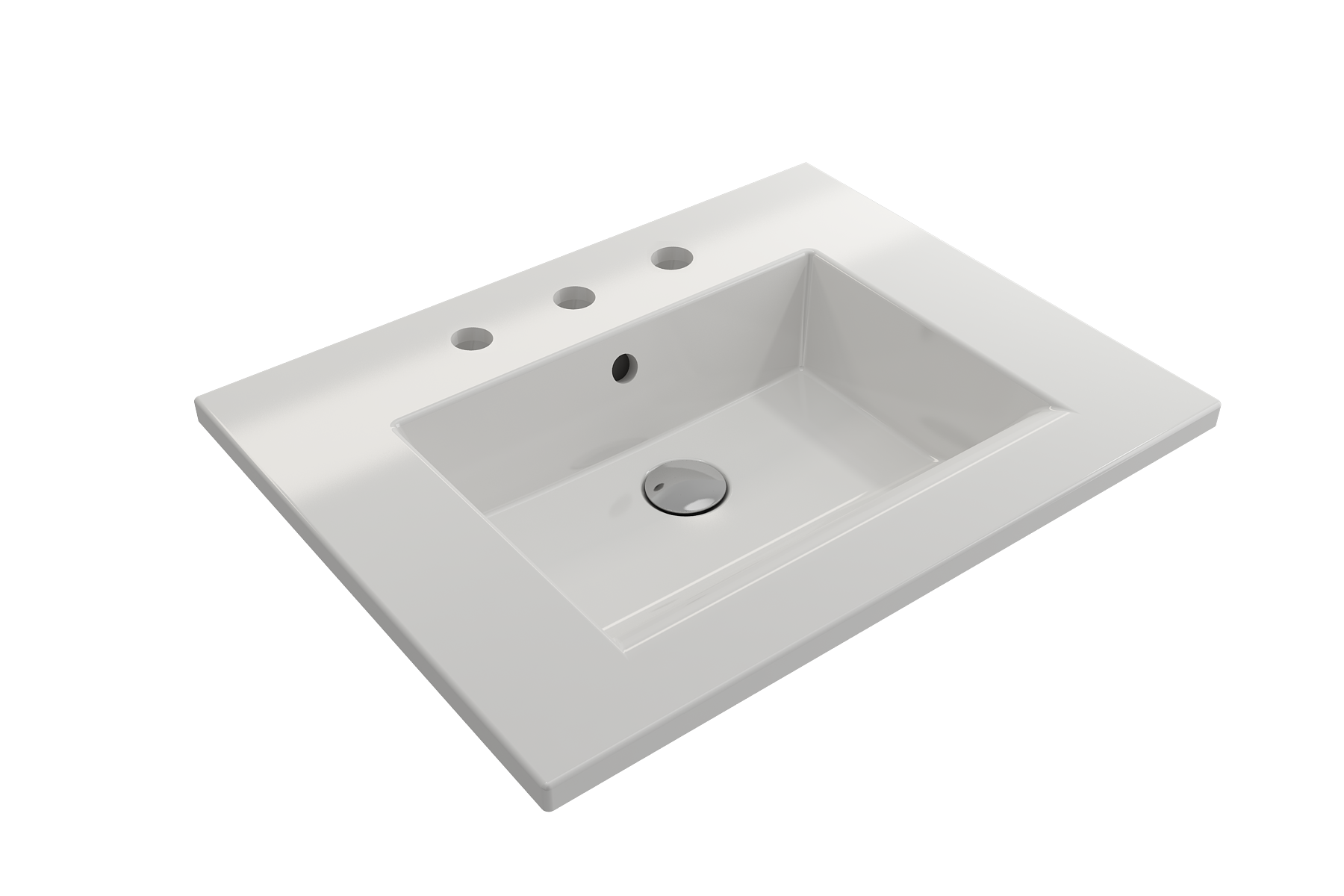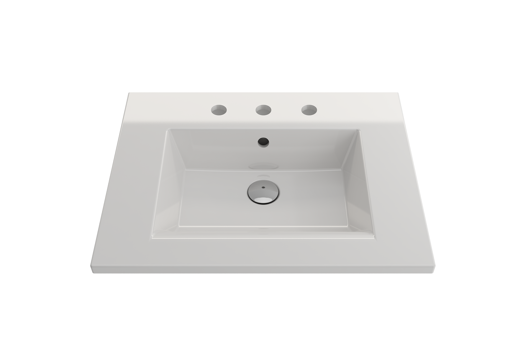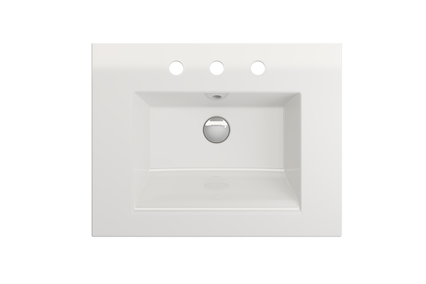 Bathroom sink with 3-hole (8in.) faucet setting. May be wall-hung, used with metal console legs, or semi-recessed into the counter. With overflow.