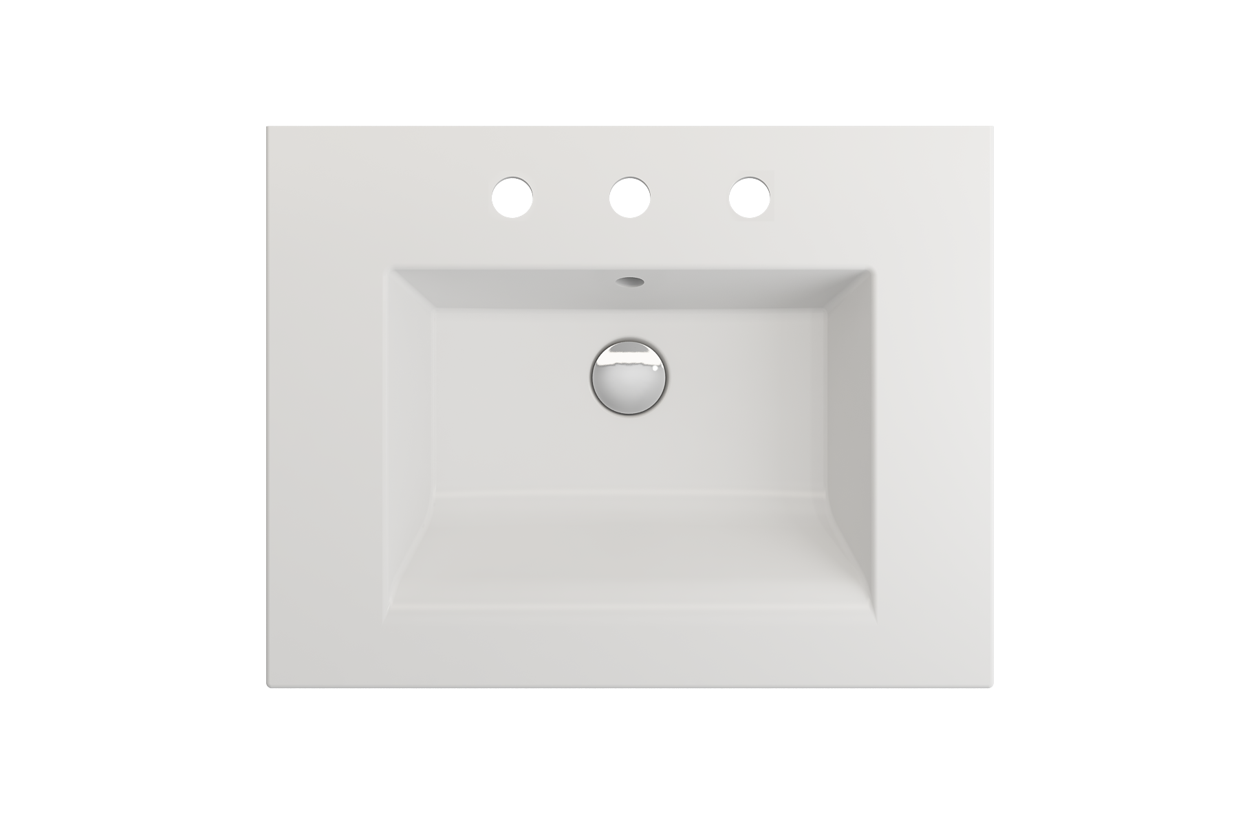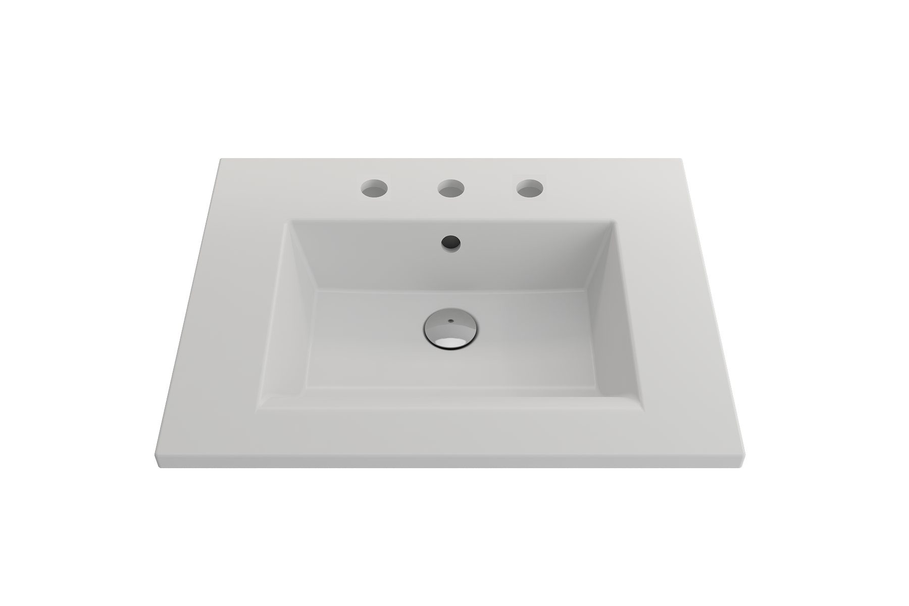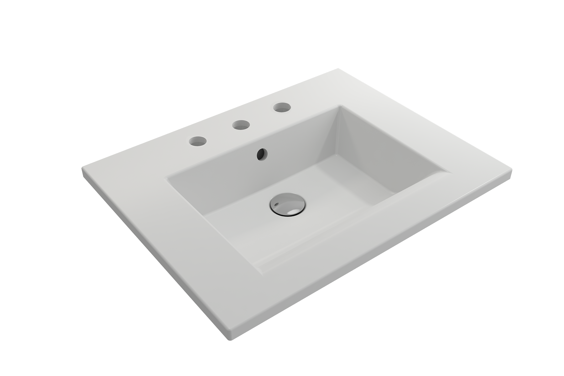 Bathroom sink with 3-hole (8in.) faucet setting. May be wall-hung, used with metal console legs, or semi-recessed into the counter. With overflow.