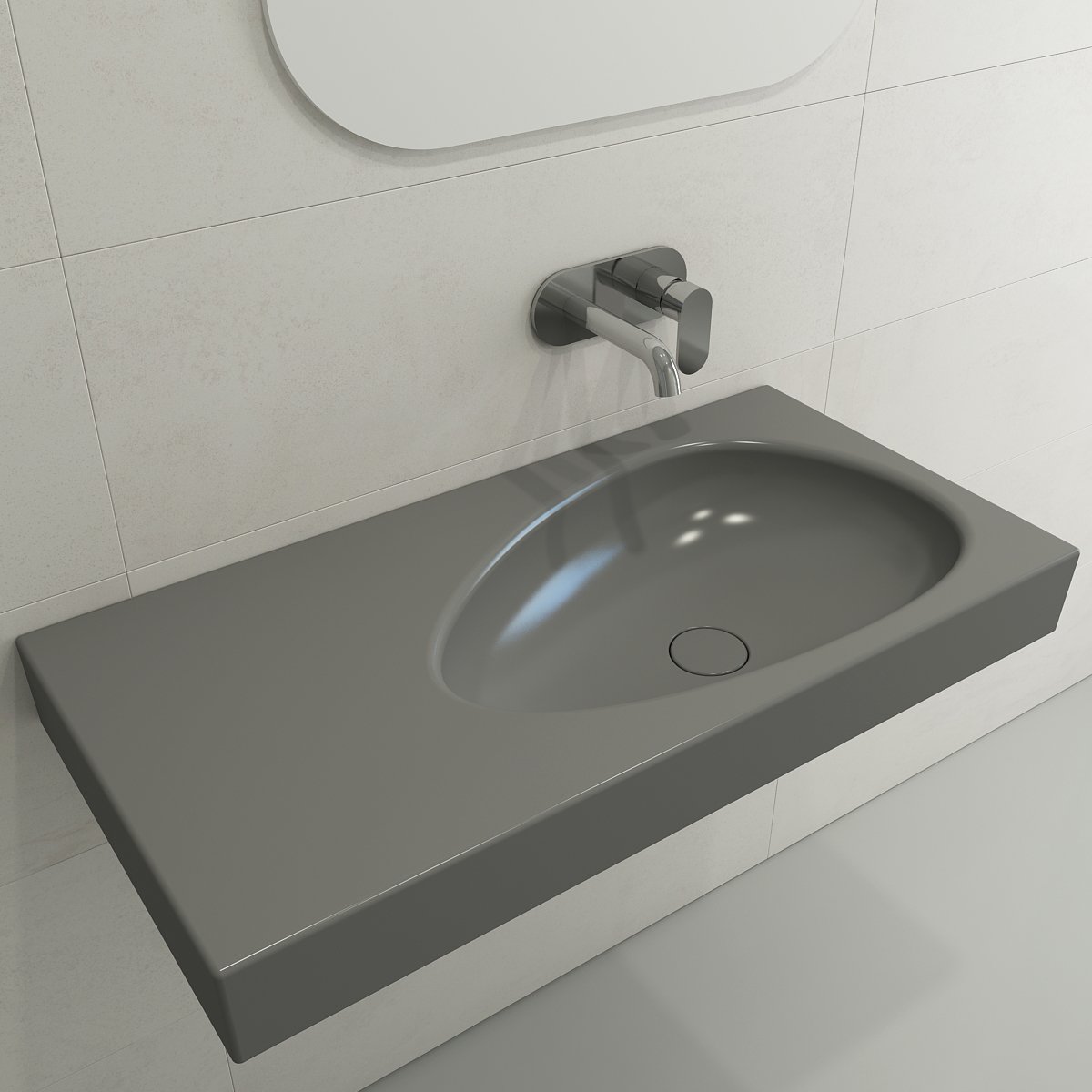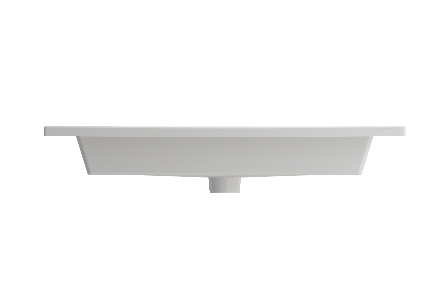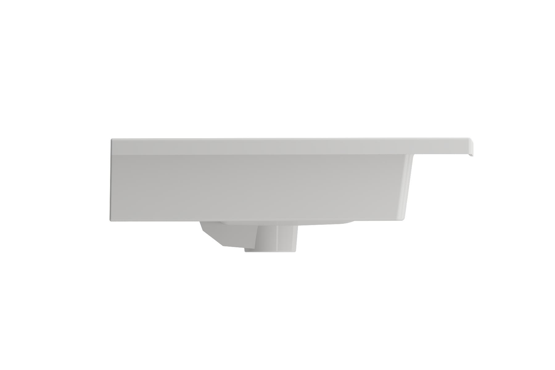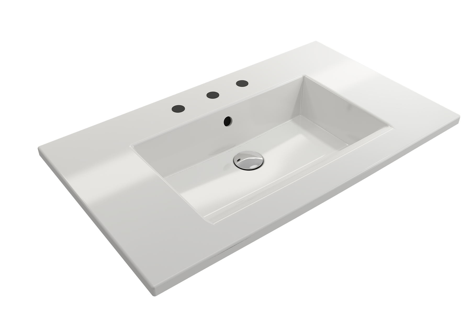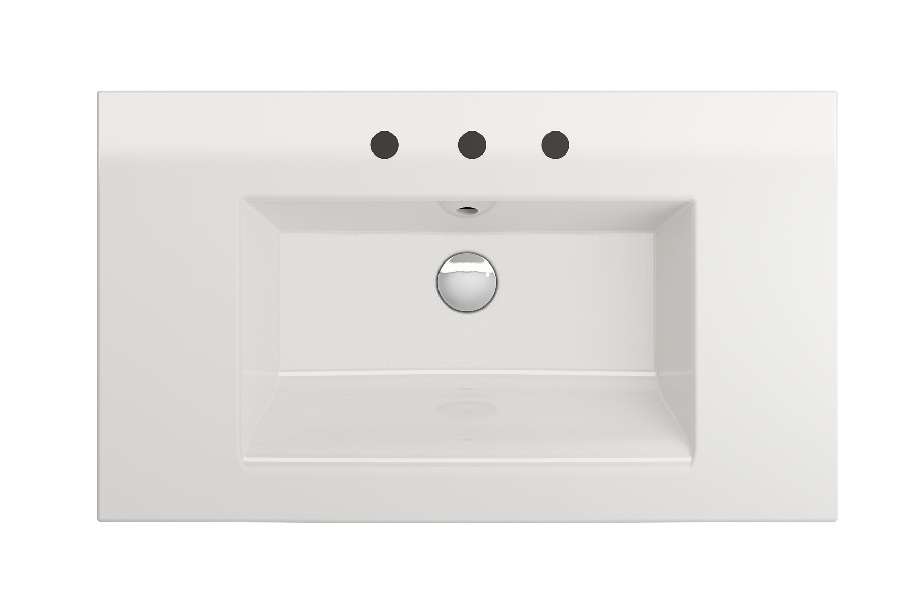 Bathroom sink with 3-hole (8in.) faucet setting. May be wall-hung, used with metal console legs, or semi-recessed into the counter. With overflow.