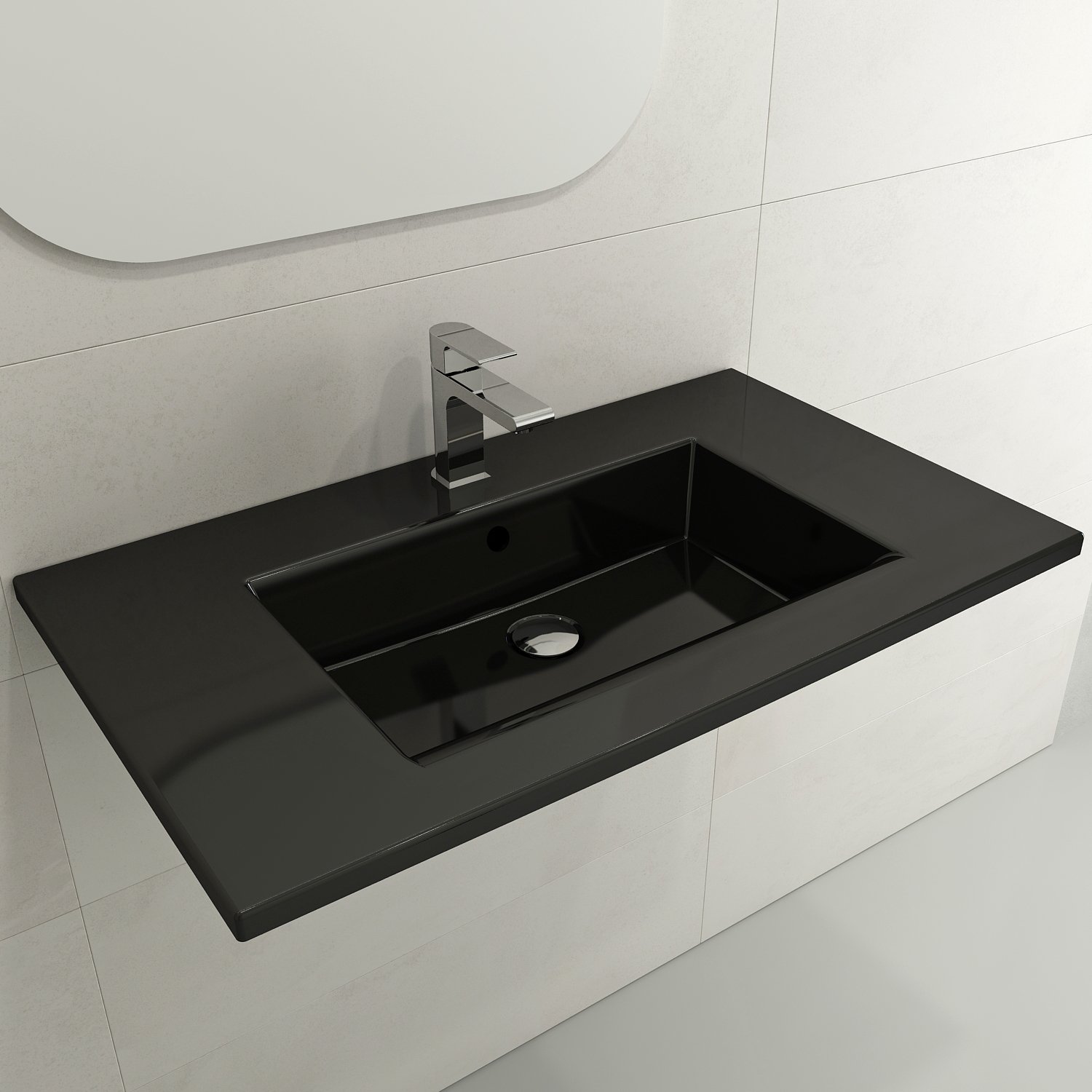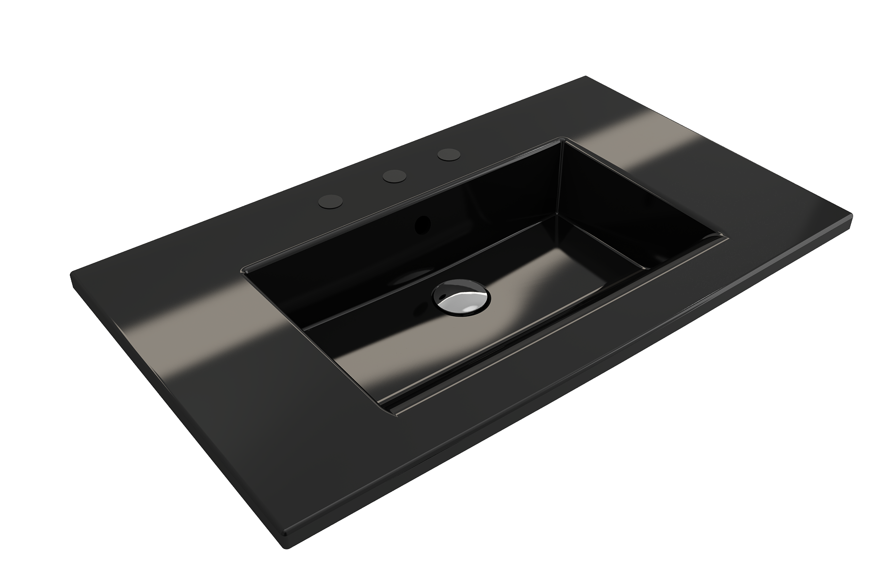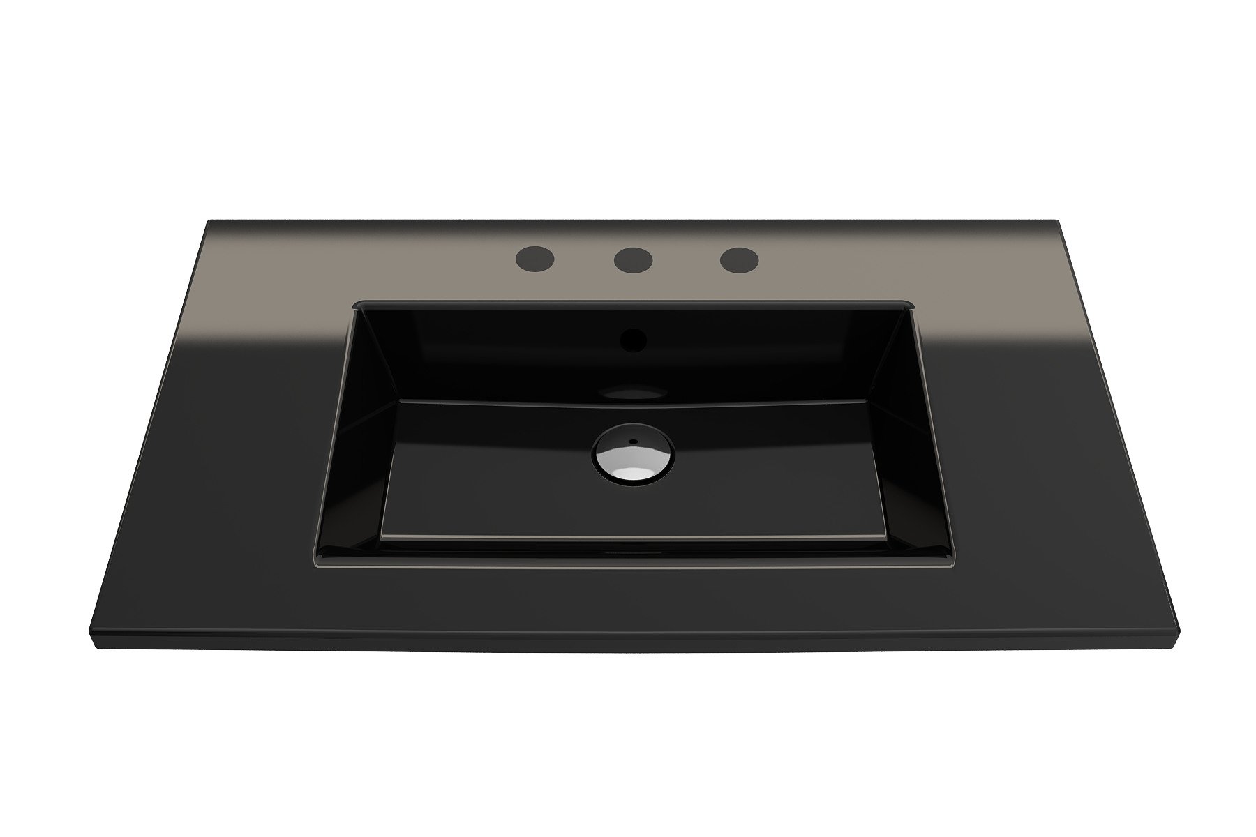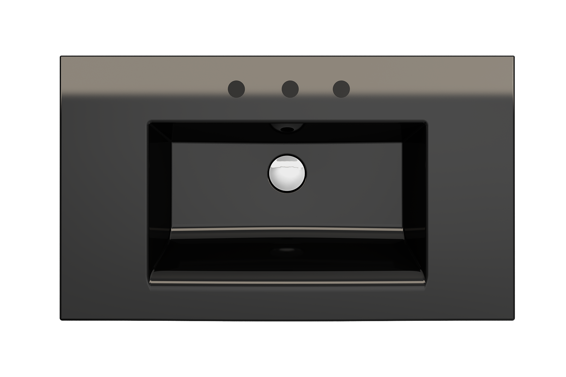 Bathroom sink with 3-hole (8in.) faucet setting. May be wall-hung, used with metal console legs, or semi-recessed into the counter. With overflow.