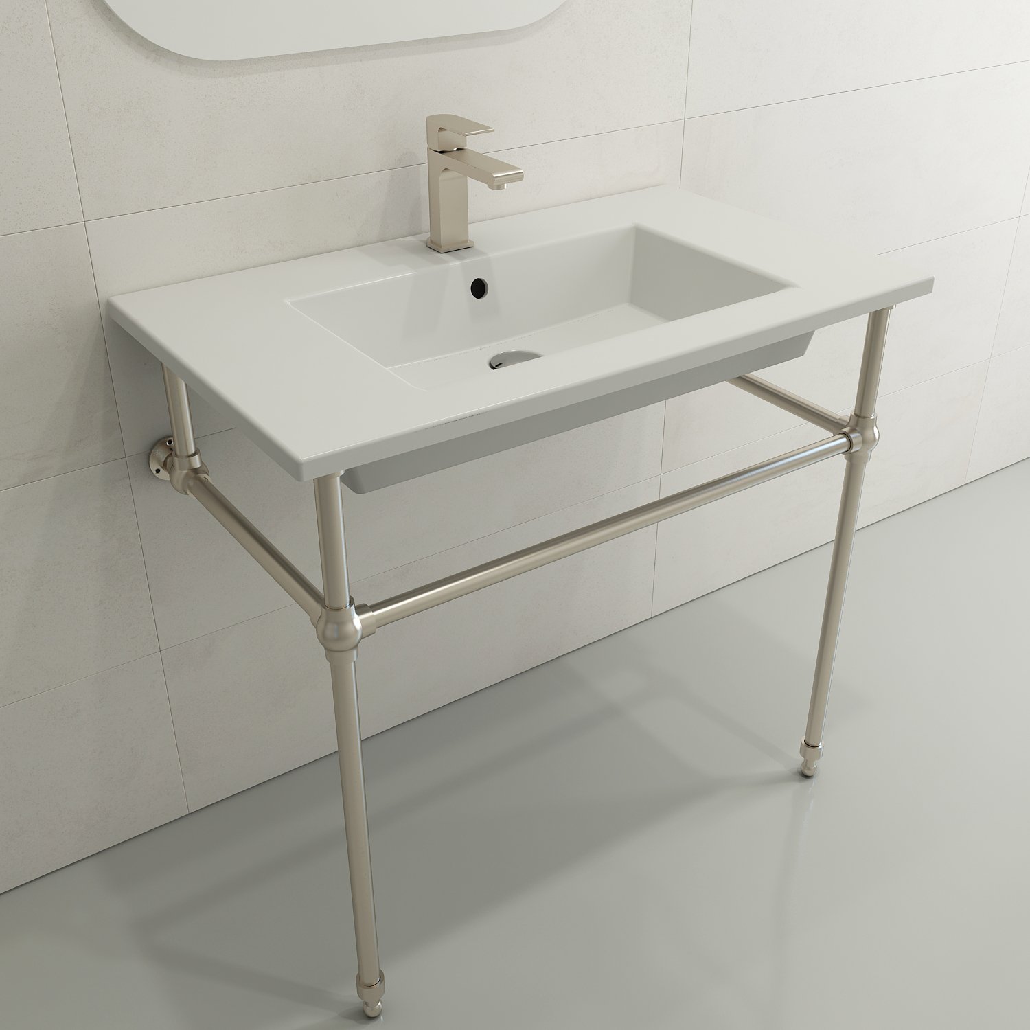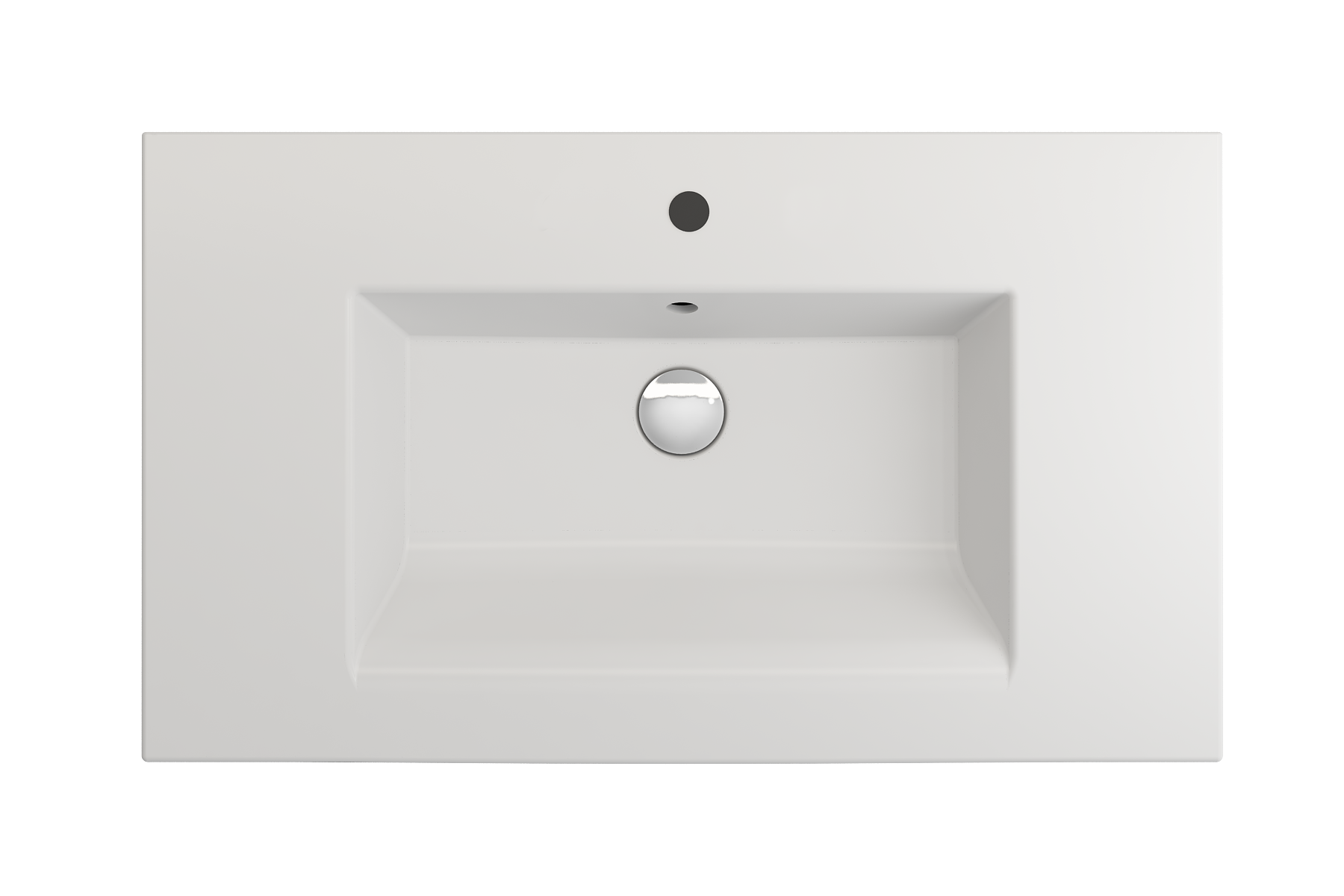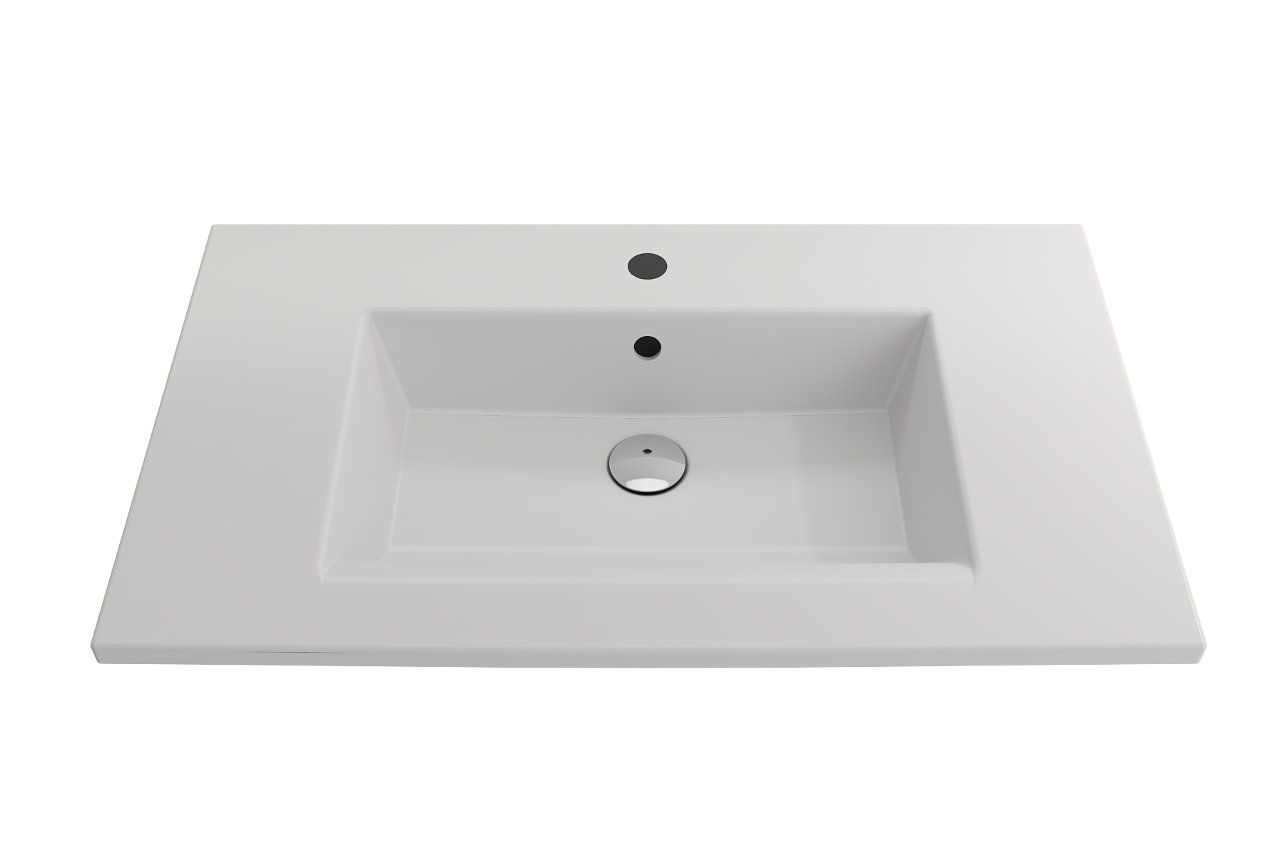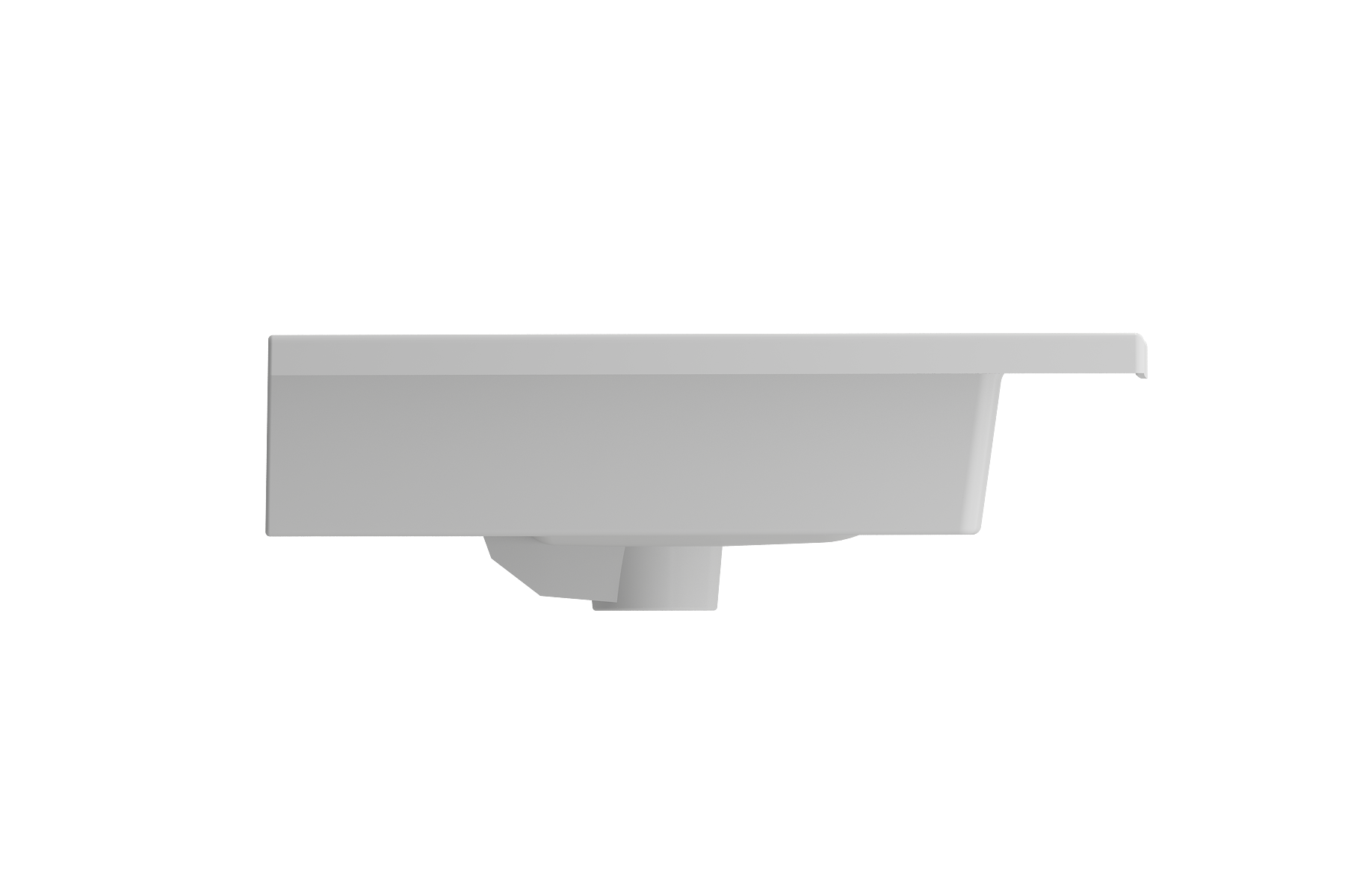 Bathroom sink with single-hole faucet setting. May be wall-hung, used with metal console legs, or semi-recessed into the counter. With overflow.