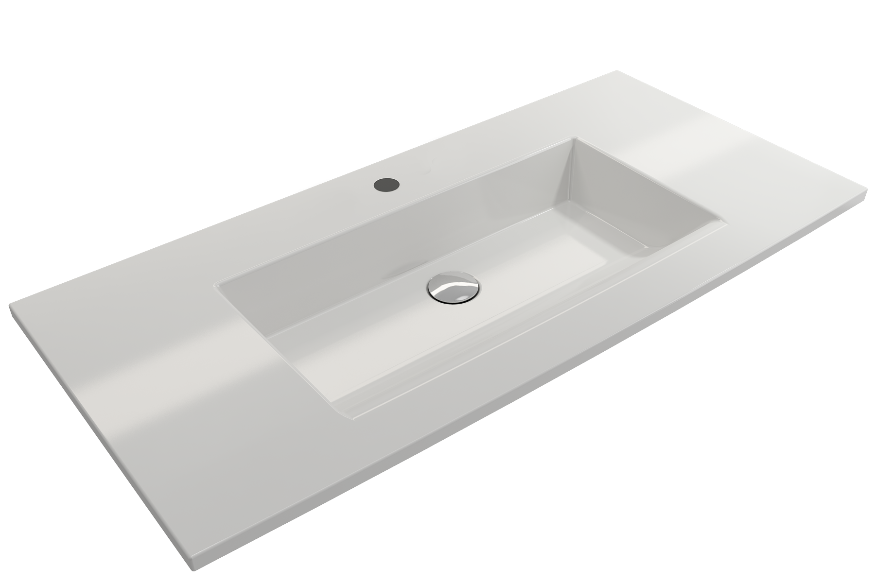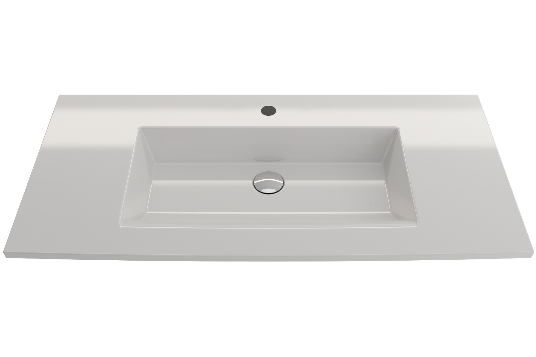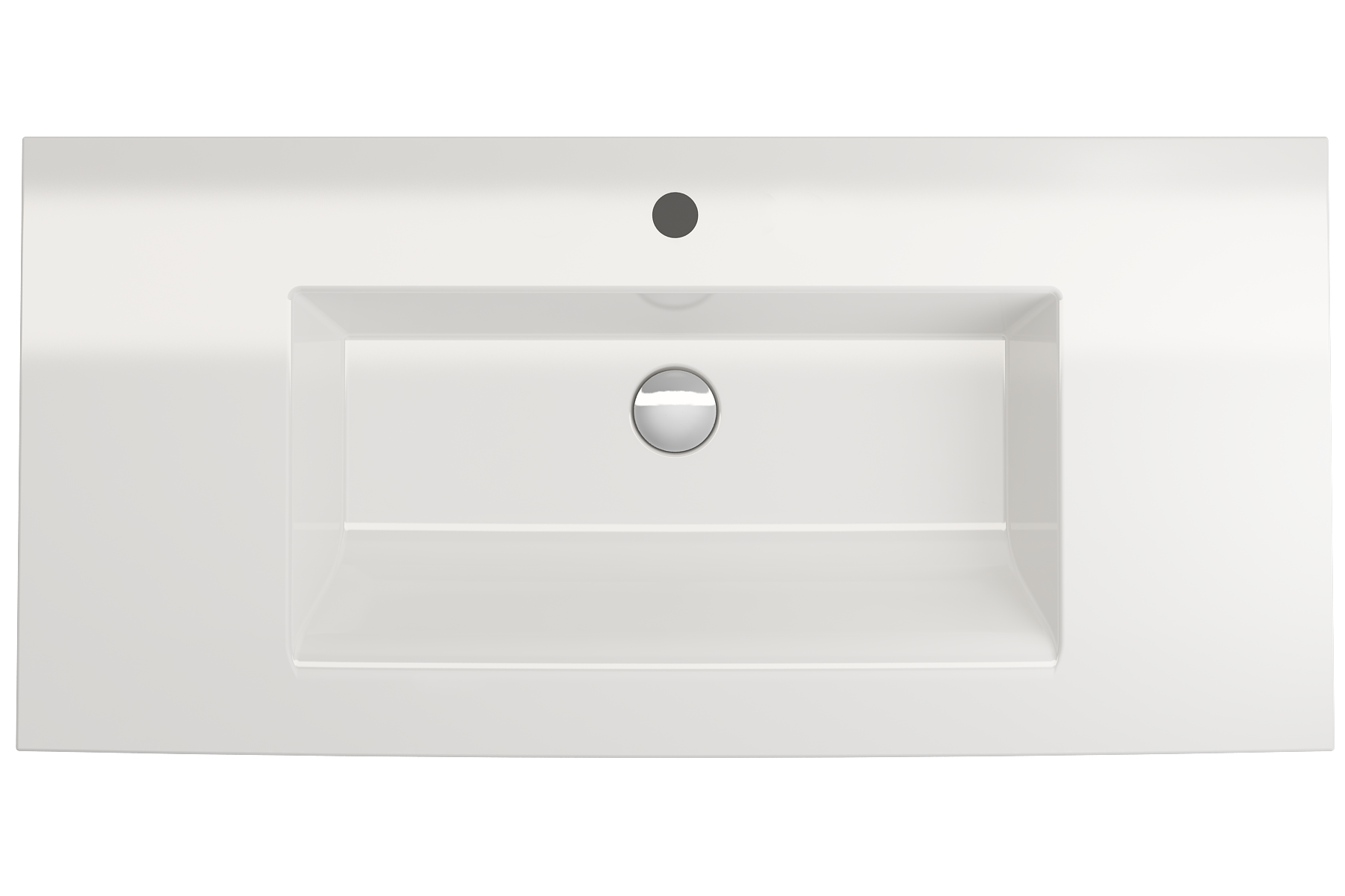 Bathroom sink with single-hole faucet setting. May be wall-hung, used with metal console legs, or semi-recessed into the counter. With overflow.