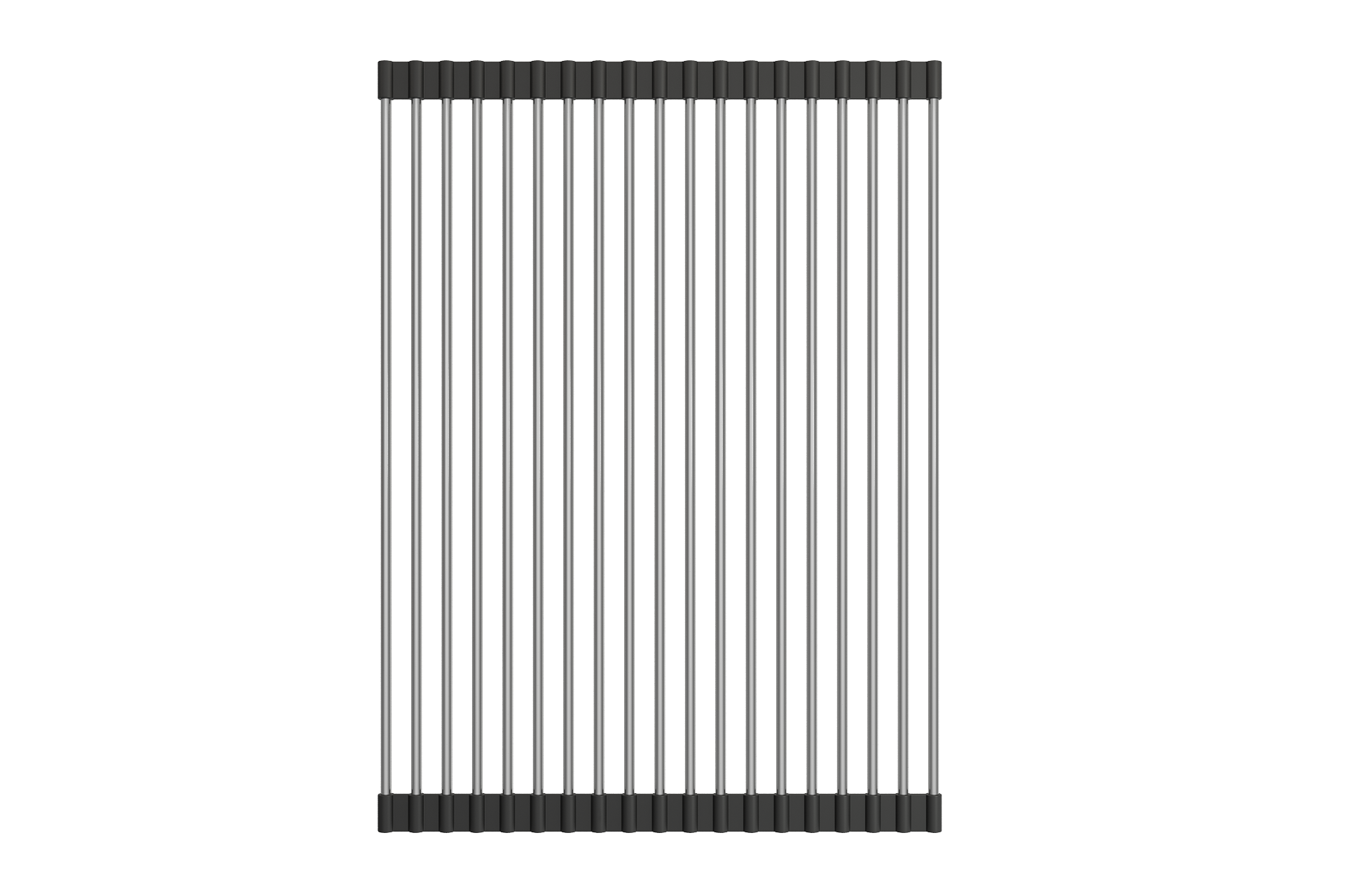 BOCCHI Roller Mat made of durable stainless steel rods with a flexible rubber edging allows for easy rolling motion to lay our, or roll-up for storage. Extreme resistance to heat makes this idea for use under hot pots and pans, or as a water strainer for wet dishes. May be used directly on the counter, or suspended over select BOCCHI Sinks.