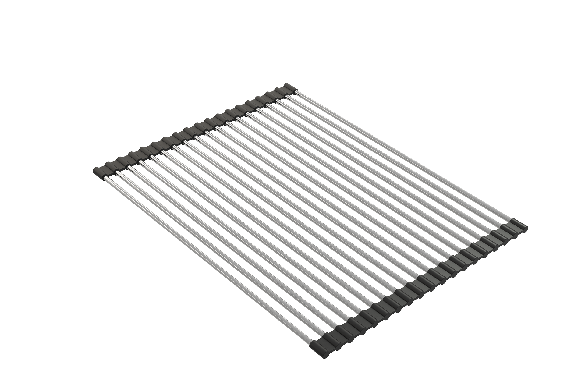 BOCCHI Roller Mat made of durable stainless steel rods with a flexible rubber edging allows for easy rolling motion to lay our, or roll-up for storage. Extreme resistance to heat makes this idea for use under hot pots and pans, or as a water strainer for wet dishes. May be used directly on the counter, or suspended over select BOCCHI Sinks.