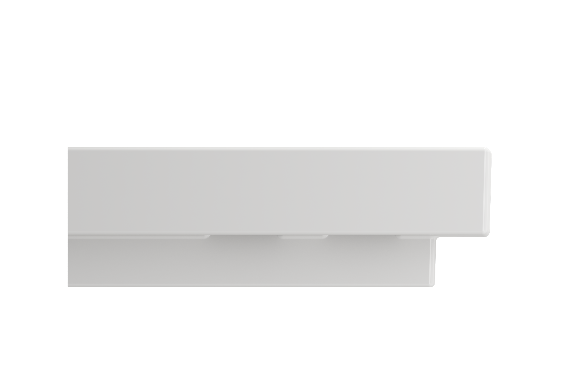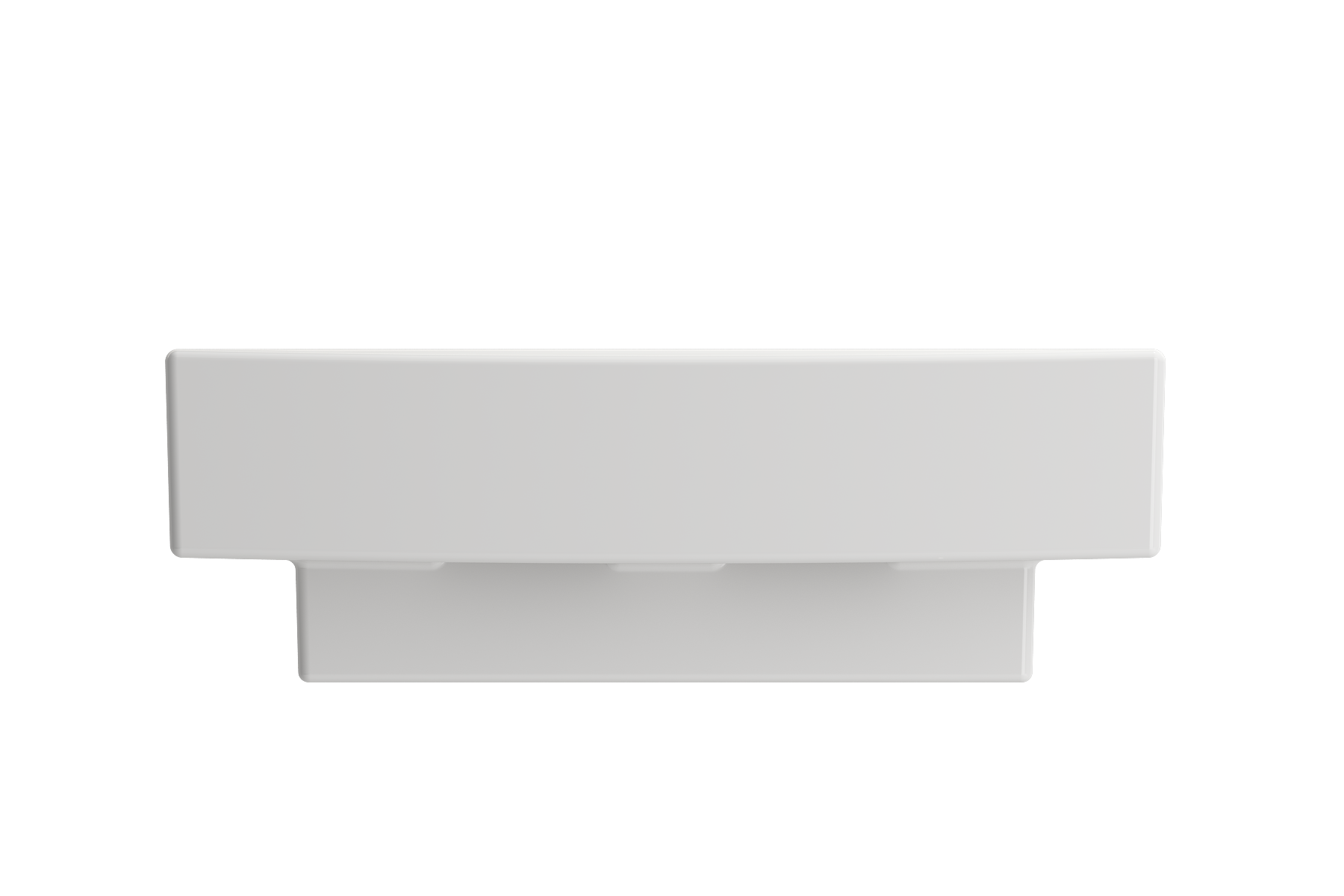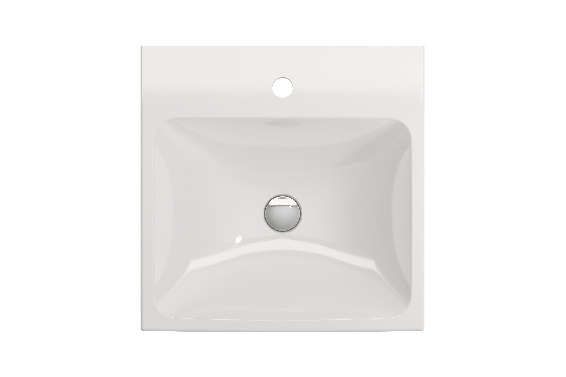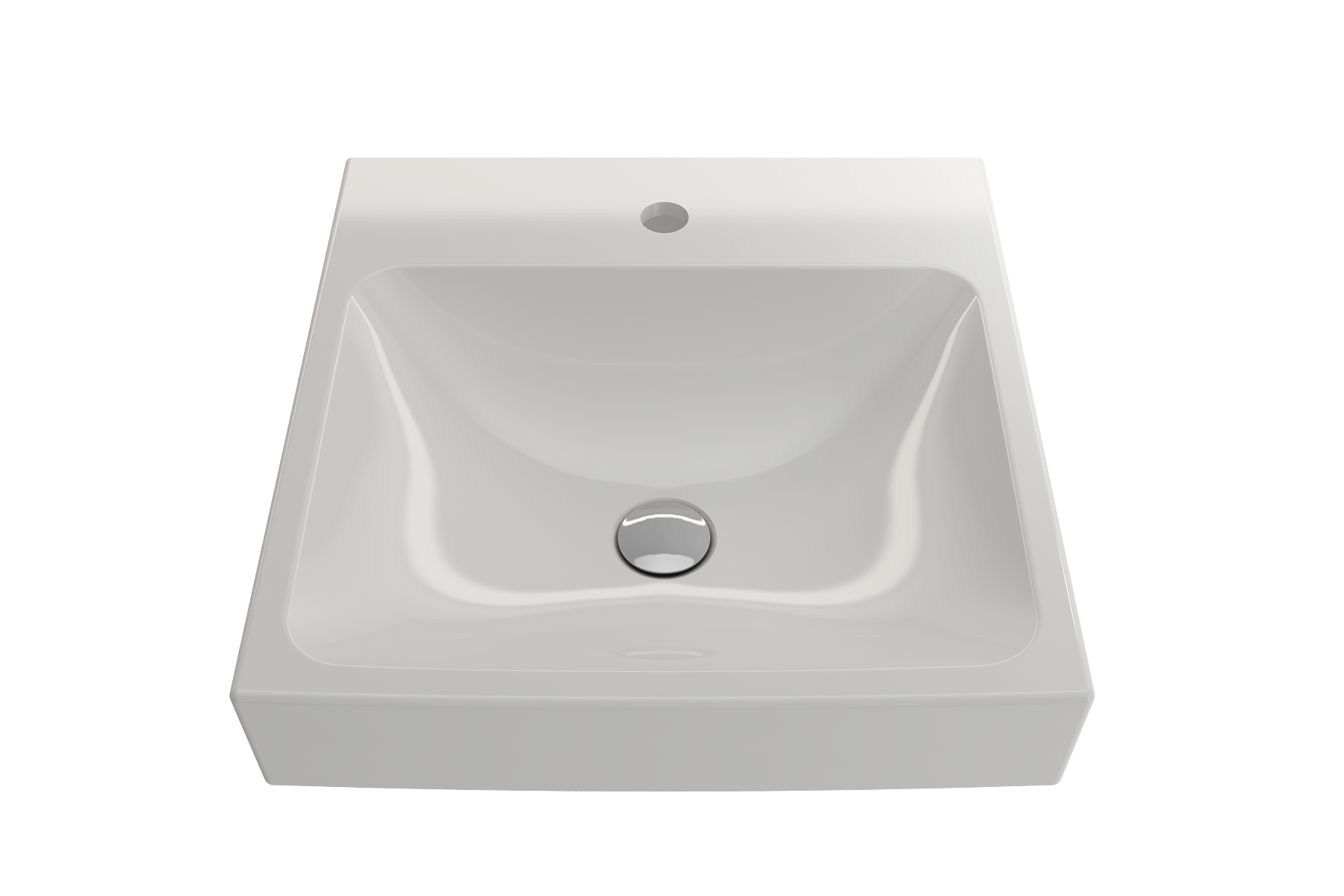 Bathroom sink with single-hole faucet setting. May be wall-hung, used with metal console legs, or semi-recessed into the counter.