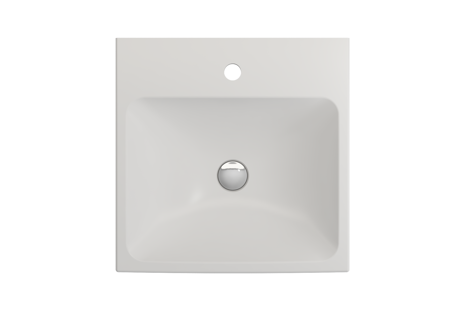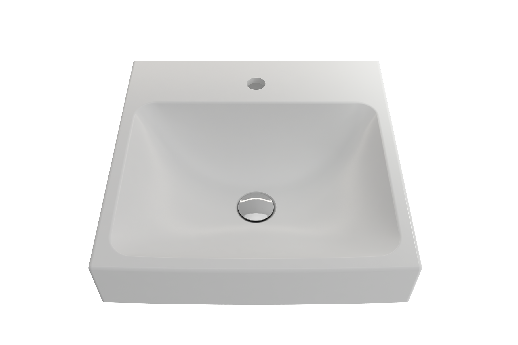 Bathroom sink with single-hole faucet setting. May be wall-hung, used with metal console legs, or semi-recessed into the counter.