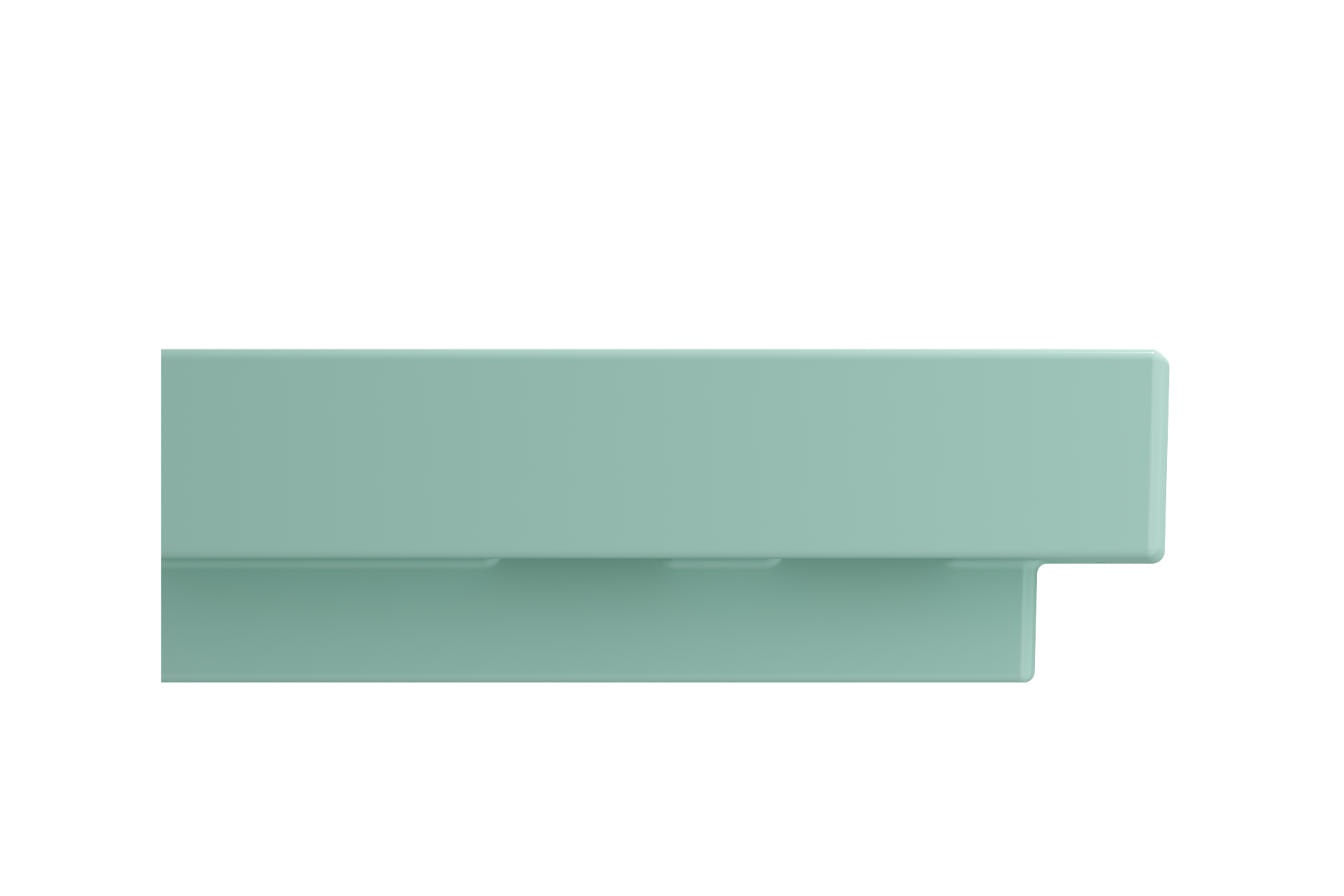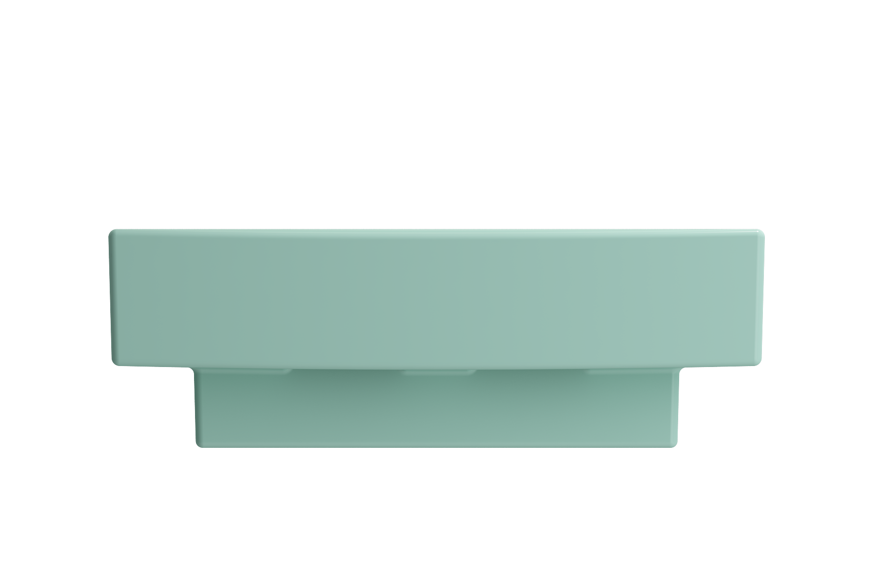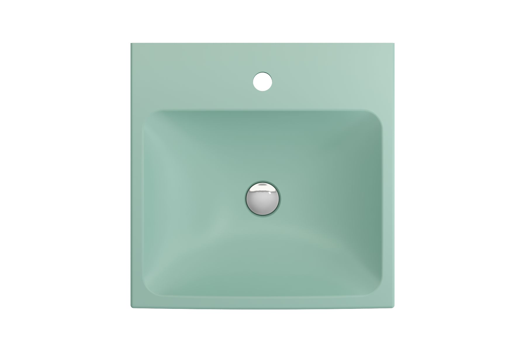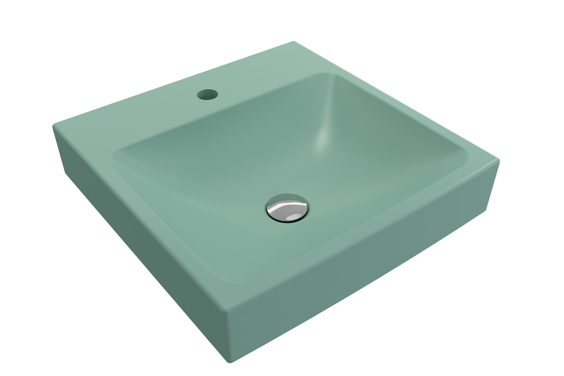 Bathroom sink with single-hole faucet setting. May be wall-hung, used with metal console legs, or semi-recessed into the counter.