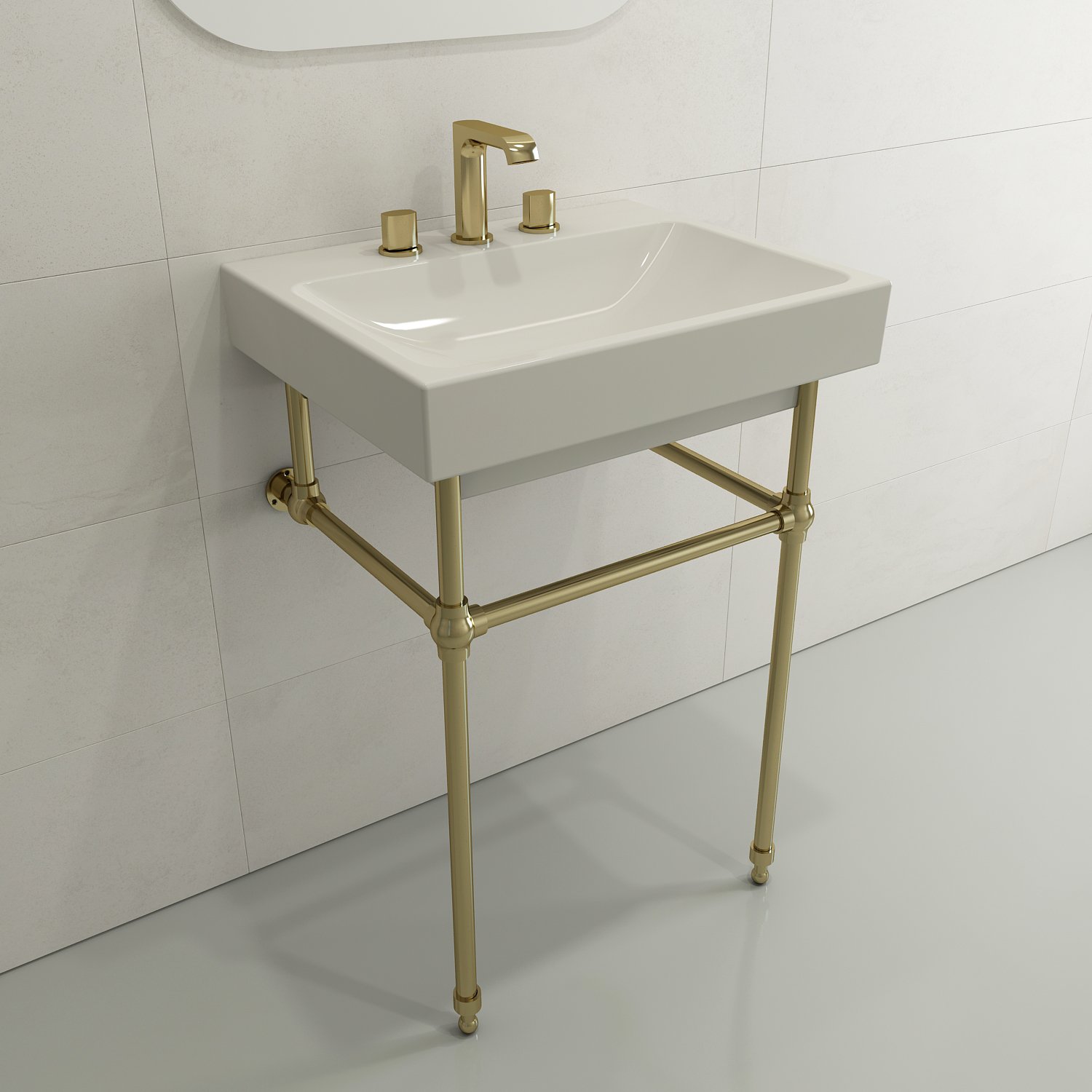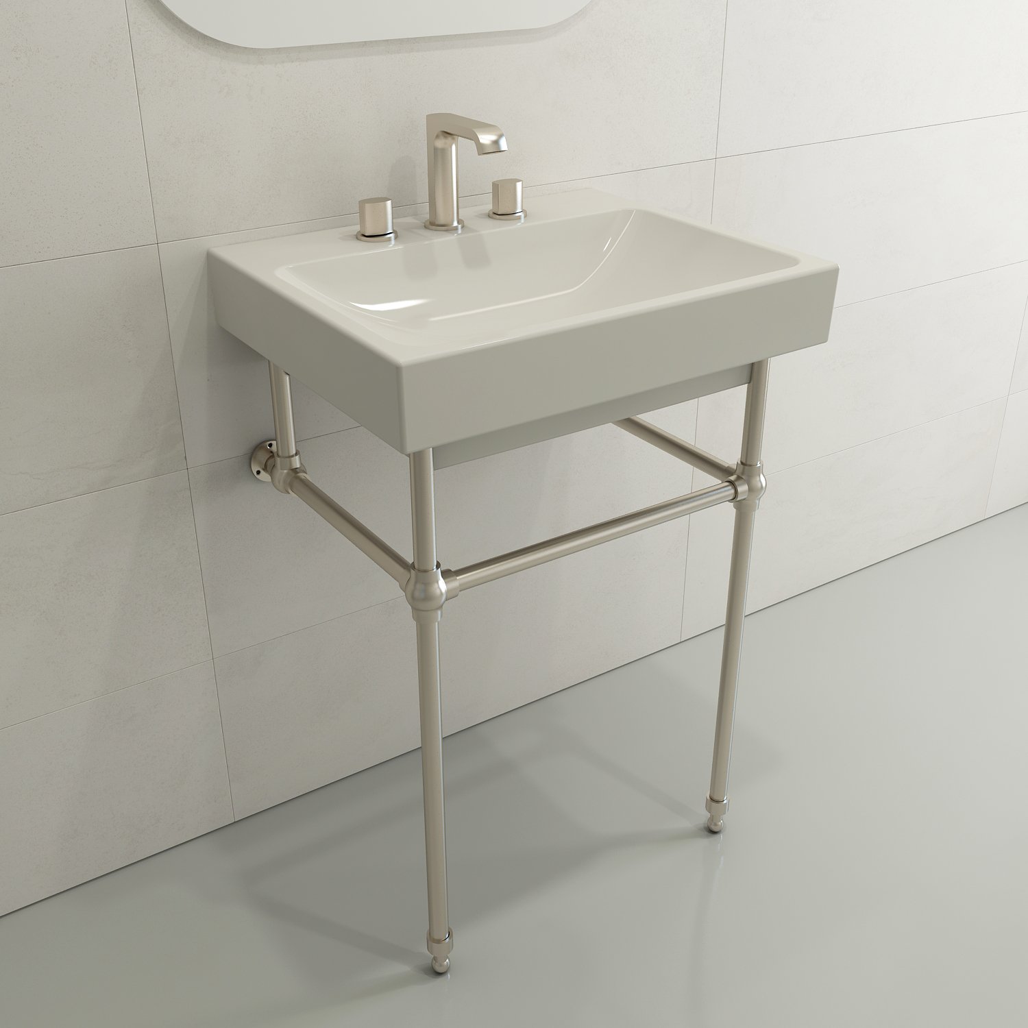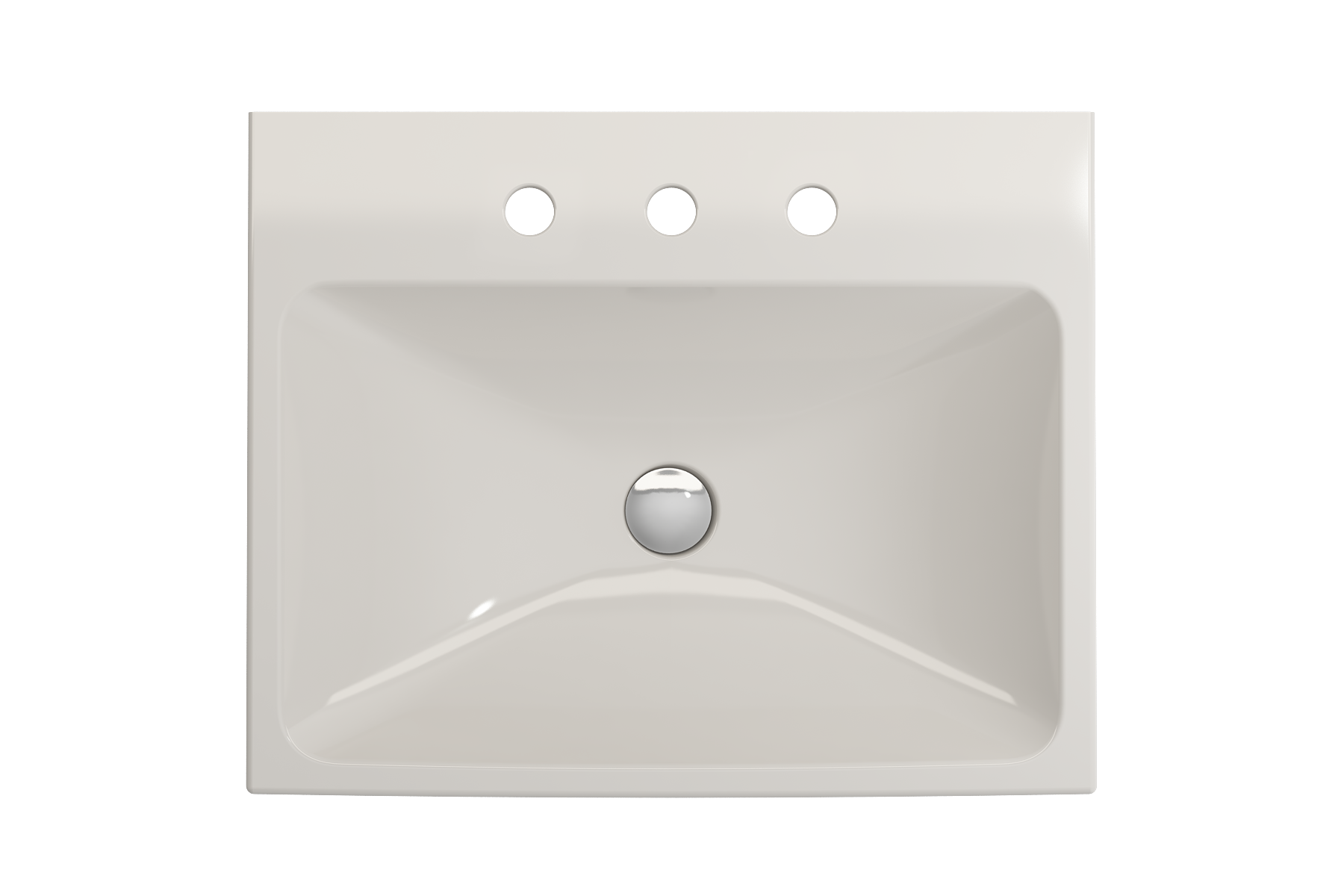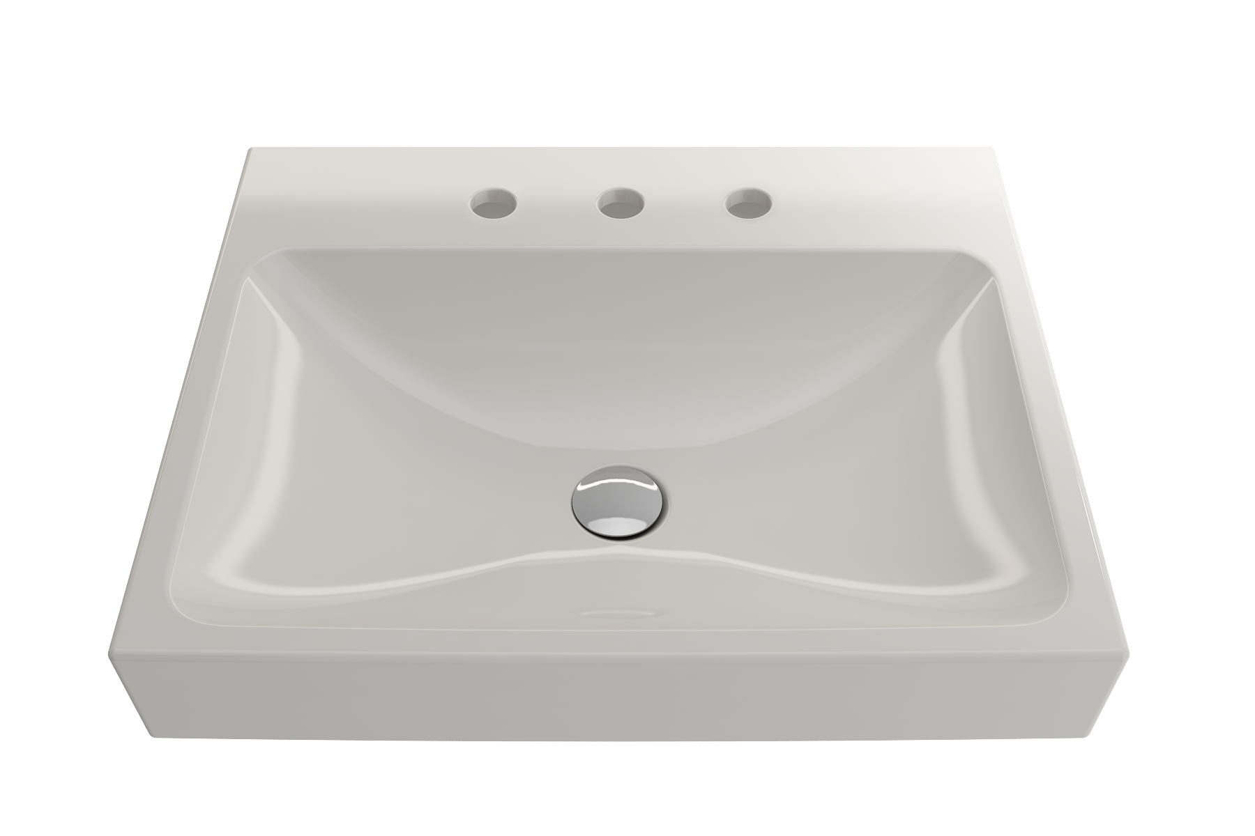Bathroom sink with 3-hole (8in.) faucet setting. May be wall-hung, used with metal console legs, or semi-recessed into the counter.