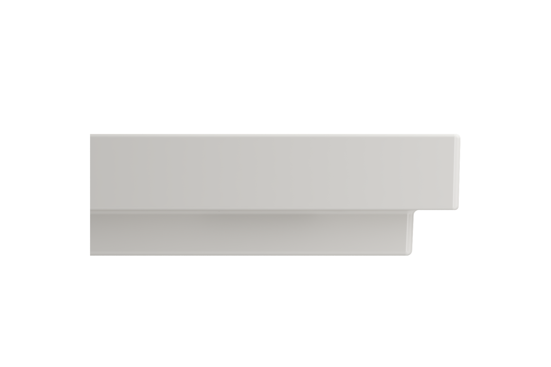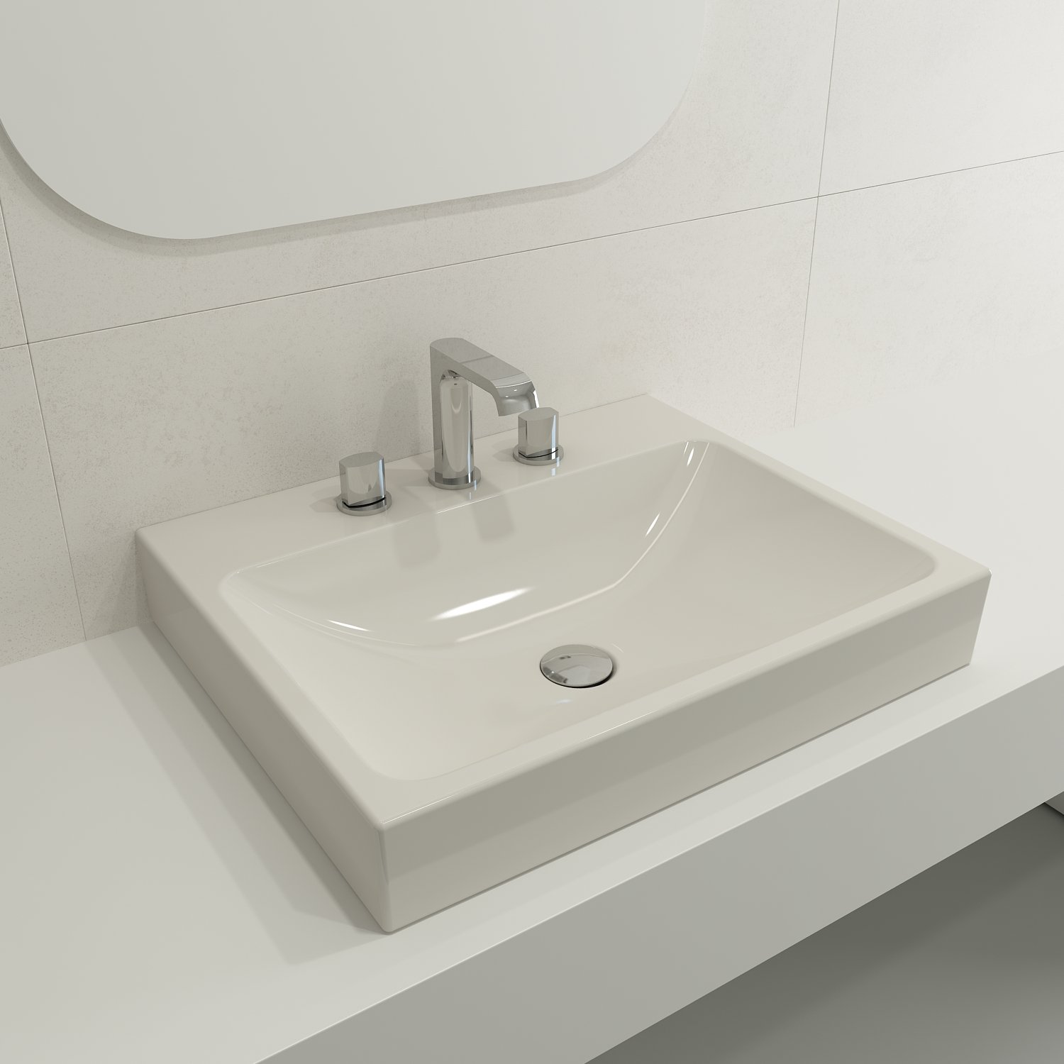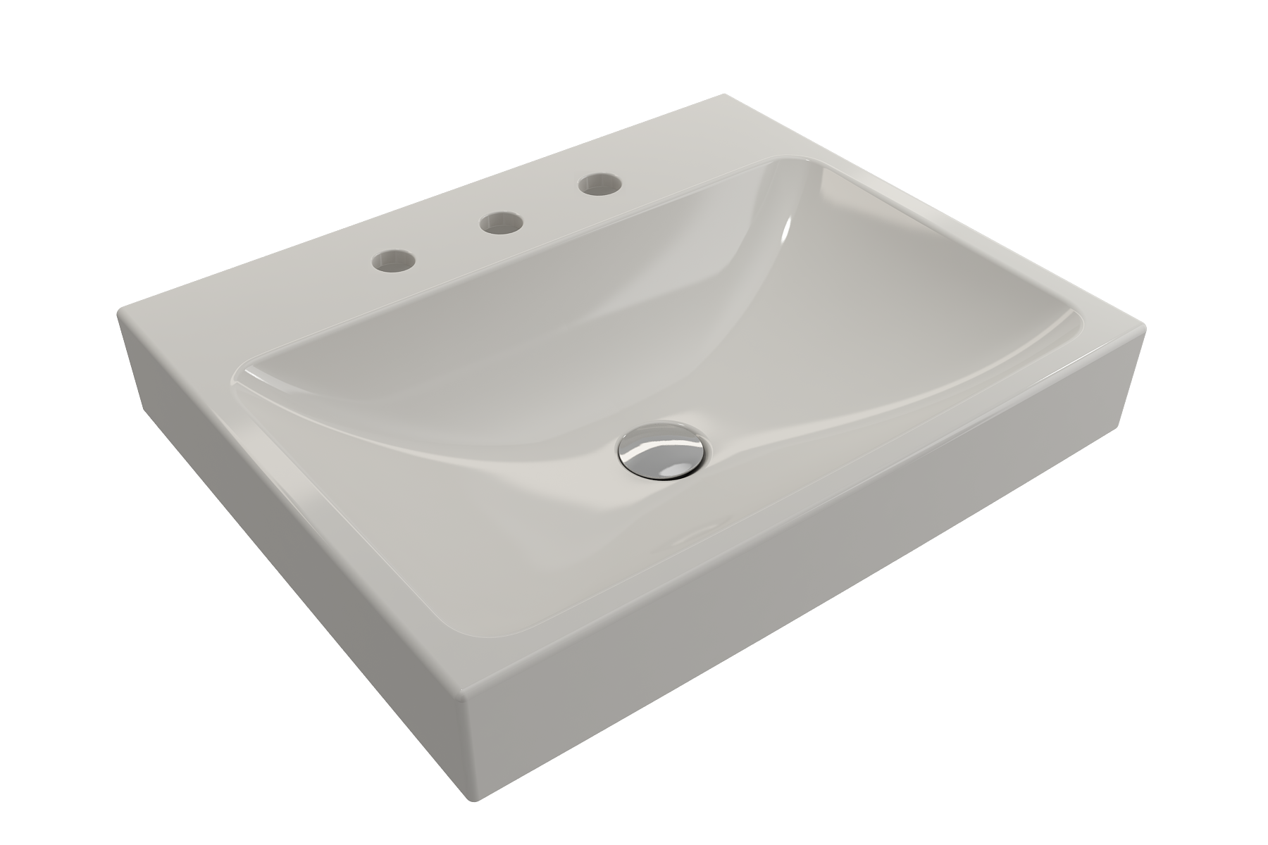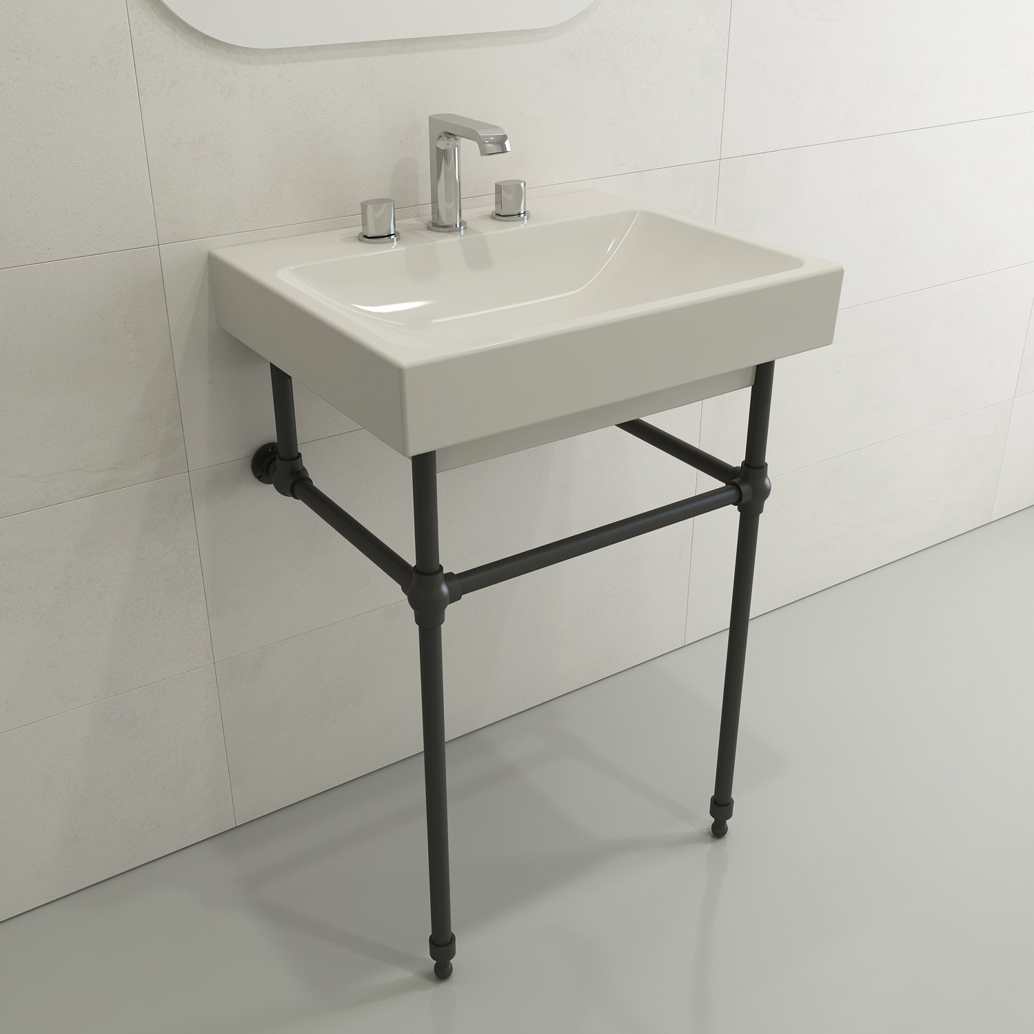 Bathroom sink with 3-hole (8in.) faucet setting. May be wall-hung, used with metal console legs, or semi-recessed into the counter.