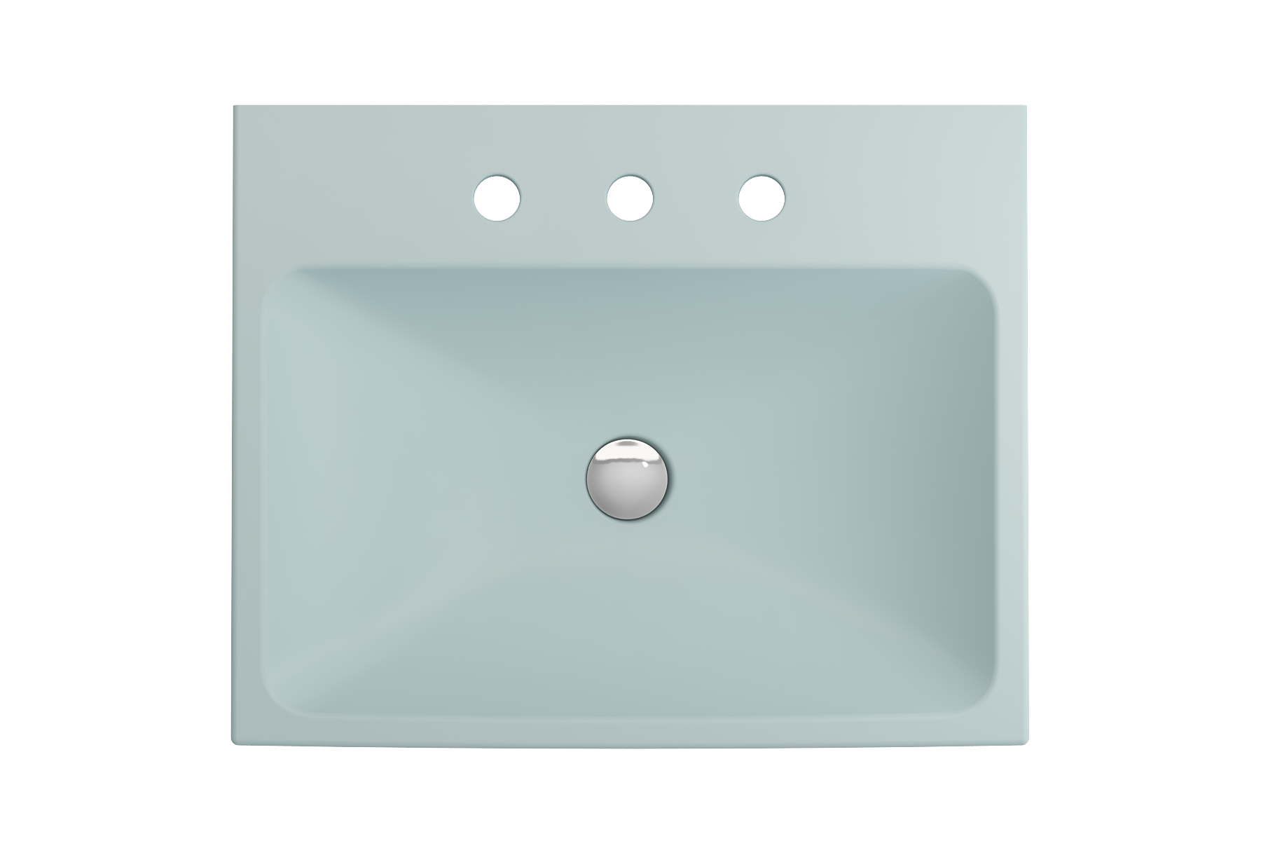 Bathroom sink with 3-hole (8in.) faucet setting. May be wall-hung, used with metal console legs, or semi-recessed into the counter.