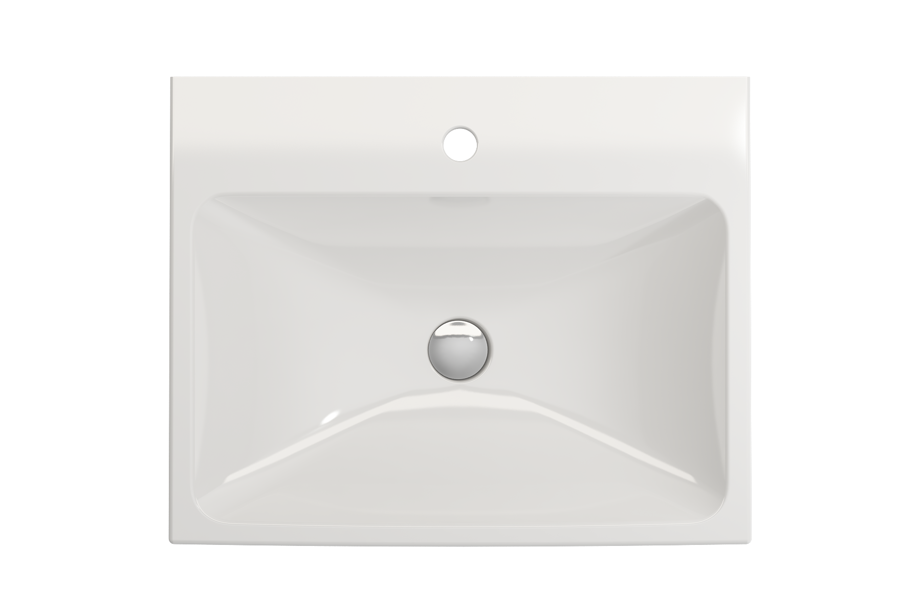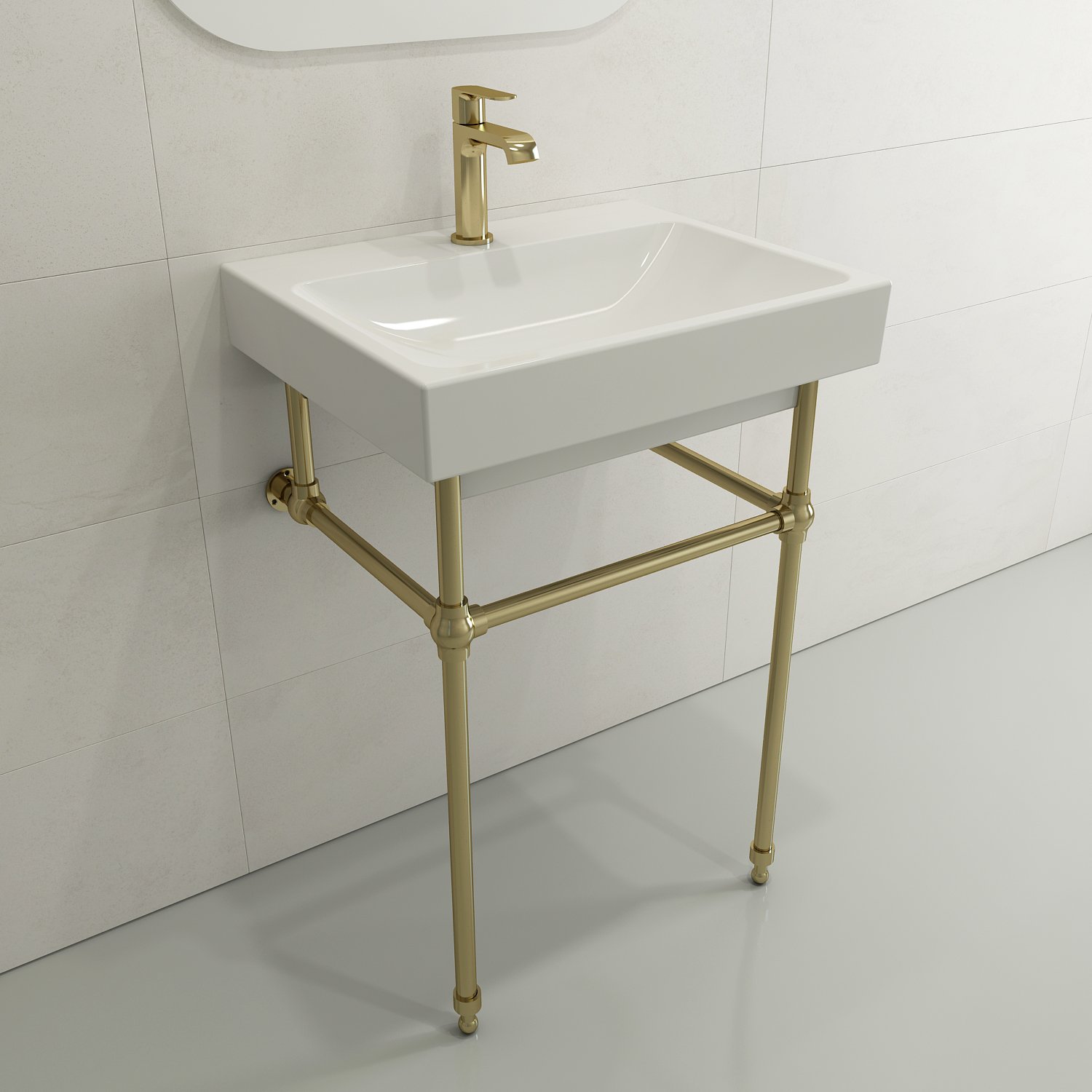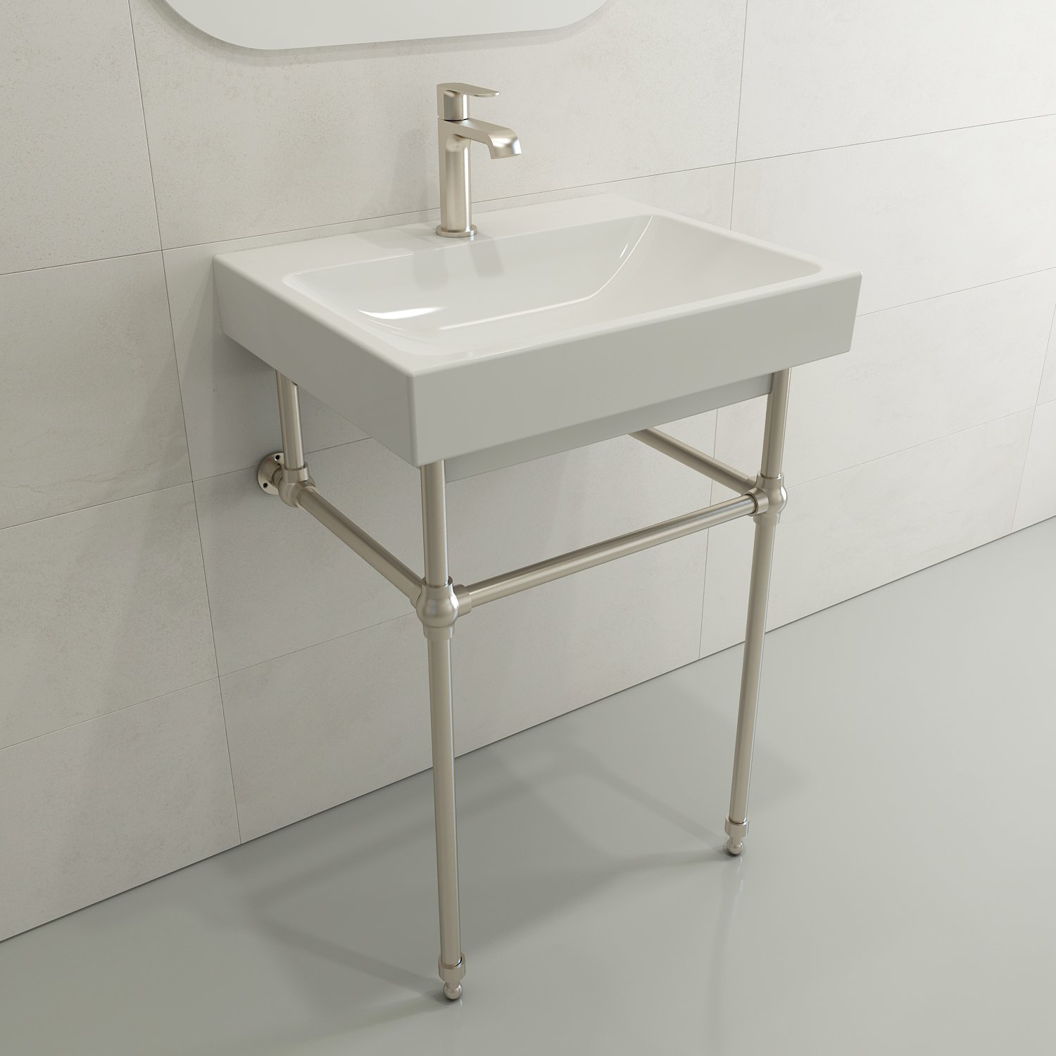 Bathroom sink with single-hole faucet setting. May be wall-hung, used with metal console legs, or semi-recessed into the counter.