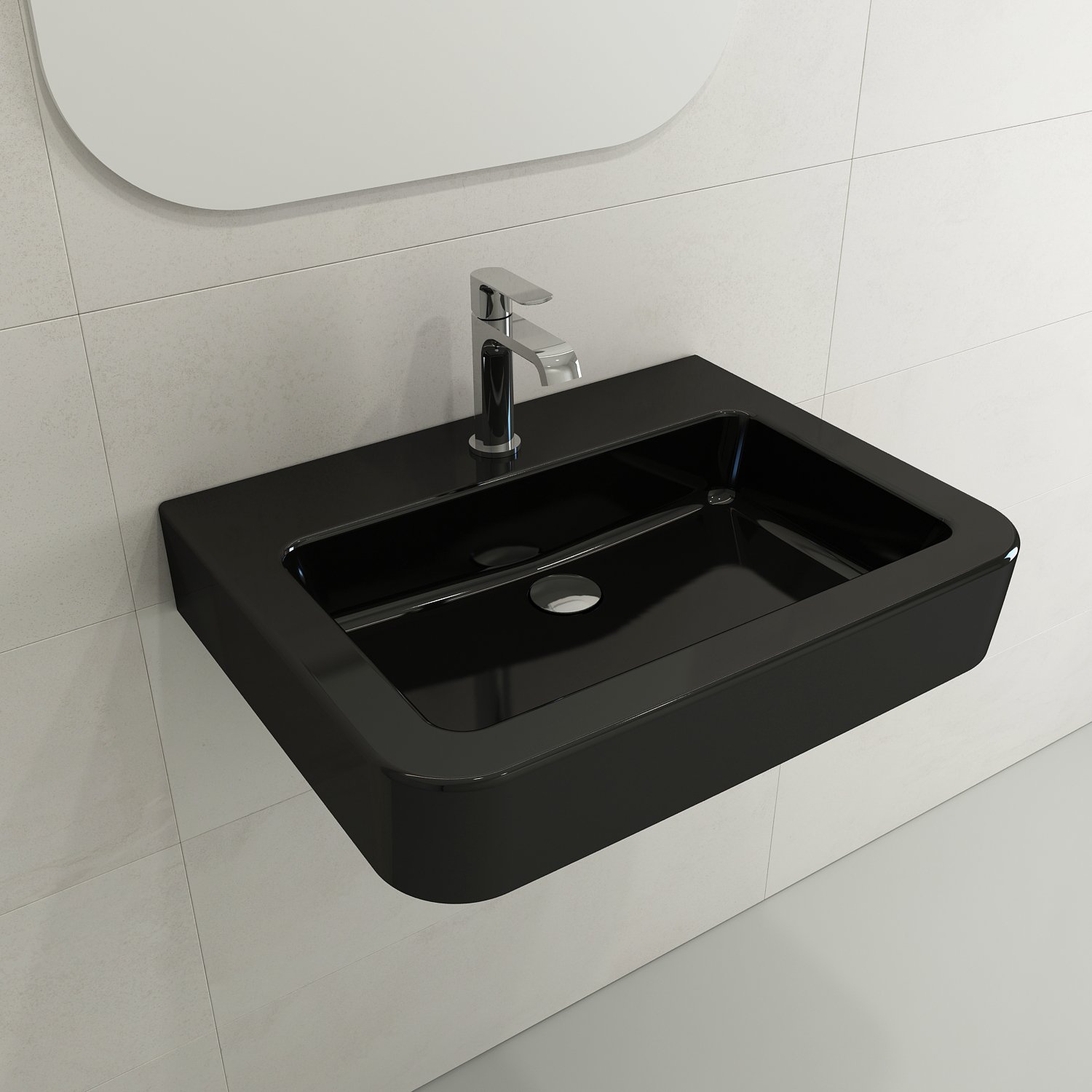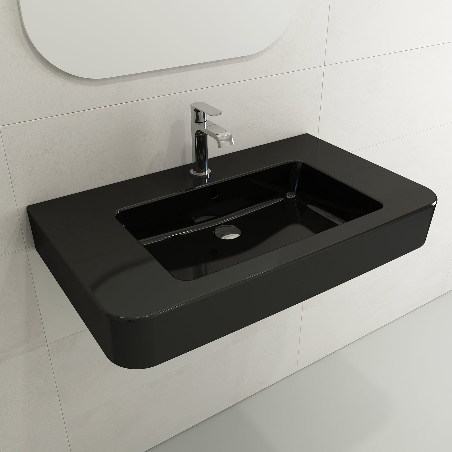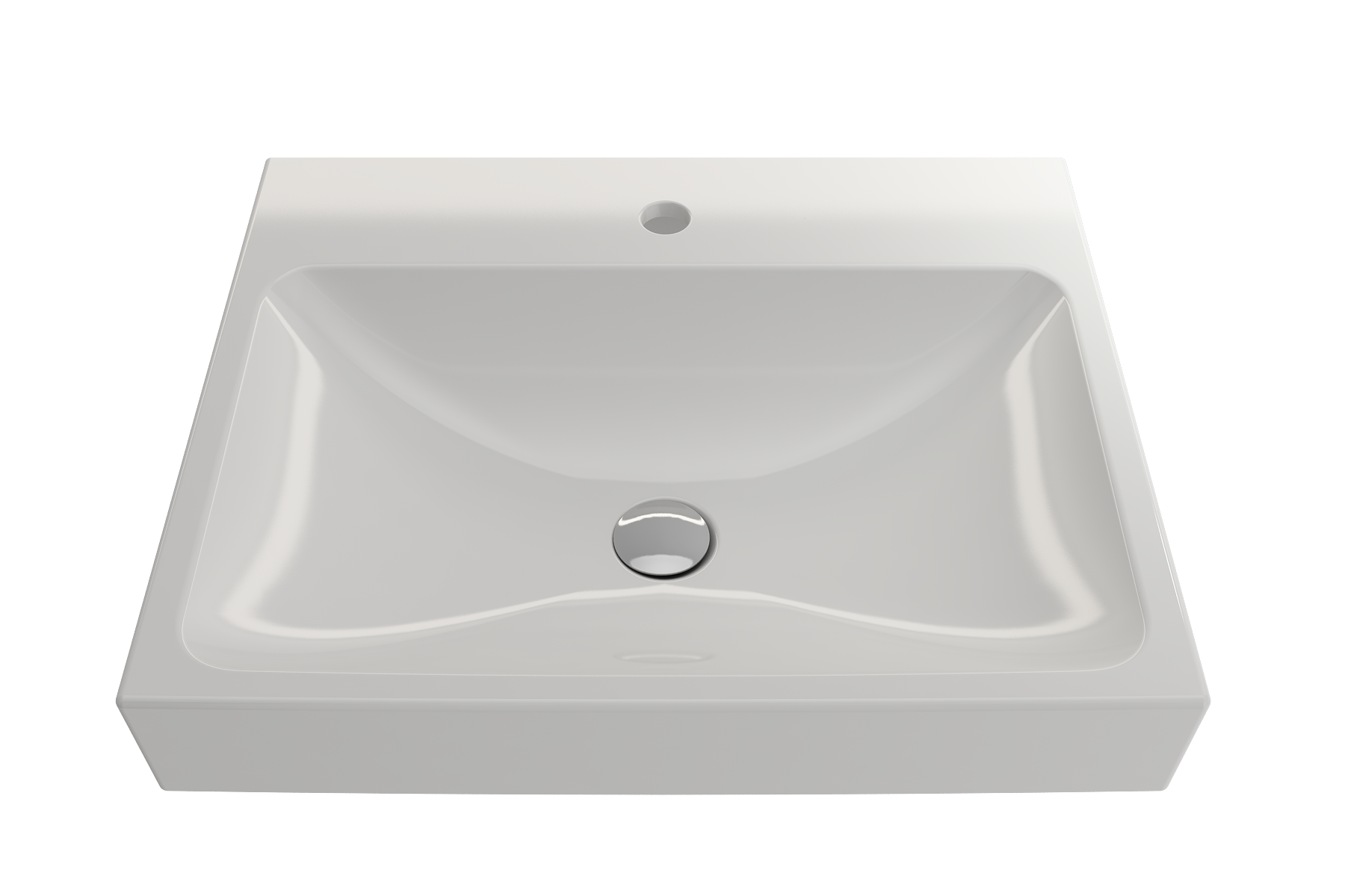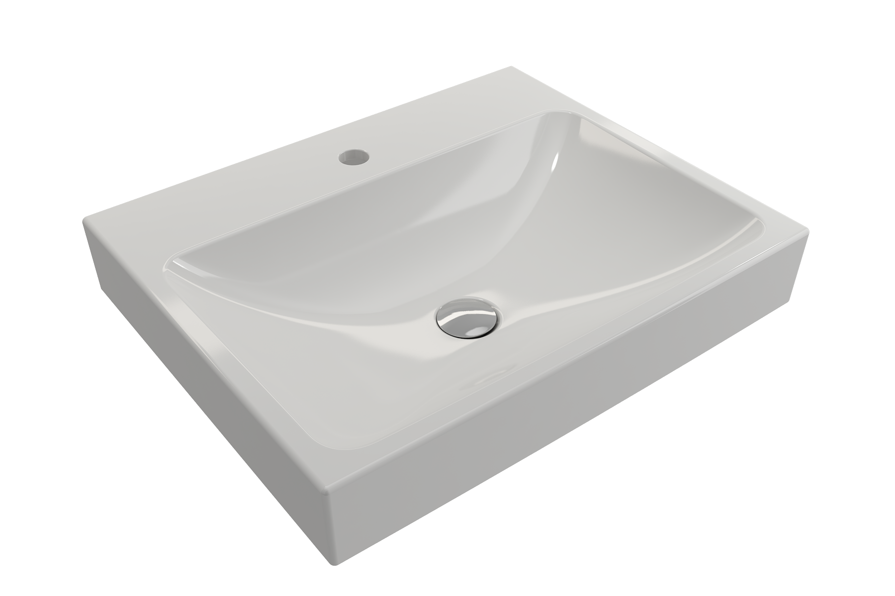 Bathroom sink with single-hole faucet setting. May be wall-hung, used with metal console legs, or semi-recessed into the counter.