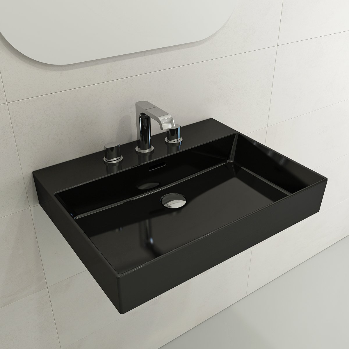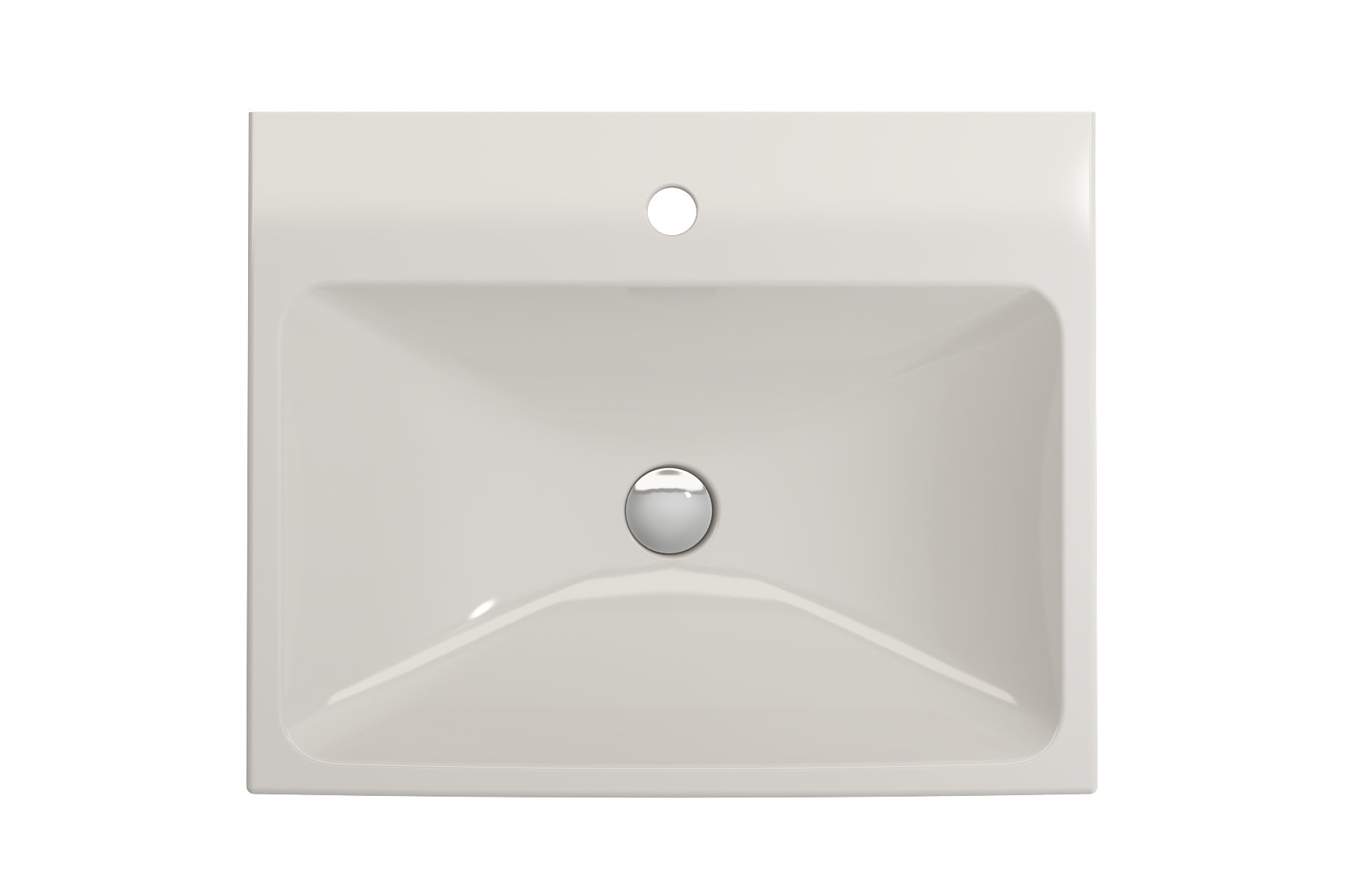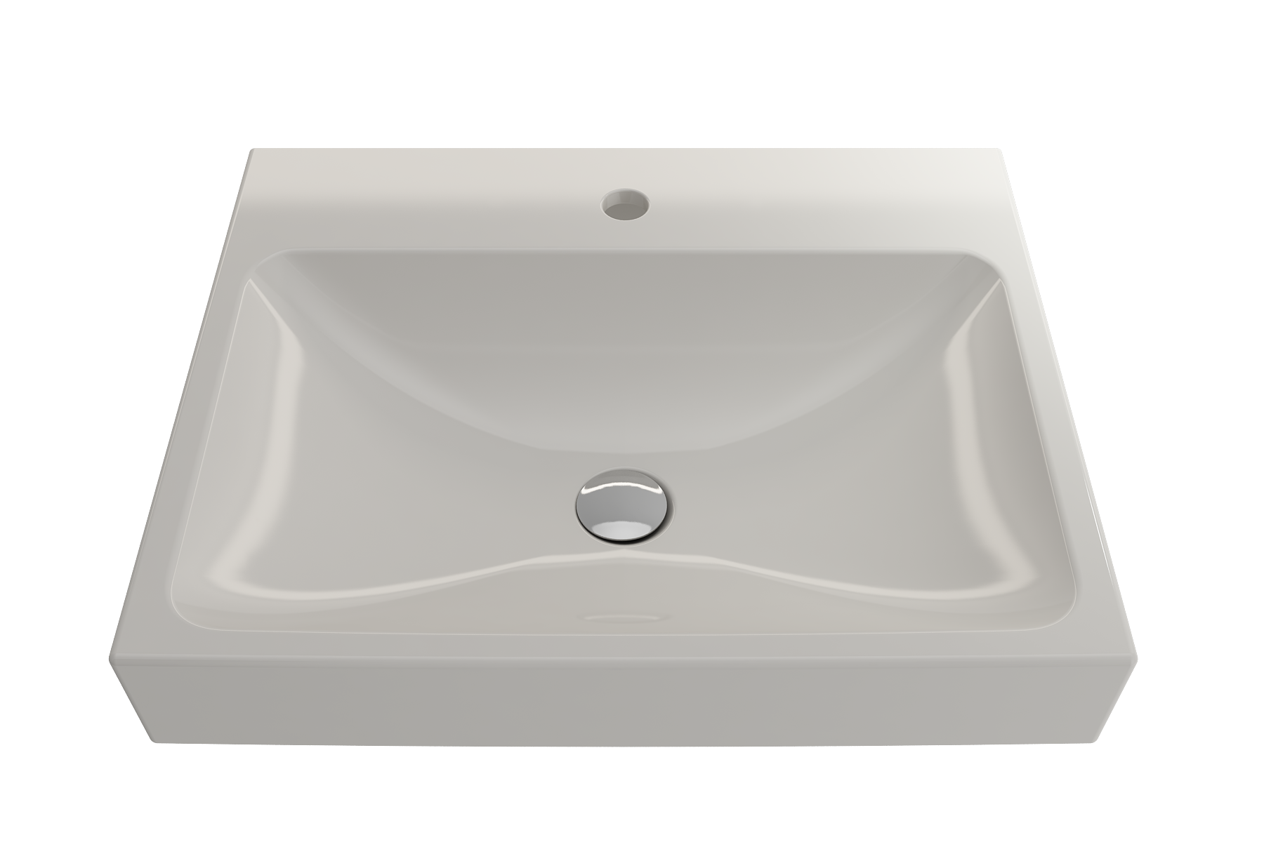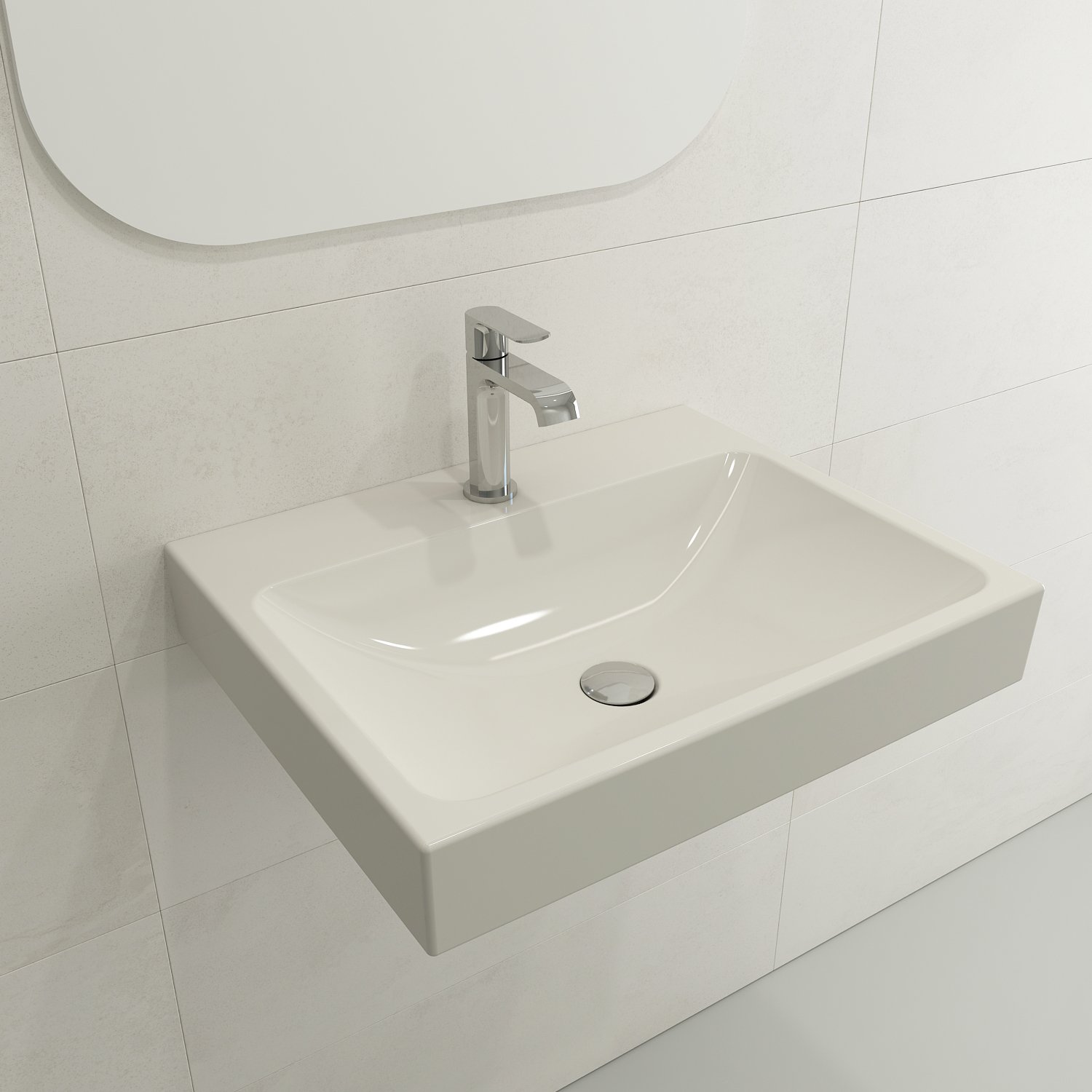 Bathroom sink with single-hole faucet setting. May be wall-hung, used with metal console legs, or semi-recessed into the counter.