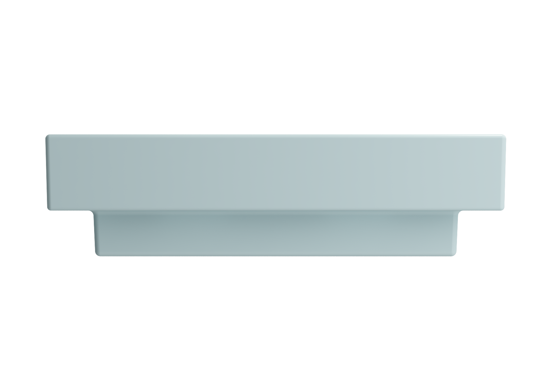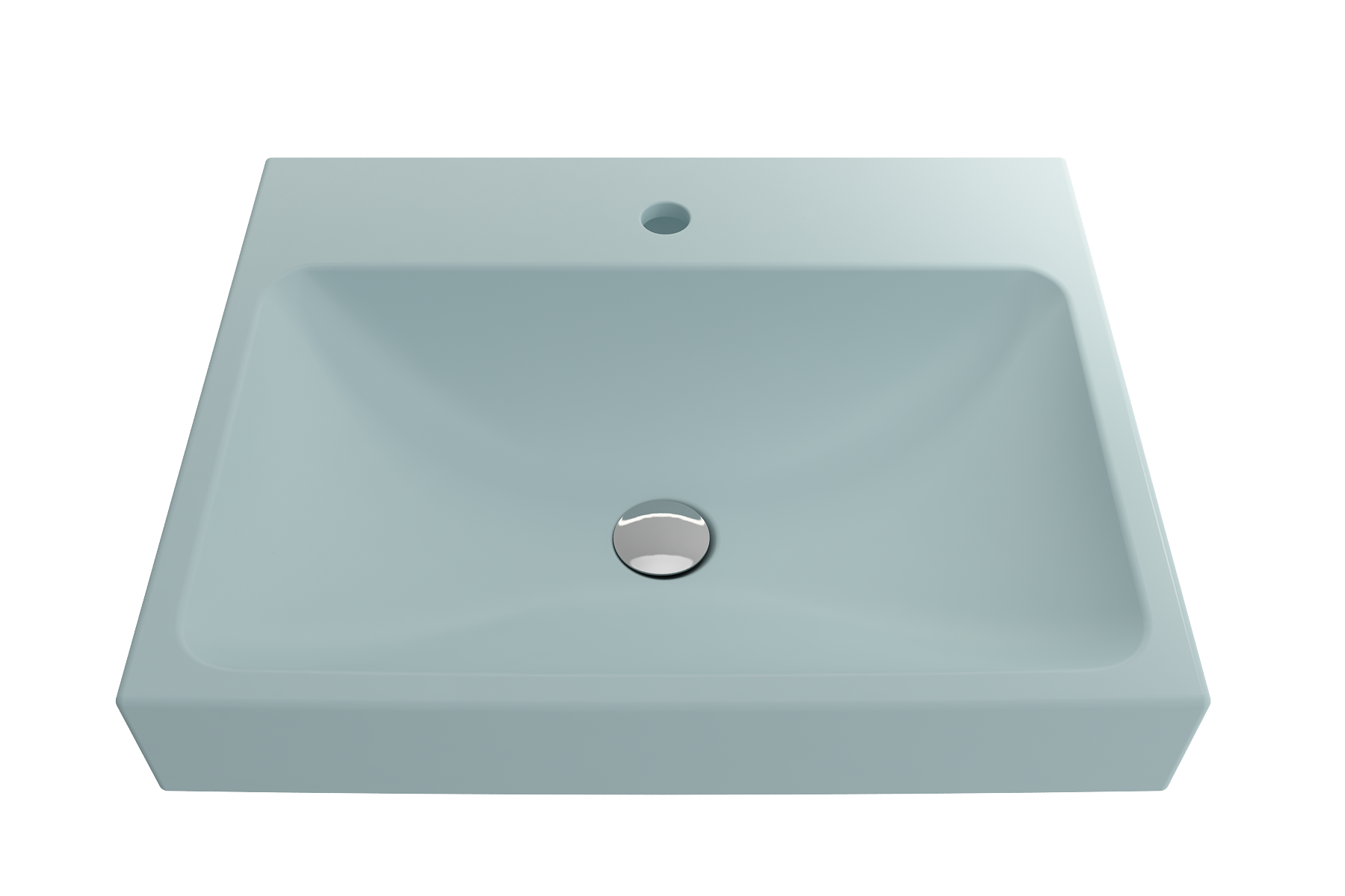 Bathroom sink with single-hole faucet setting. May be wall-hung, used with metal console legs, or semi-recessed into the counter.
