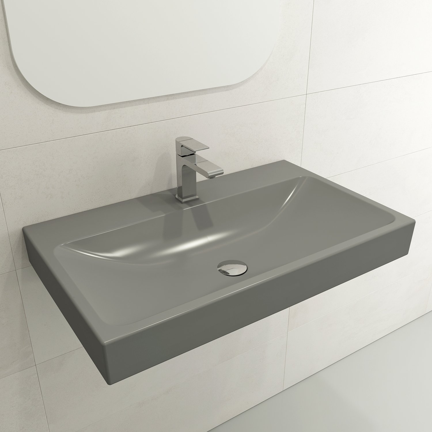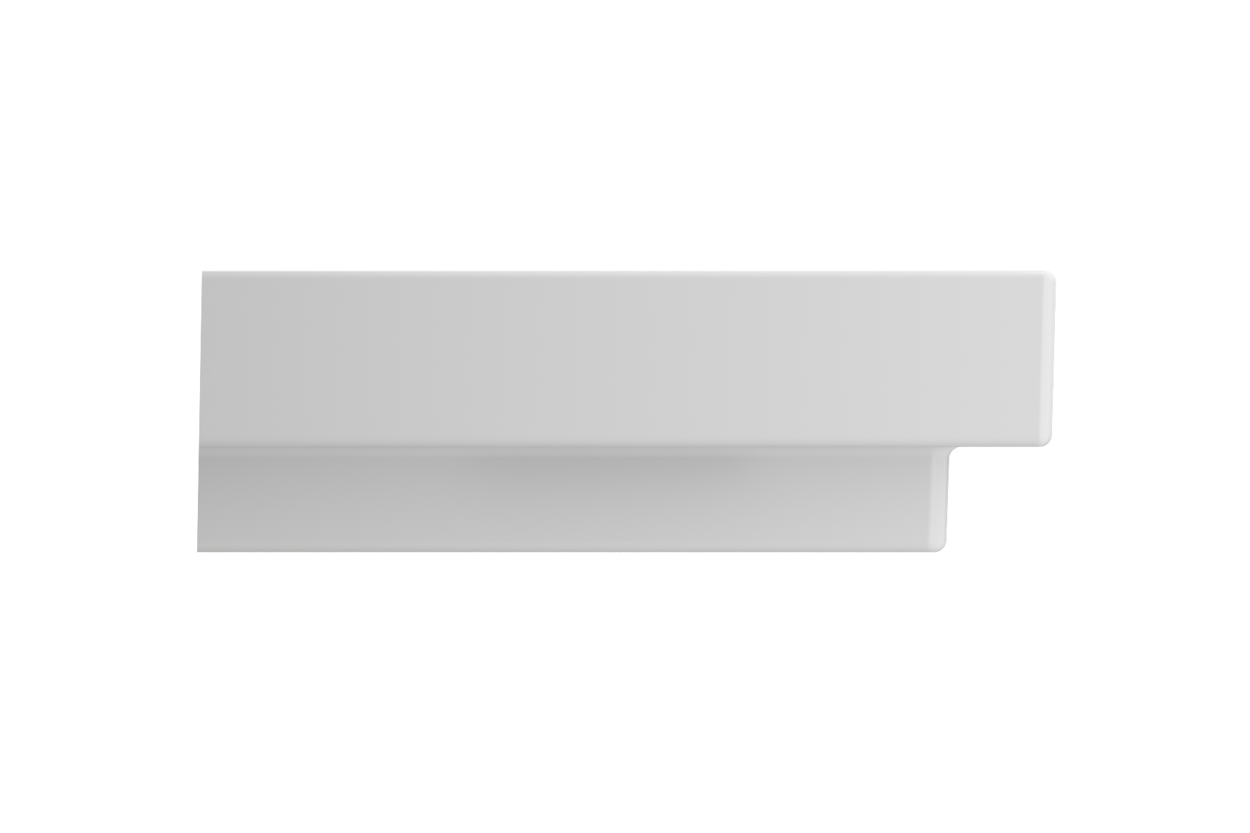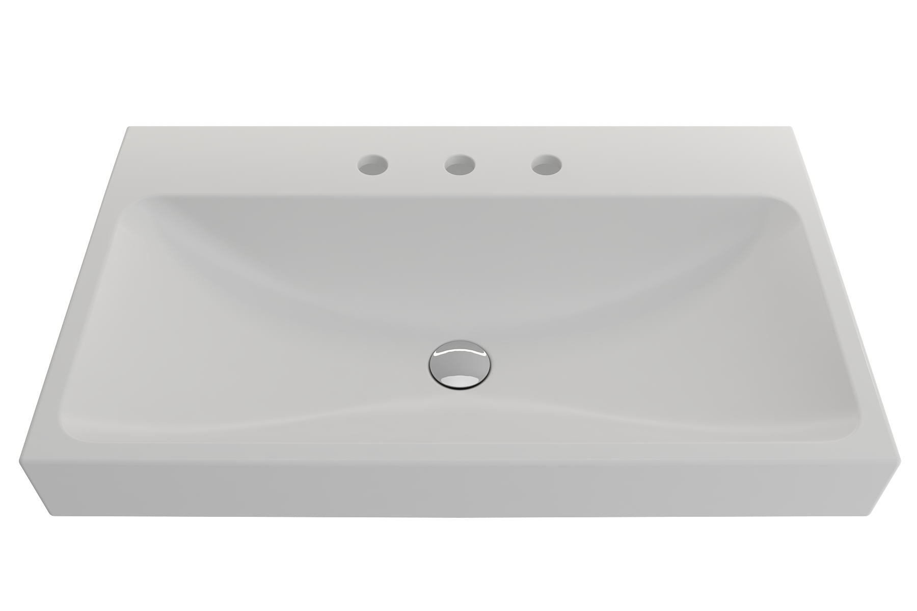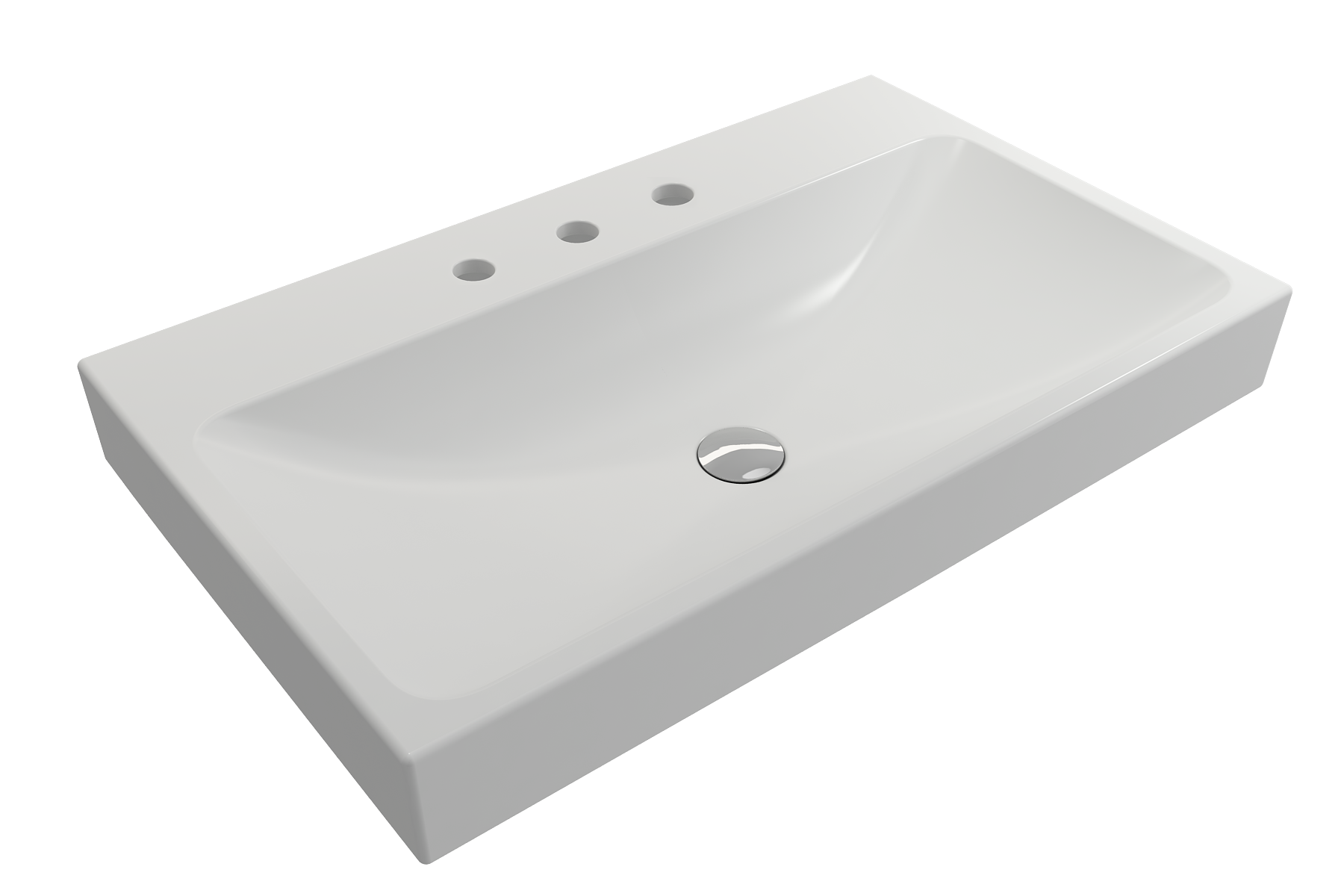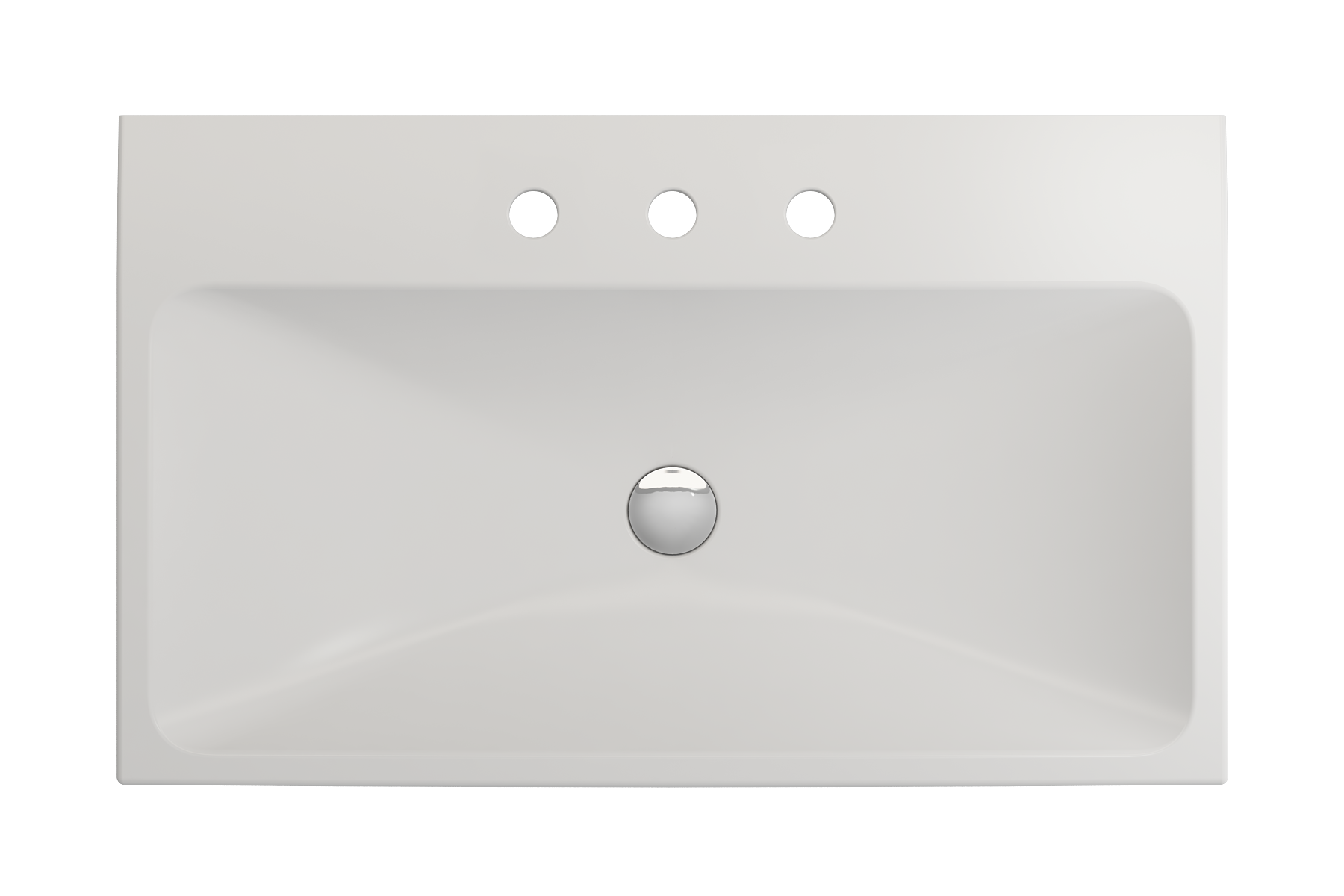 Bathroom sink with 3-hole (8in.) faucet setting. May be wall-hung, used with metal console legs, or semi-recessed into the counter.