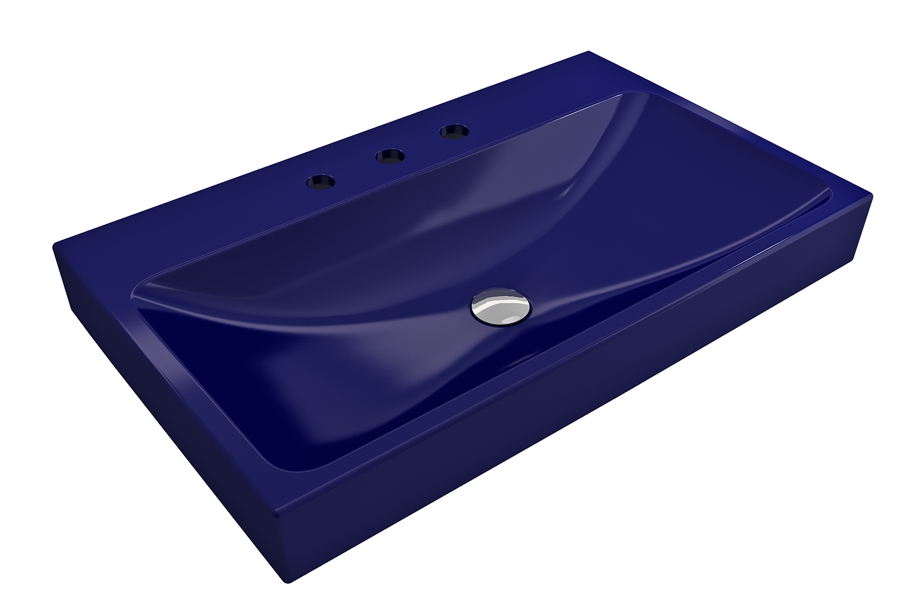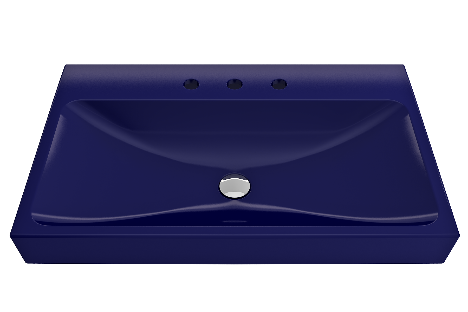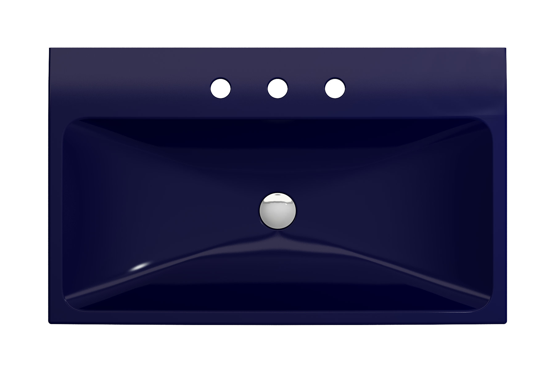 Bathroom sink with 3-hole (8in.) faucet setting. May be wall-hung, used with metal console legs, or semi-recessed into the counter.