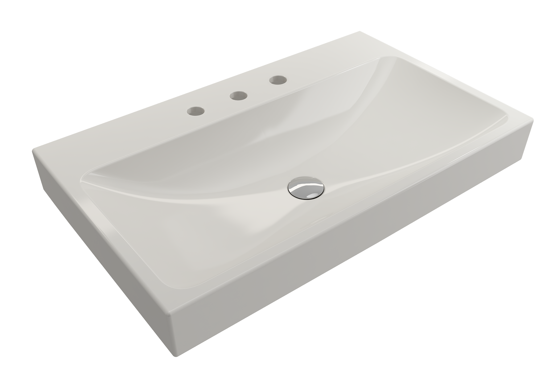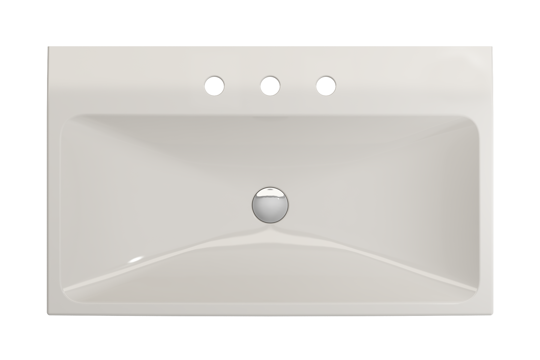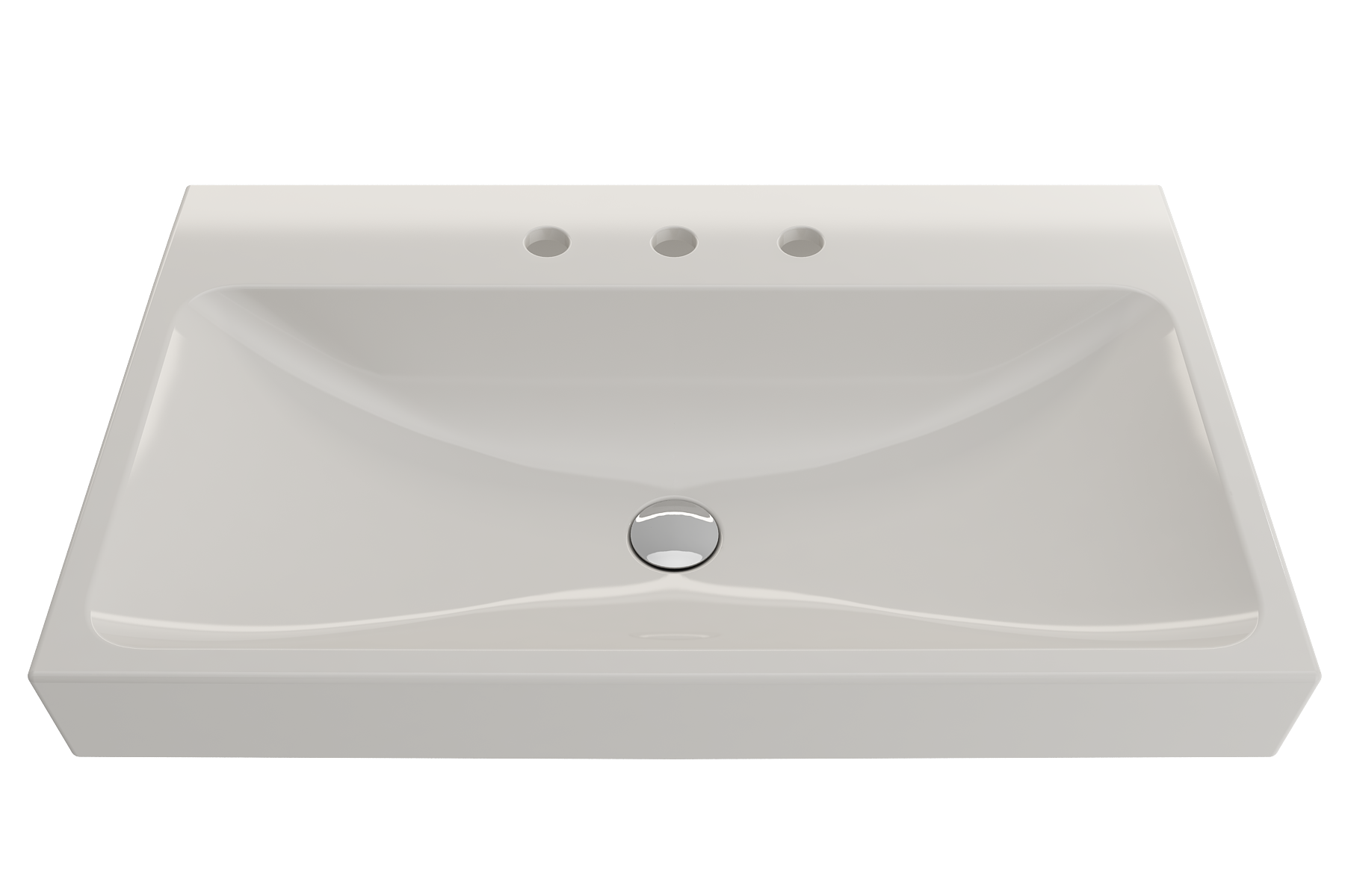 Bathroom sink with 3-hole (8in.) faucet setting. May be wall-hung, used with metal console legs, or semi-recessed into the counter.