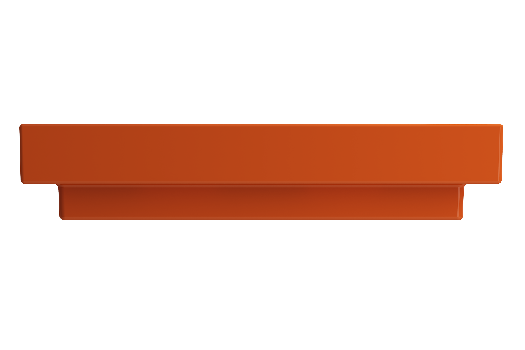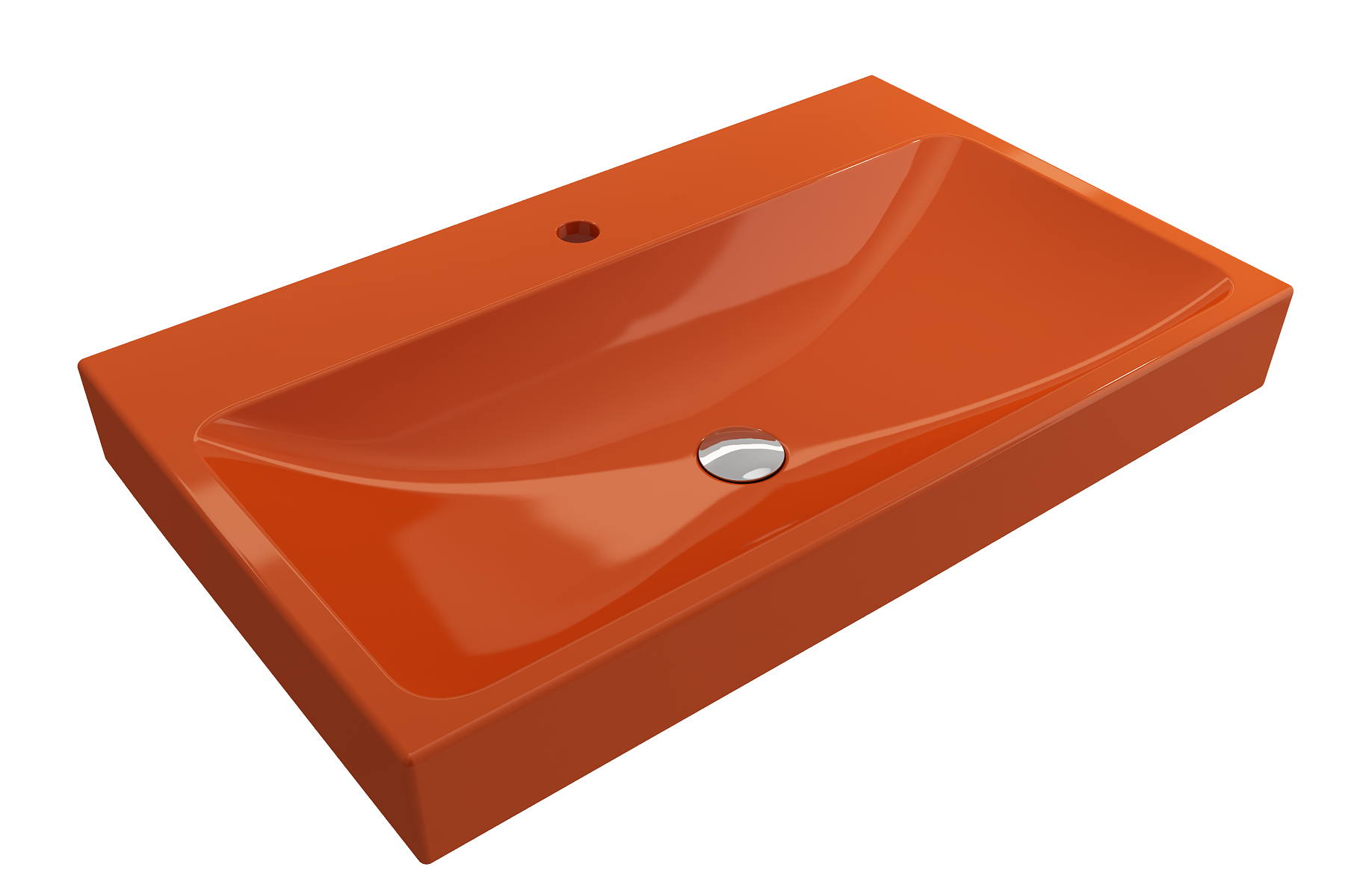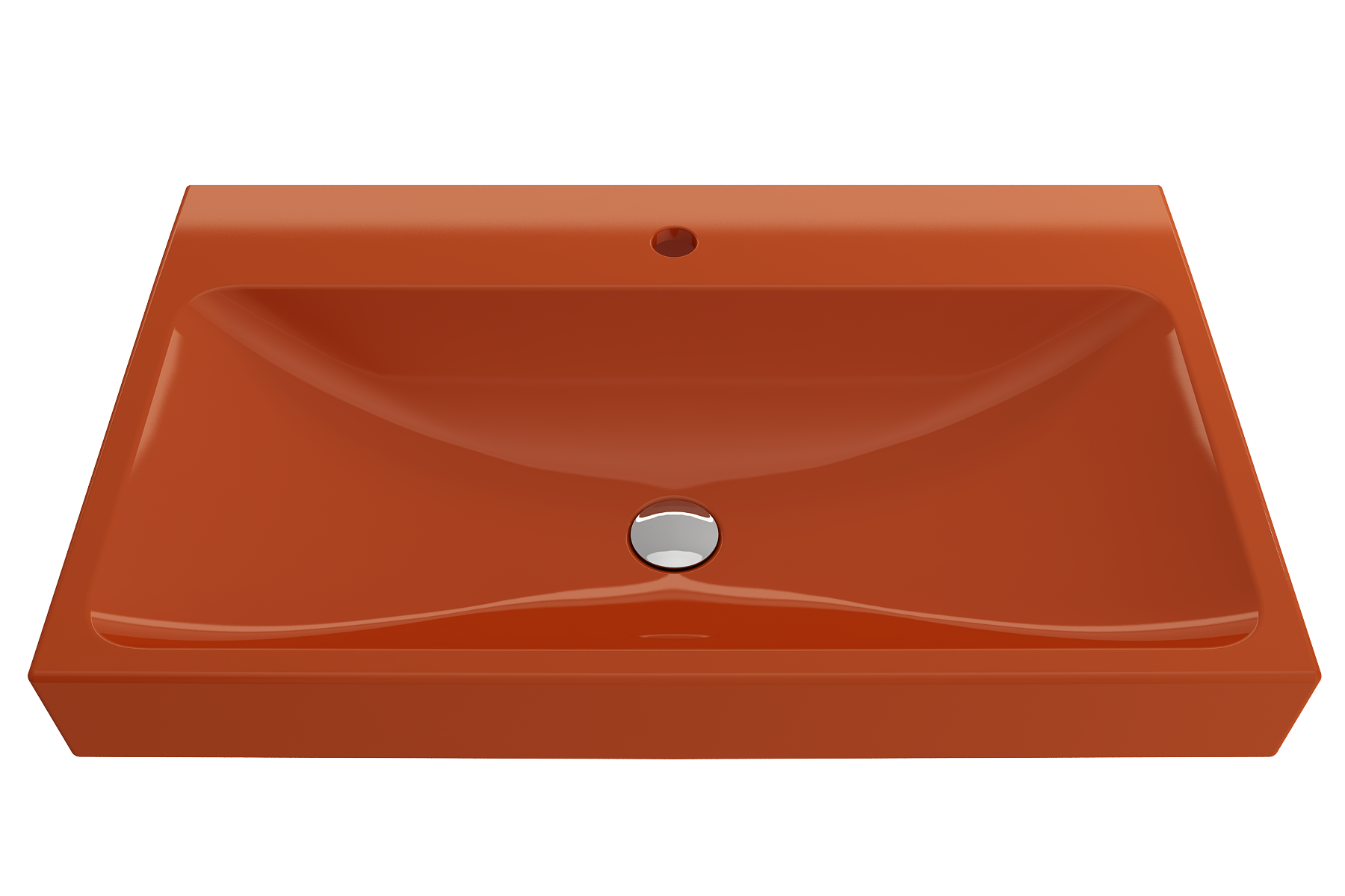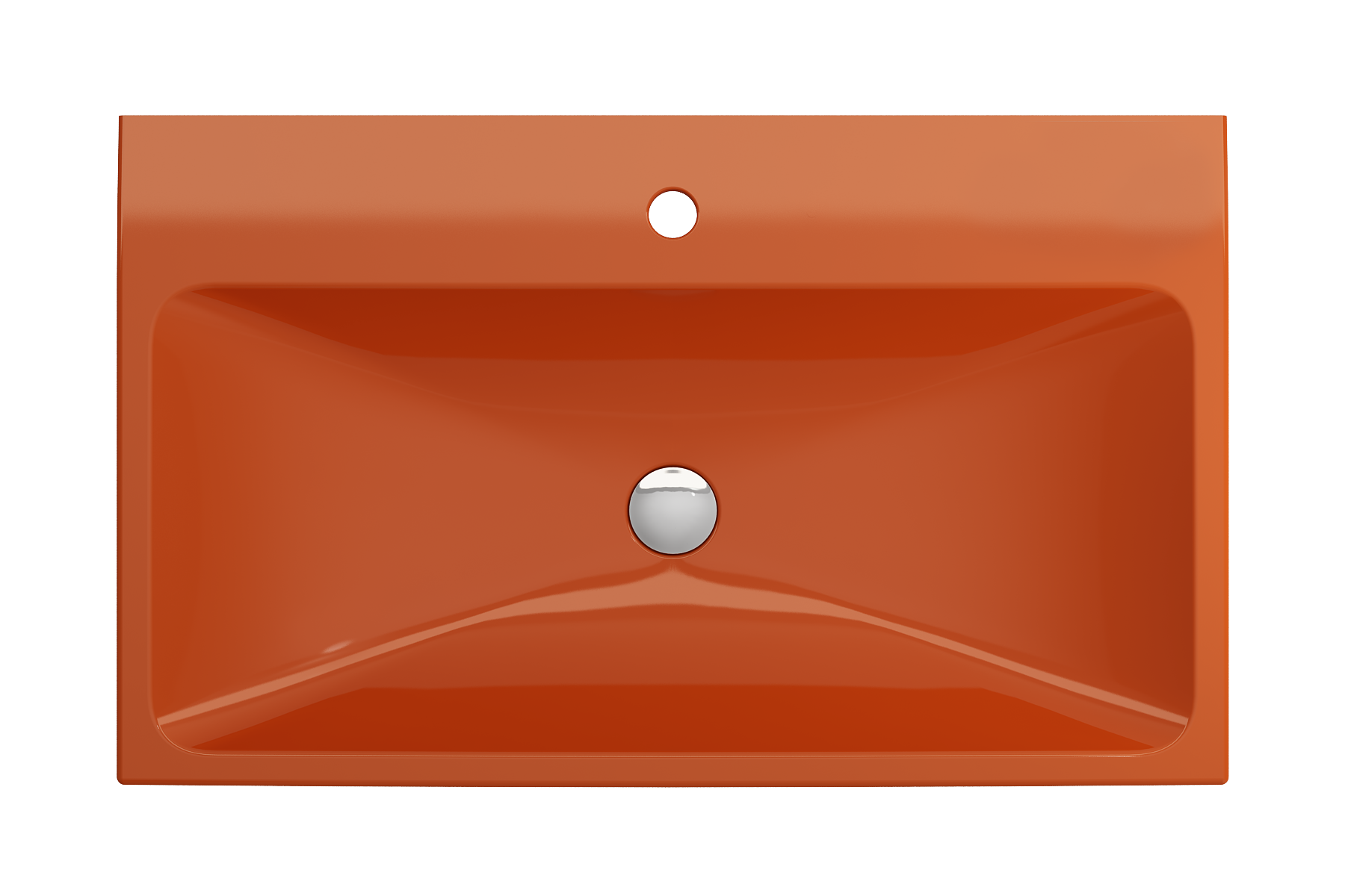 Bathroom sink with single-hole faucet setting. May be wall-hung, used with metal console legs, or semi-recessed into the counter.