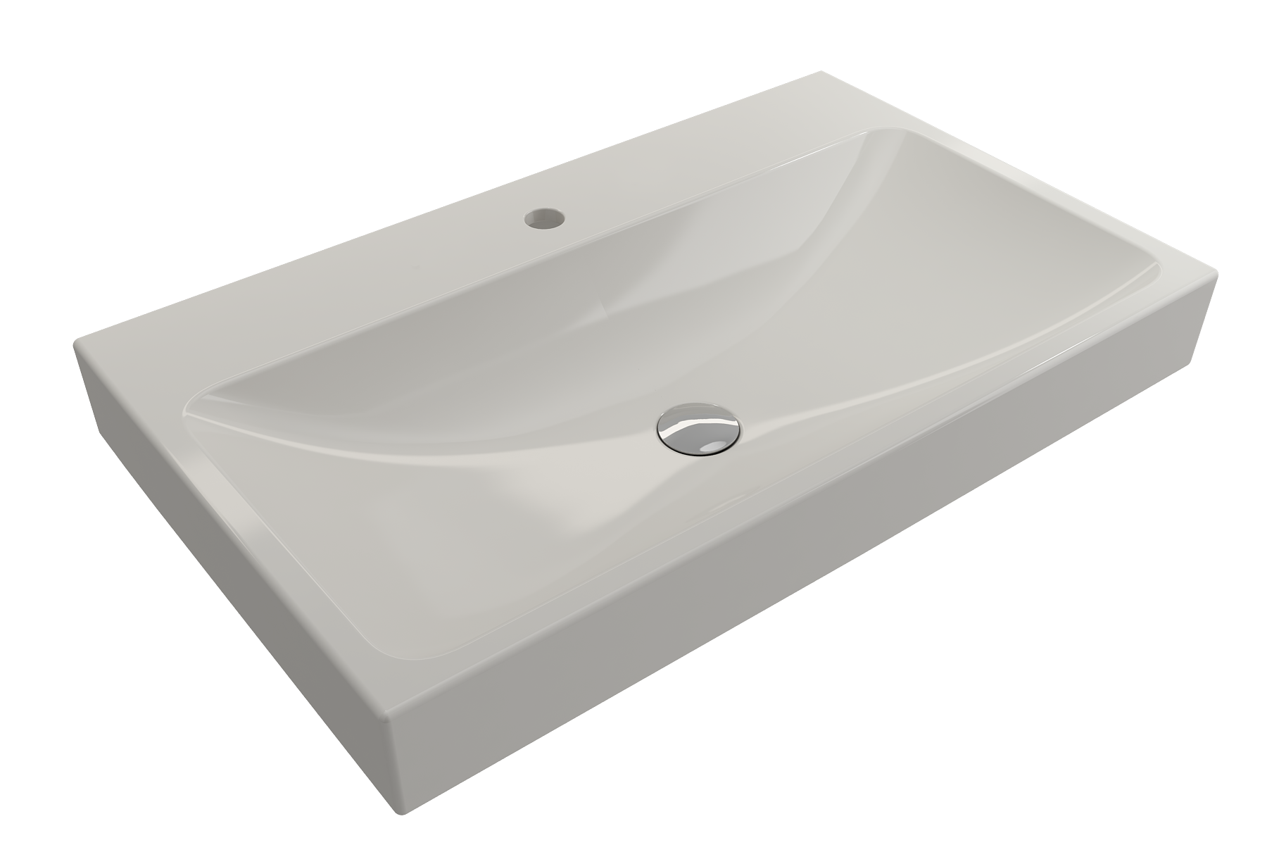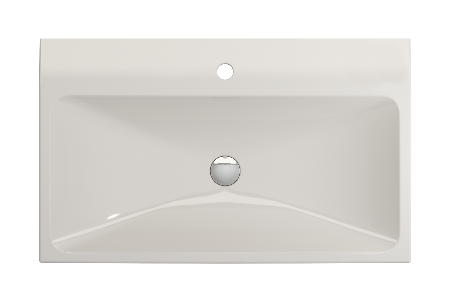 Bathroom sink with single-hole faucet setting. May be wall-hung, used with metal console legs, or semi-recessed into the counter.