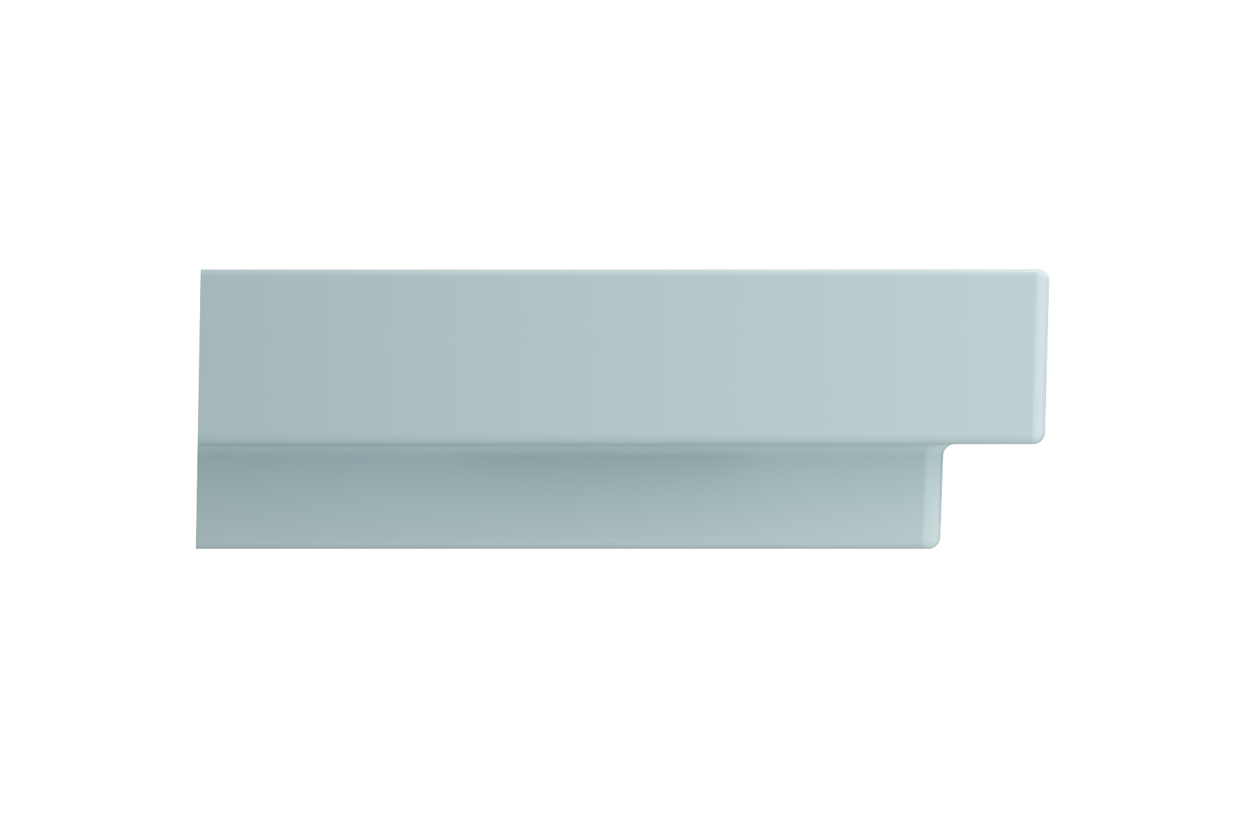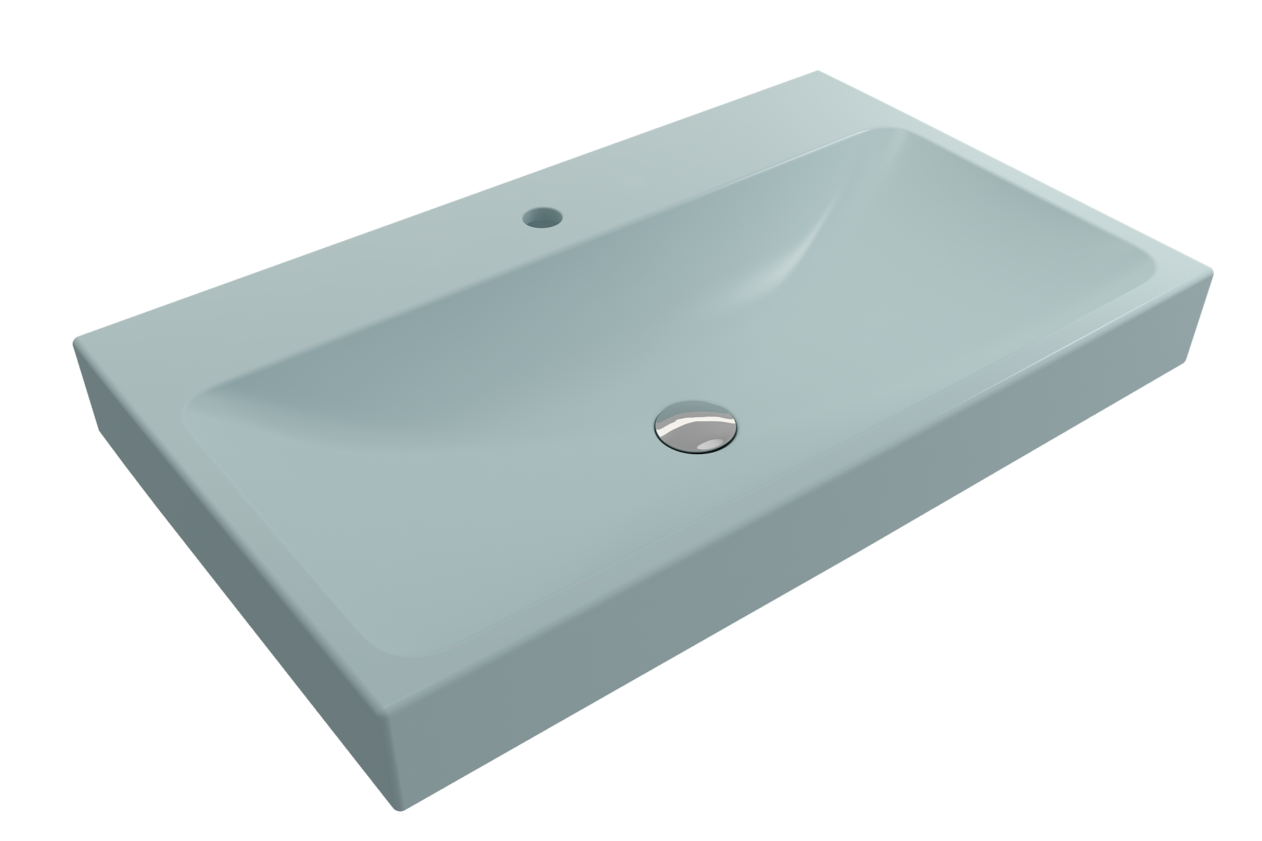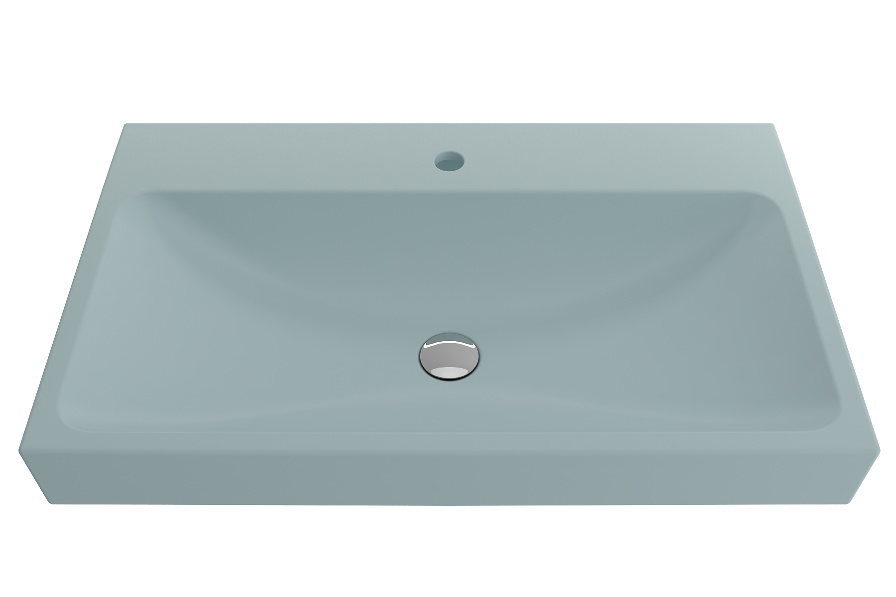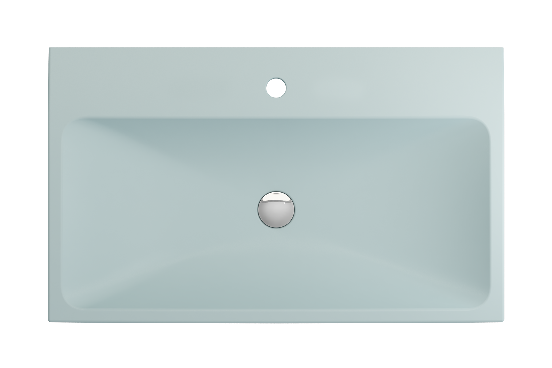 Bathroom sink with single-hole faucet setting. May be wall-hung, used with metal console legs, or semi-recessed into the counter.