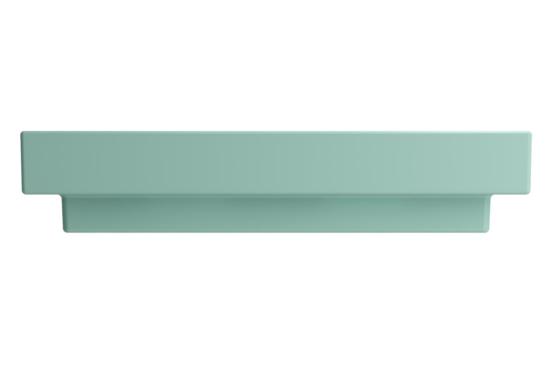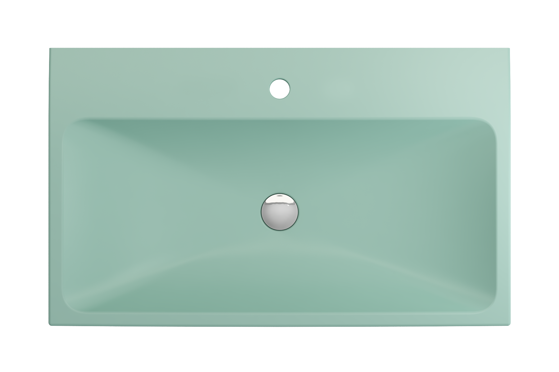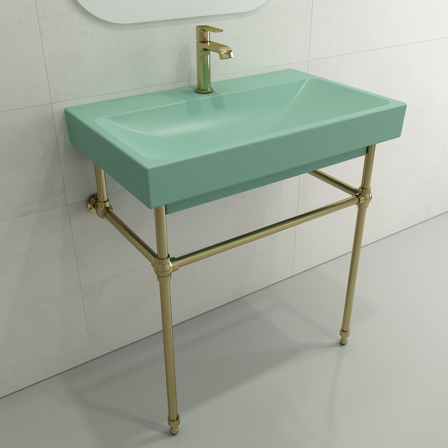 Bathroom sink with single-hole faucet setting. May be wall-hung, used with metal console legs, or semi-recessed into the counter.
