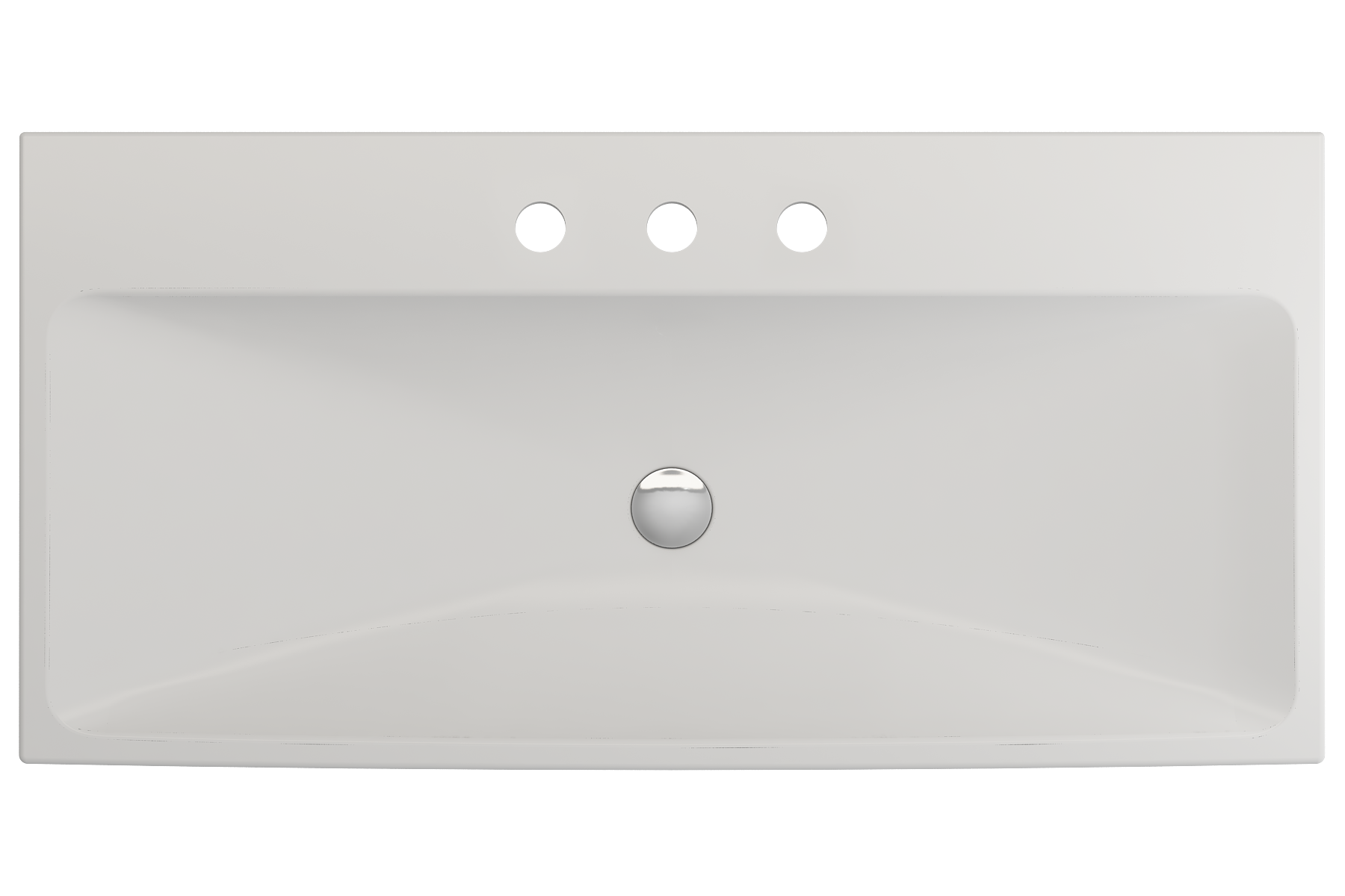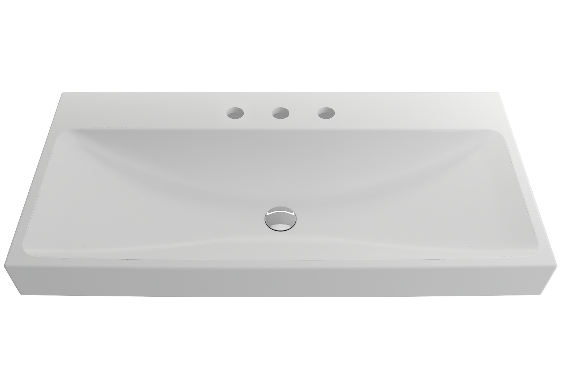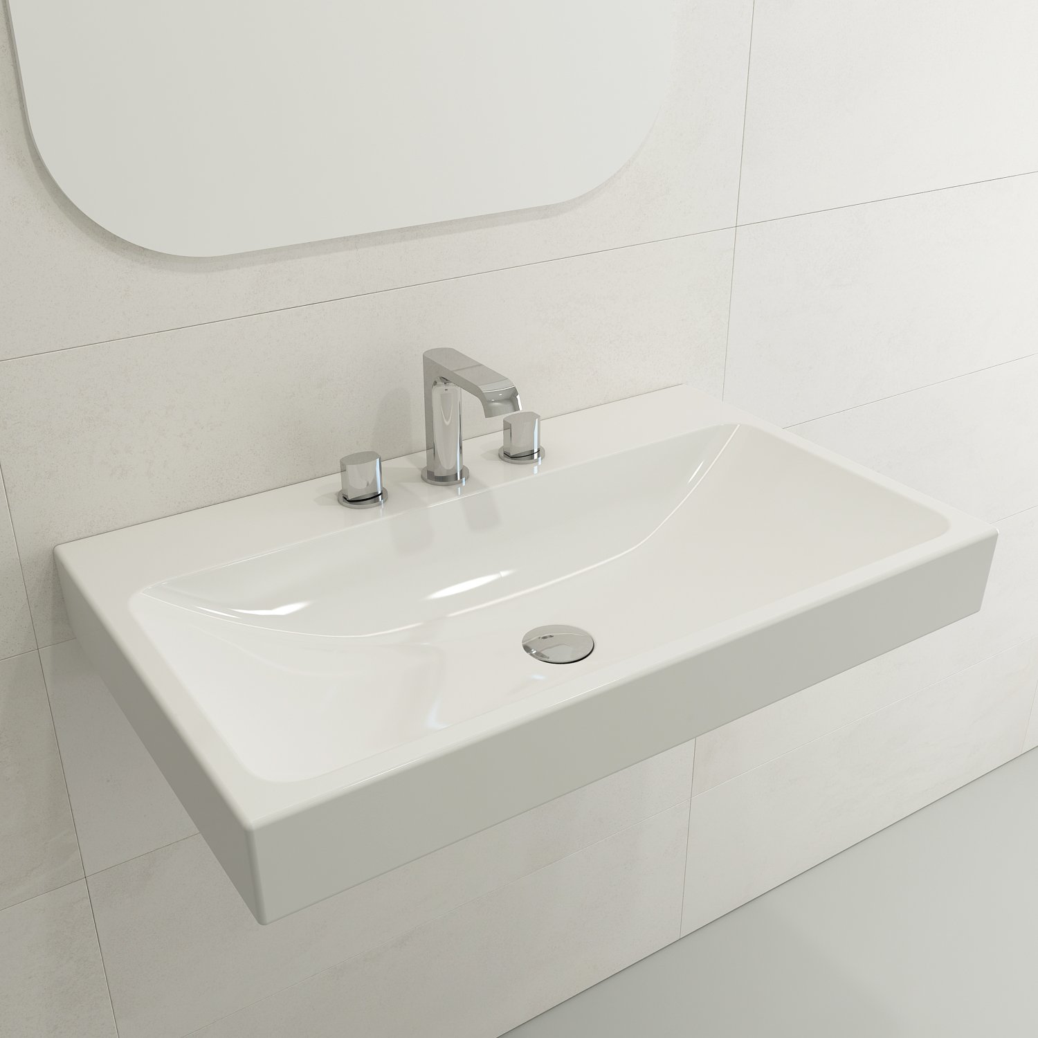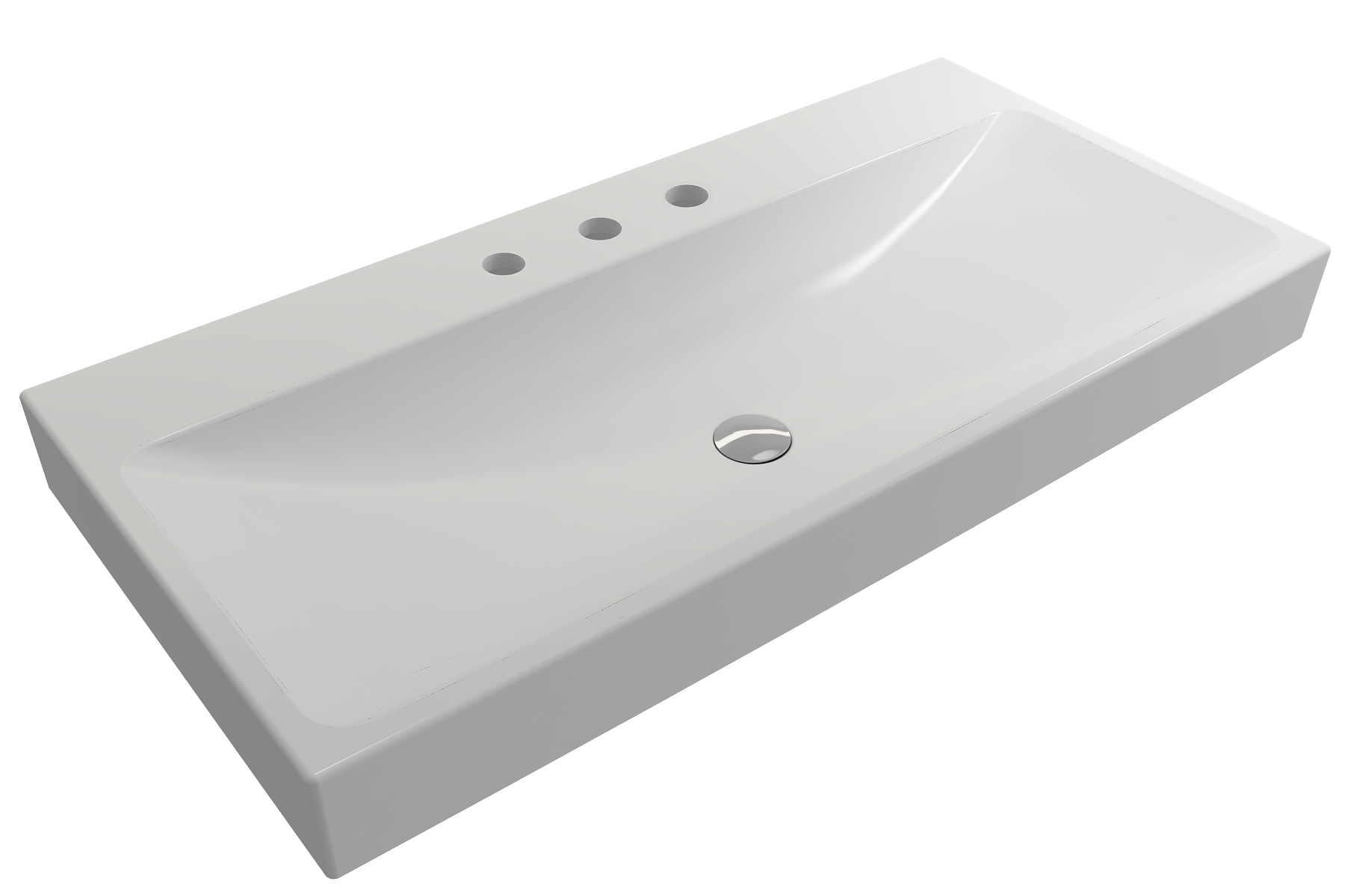 Bathroom sink with 3-hole (8in.) faucet setting. May be wall-hung, used with metal console legs, or semi-recessed into the counter.