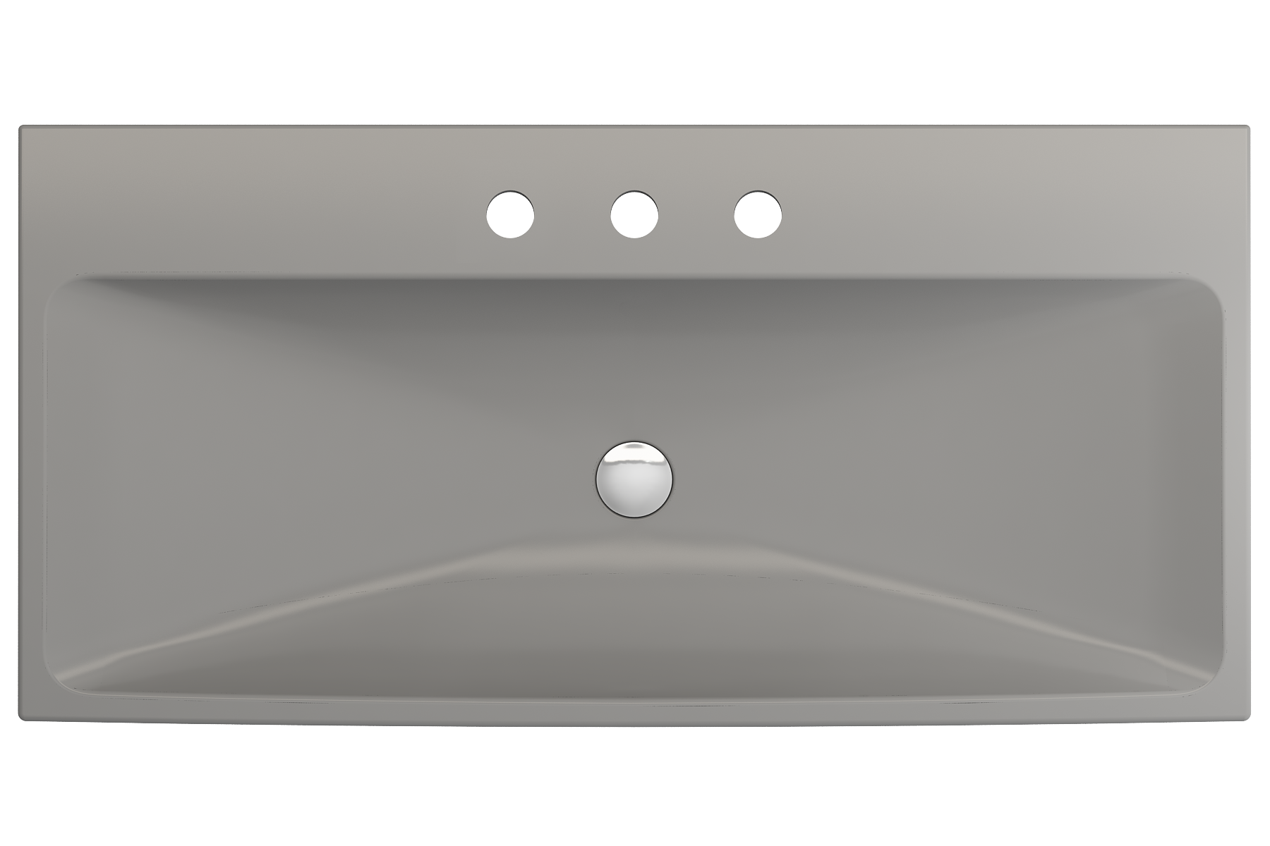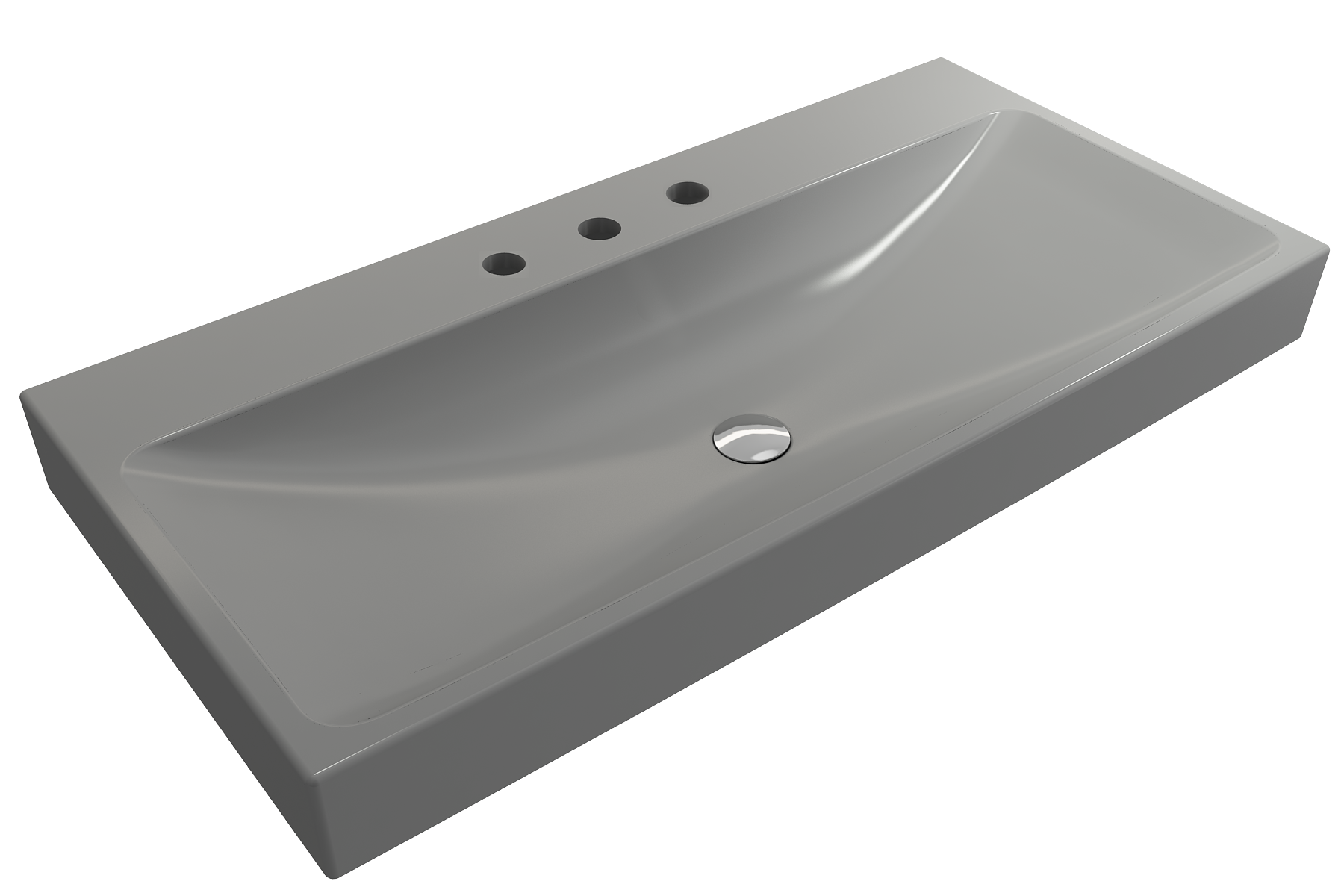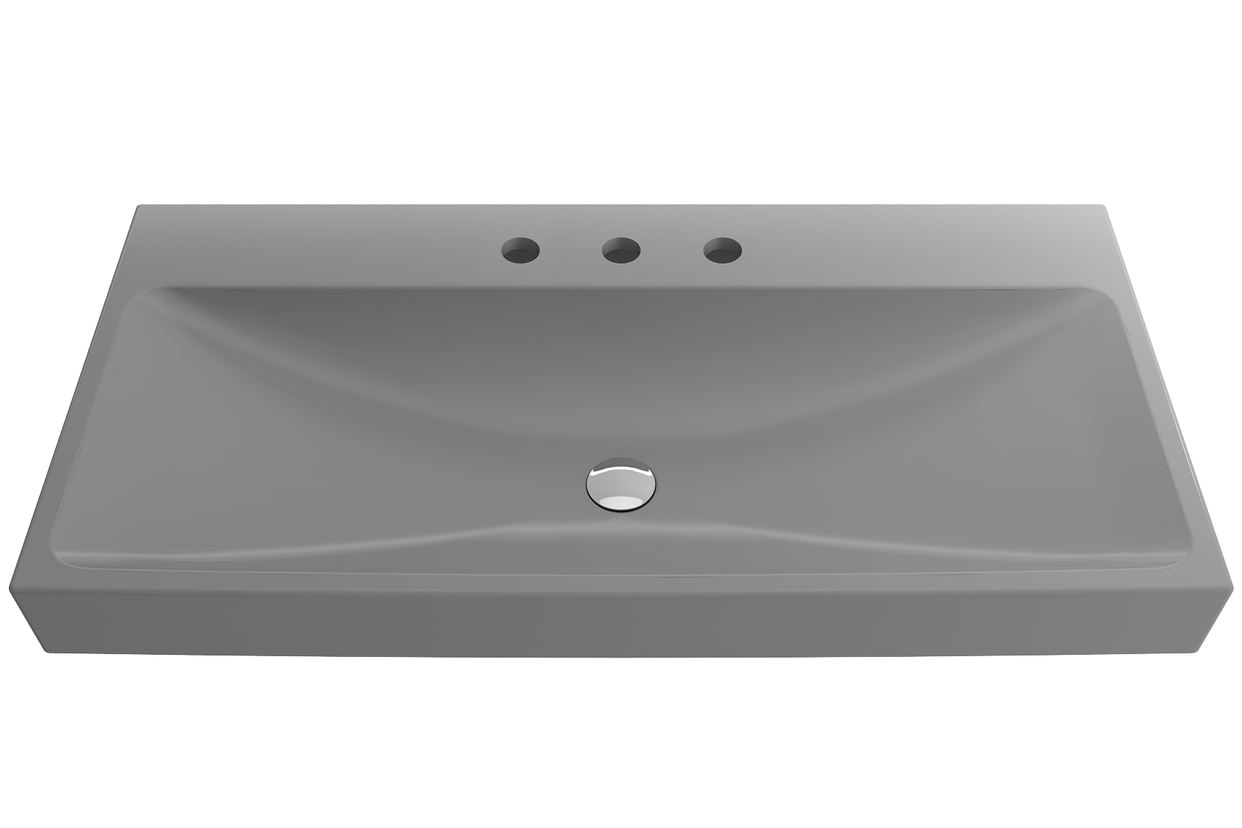 Bathroom sink with 3-hole (8in.) faucet setting. May be wall-hung, used with metal console legs, or semi-recessed into the counter.
