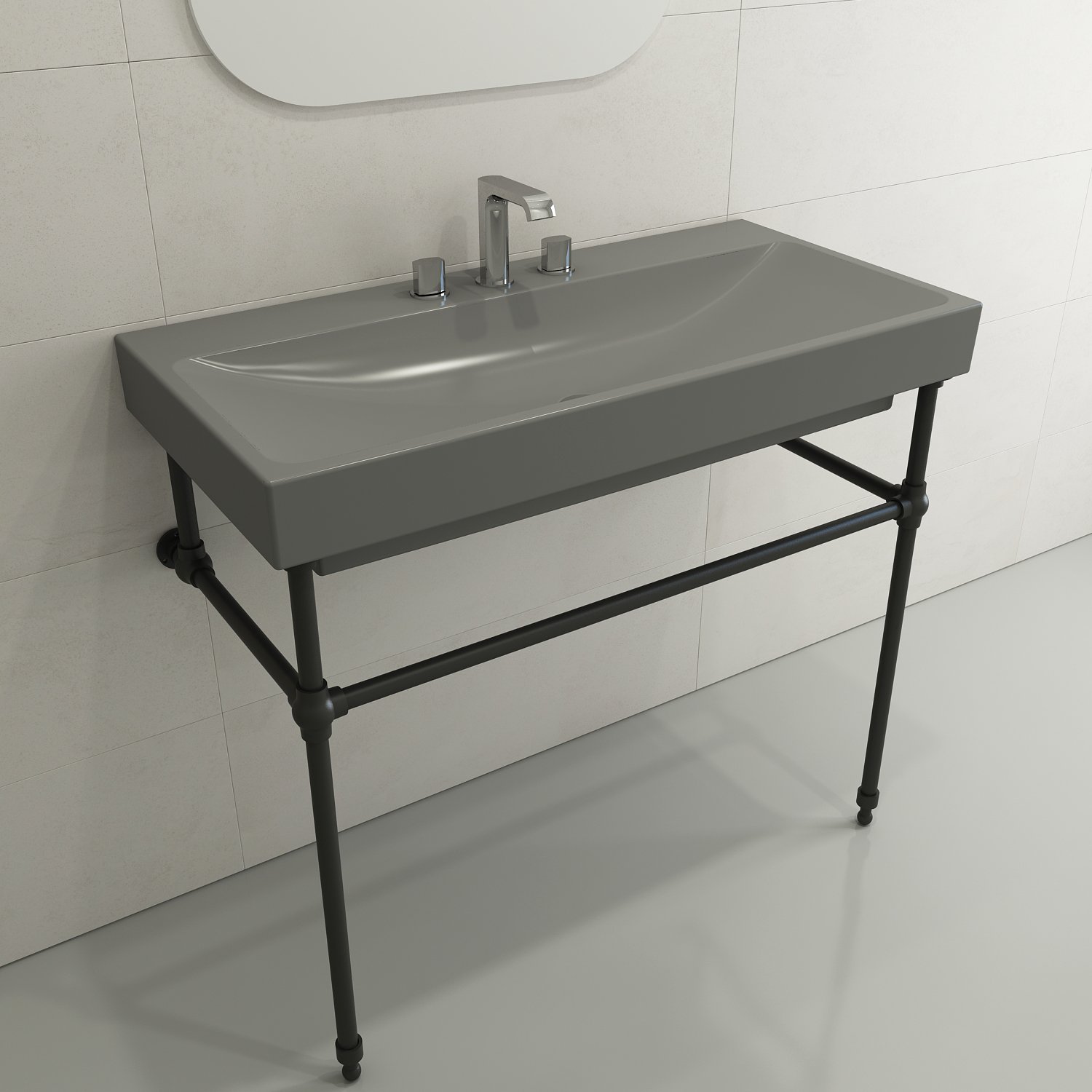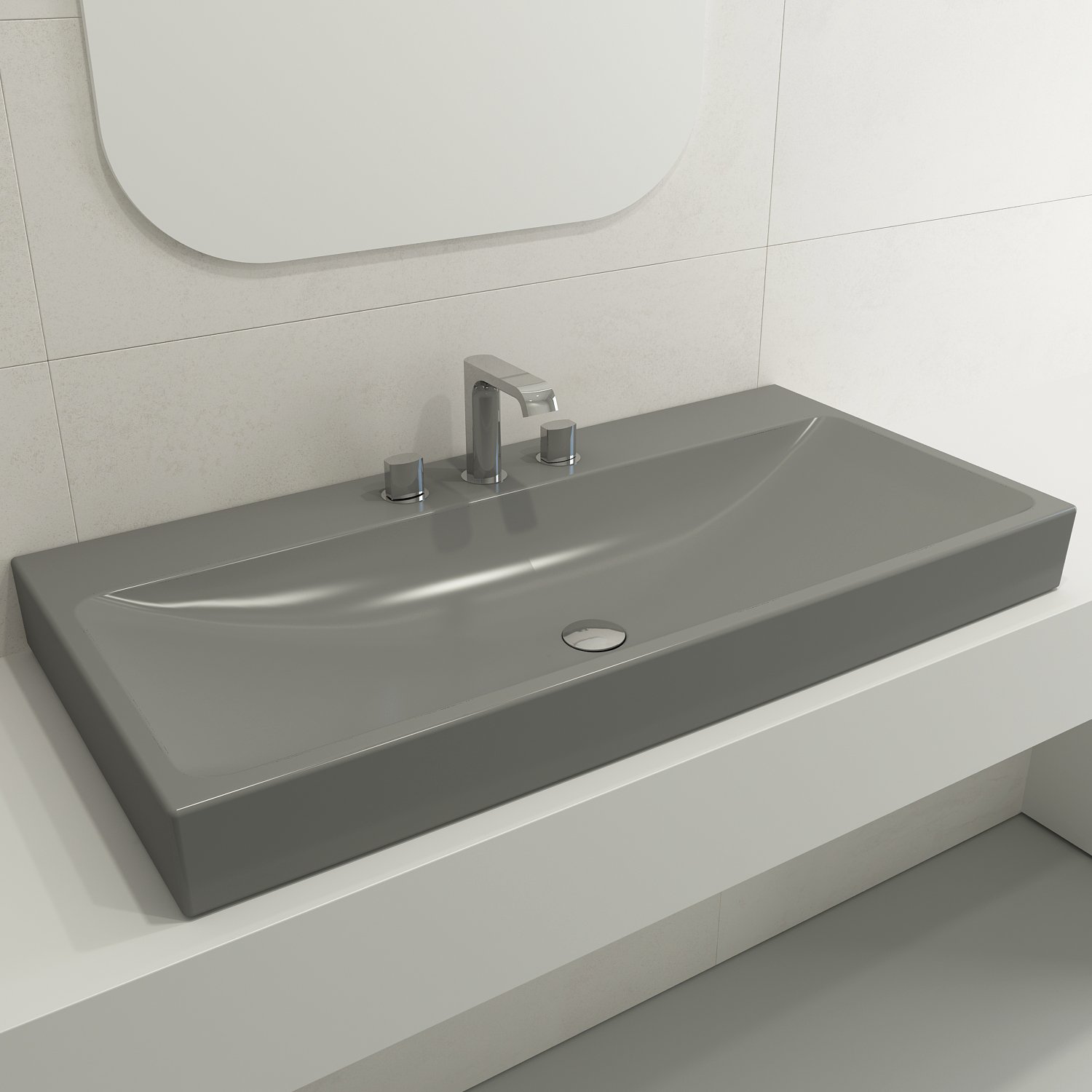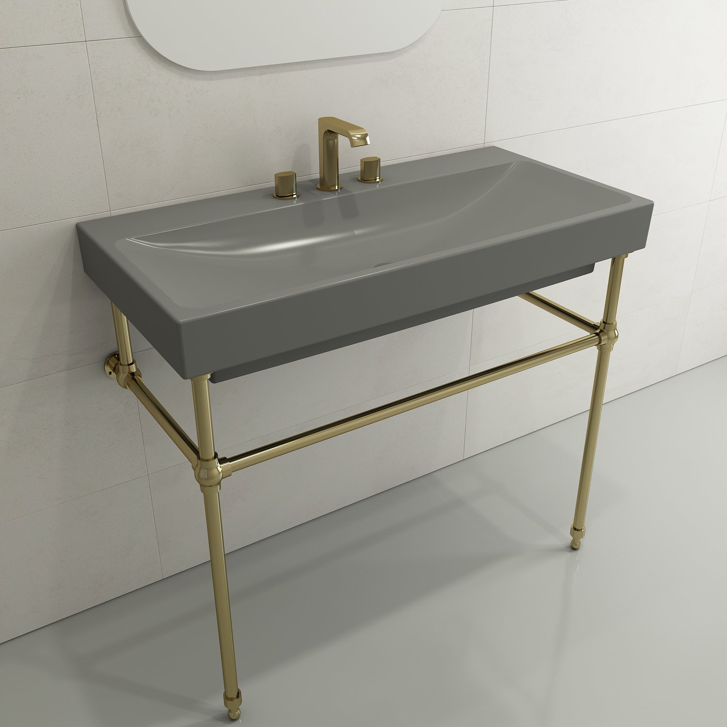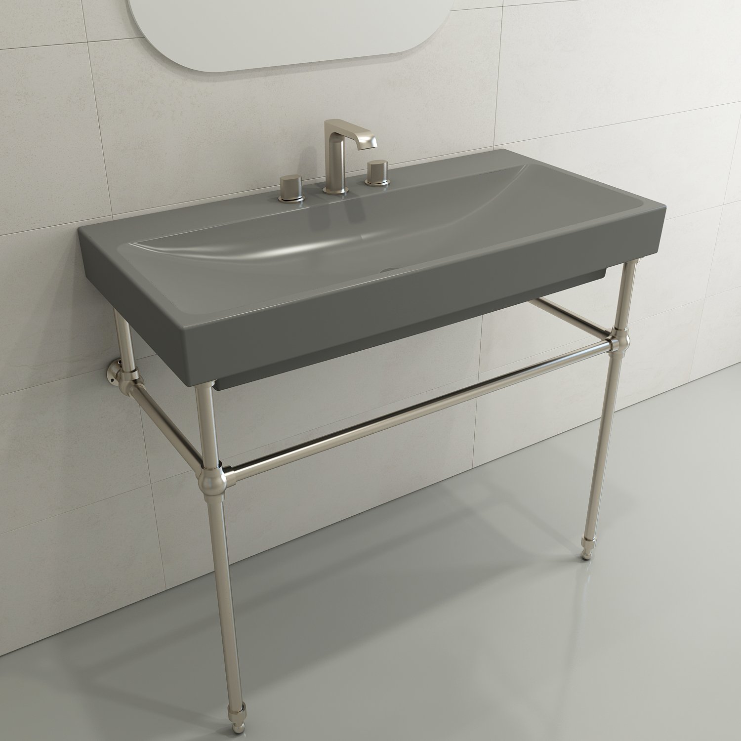 Bathroom sink with 3-hole (8in.) faucet setting. May be wall-hung, used with metal console legs, or semi-recessed into the counter.