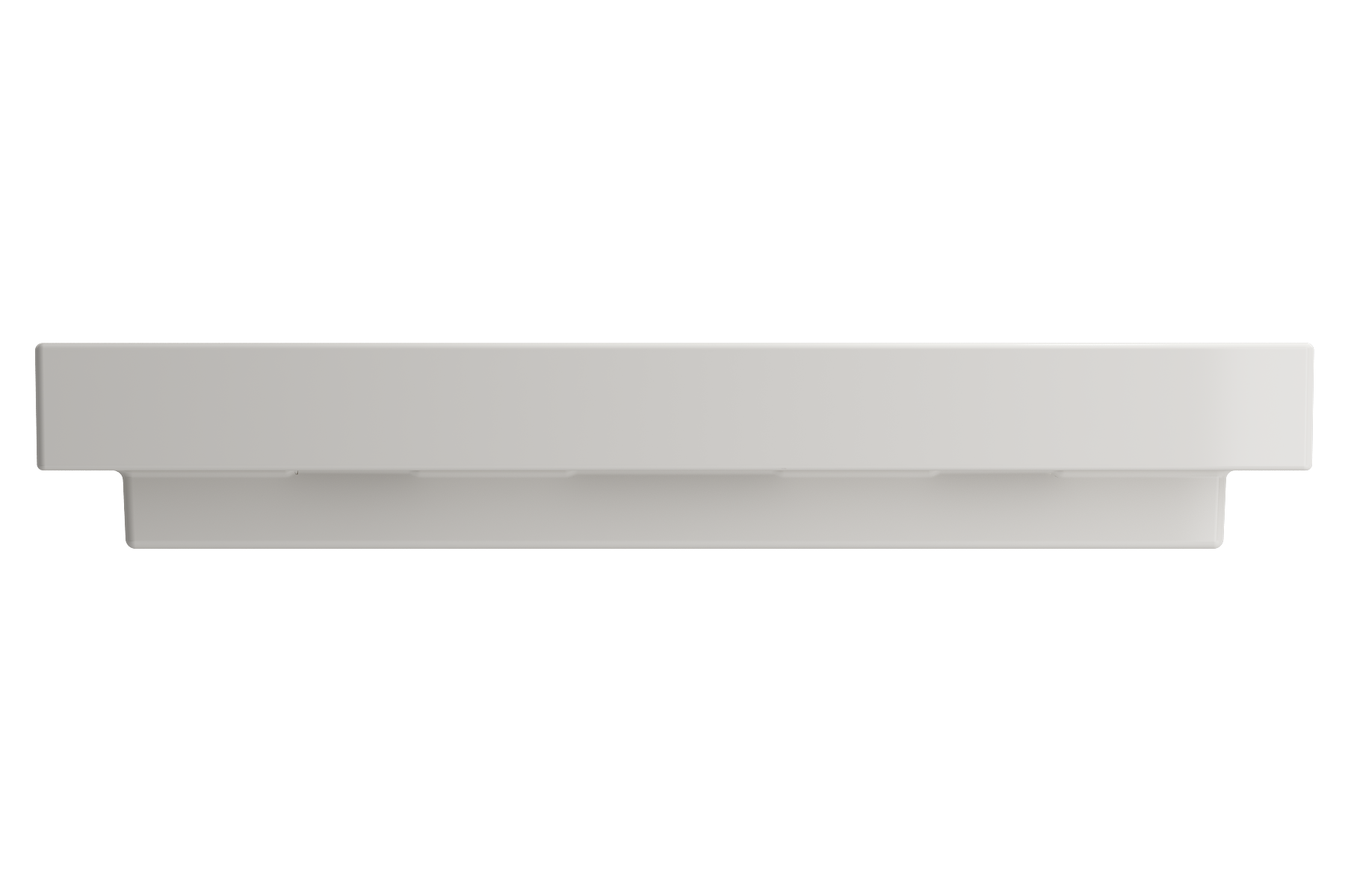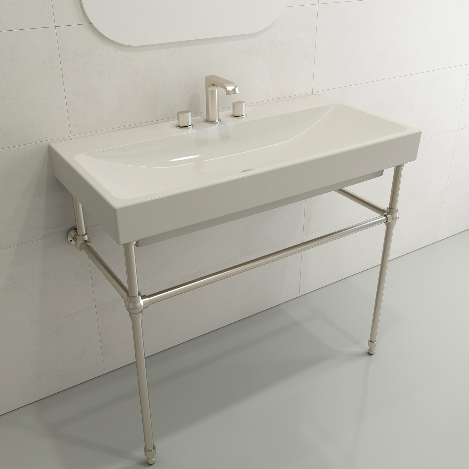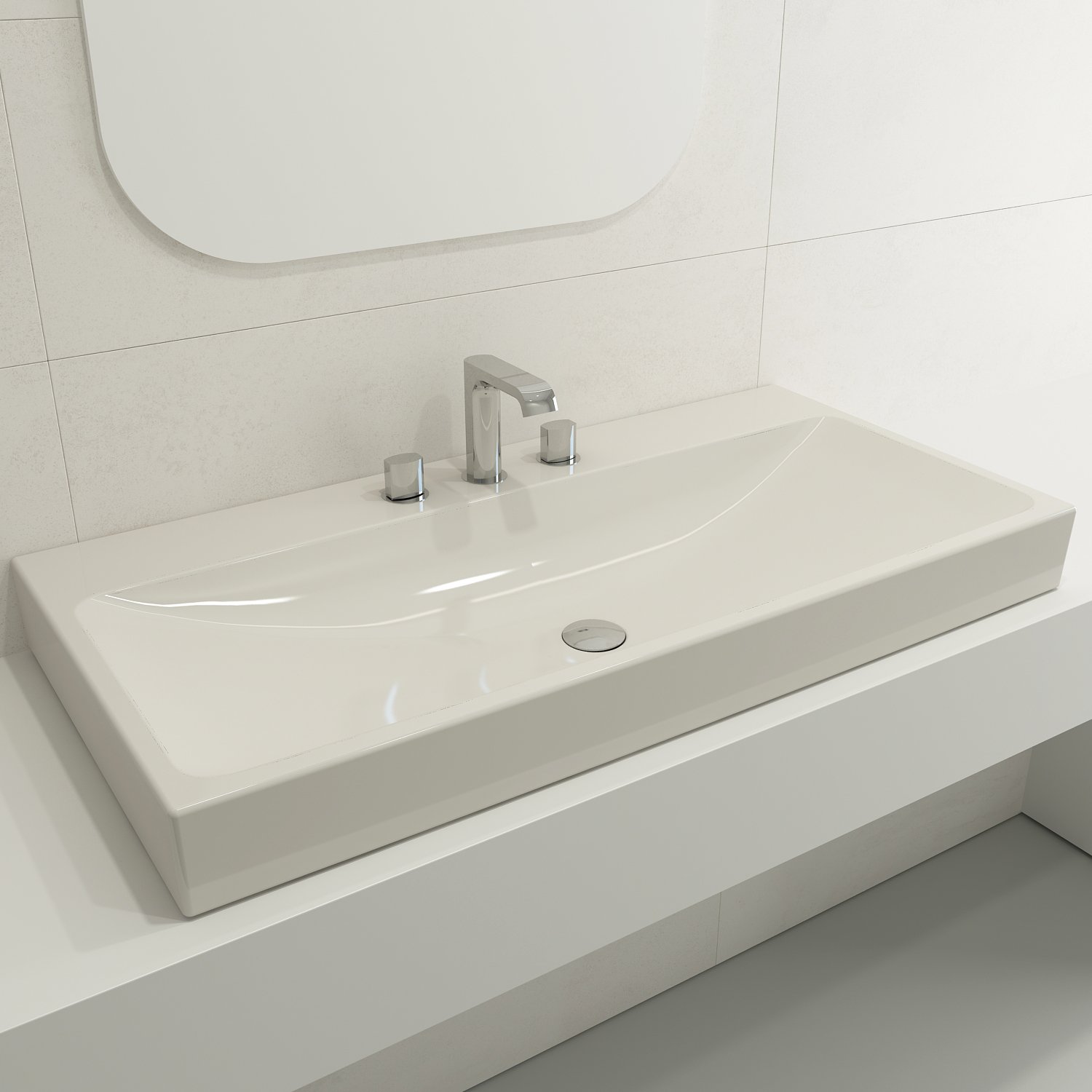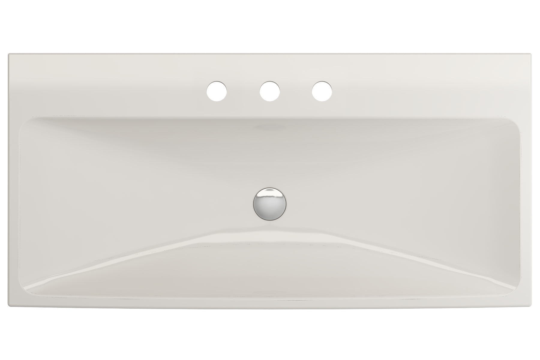 Bathroom sink with 3-hole (8in.) faucet setting. May be wall-hung, used with metal console legs, or semi-recessed into the counter.