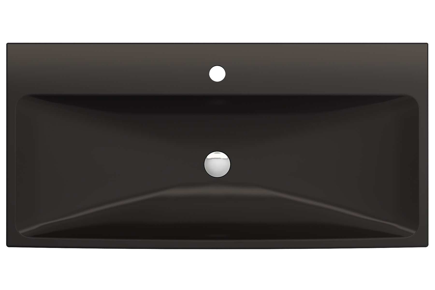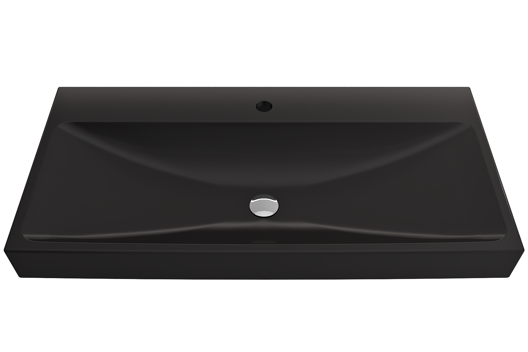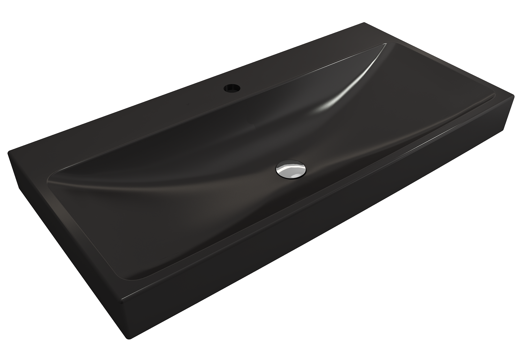 Bathroom sink with single-hole faucet setting. May be wall-hung, used with metal console legs, or semi-recessed into the counter.