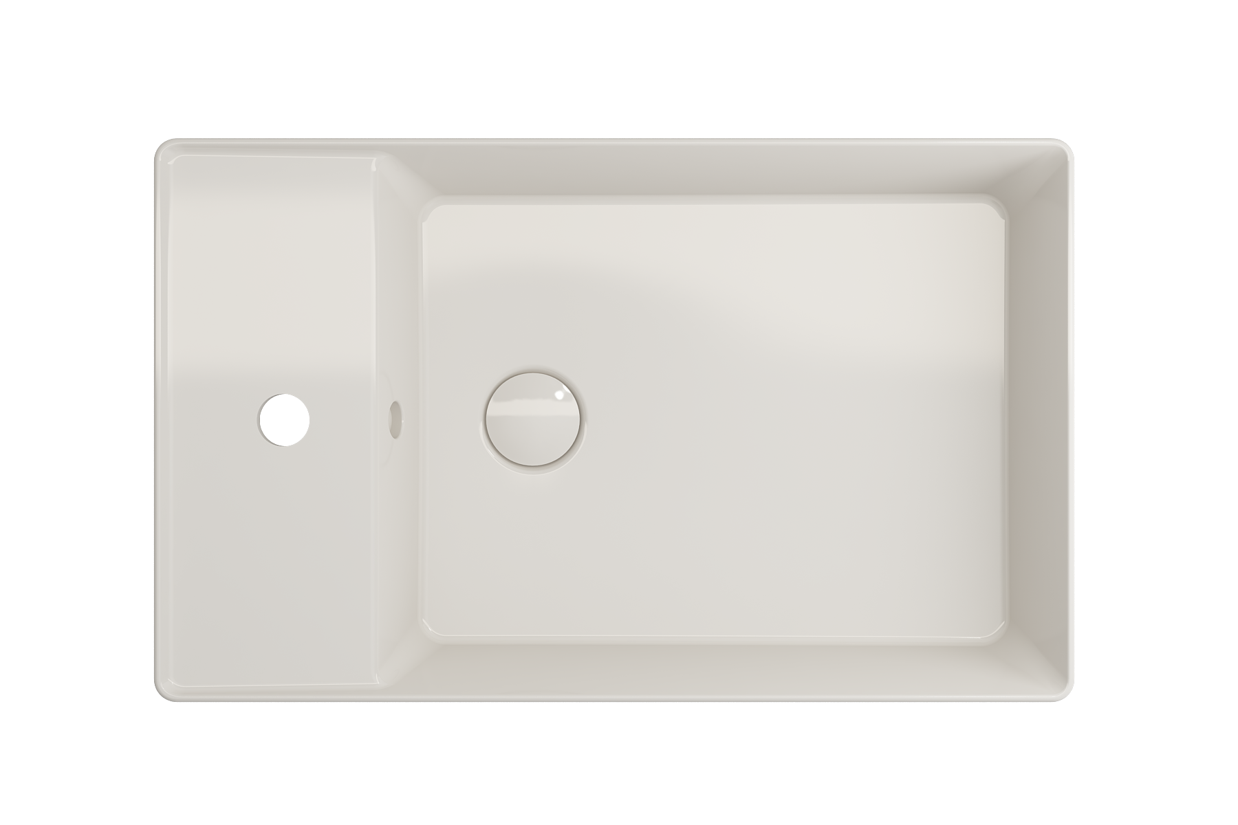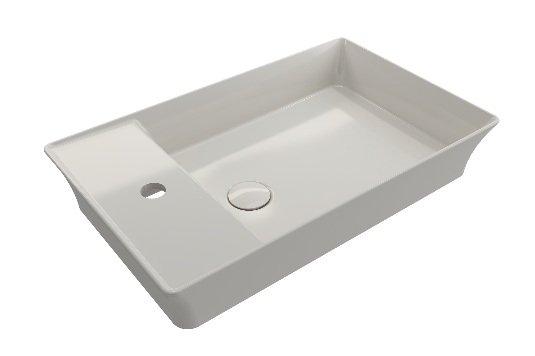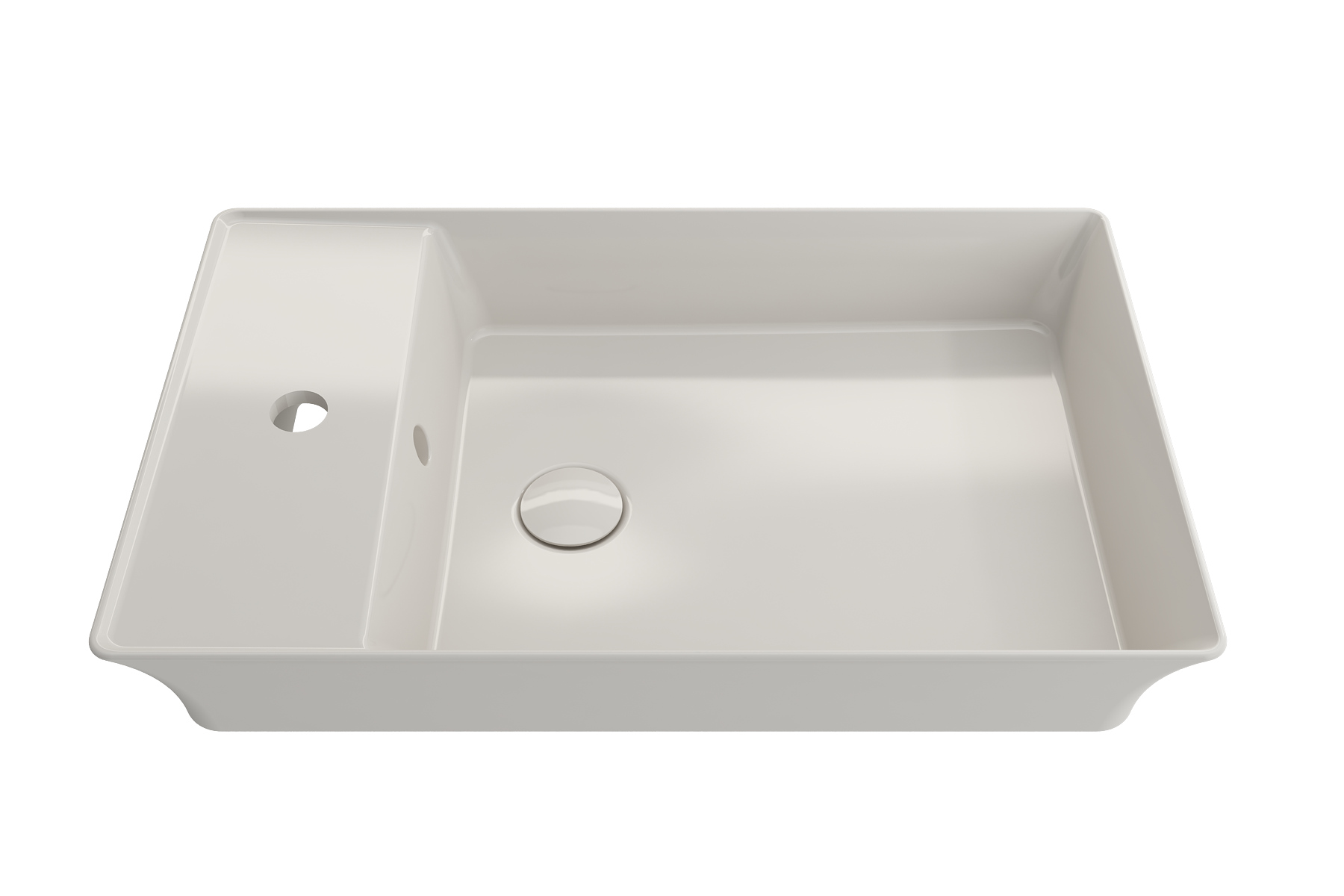 Fine fireclay bathroom vessel sink with single-hole faucet setting and overflow. Features delicately carving outside edges.