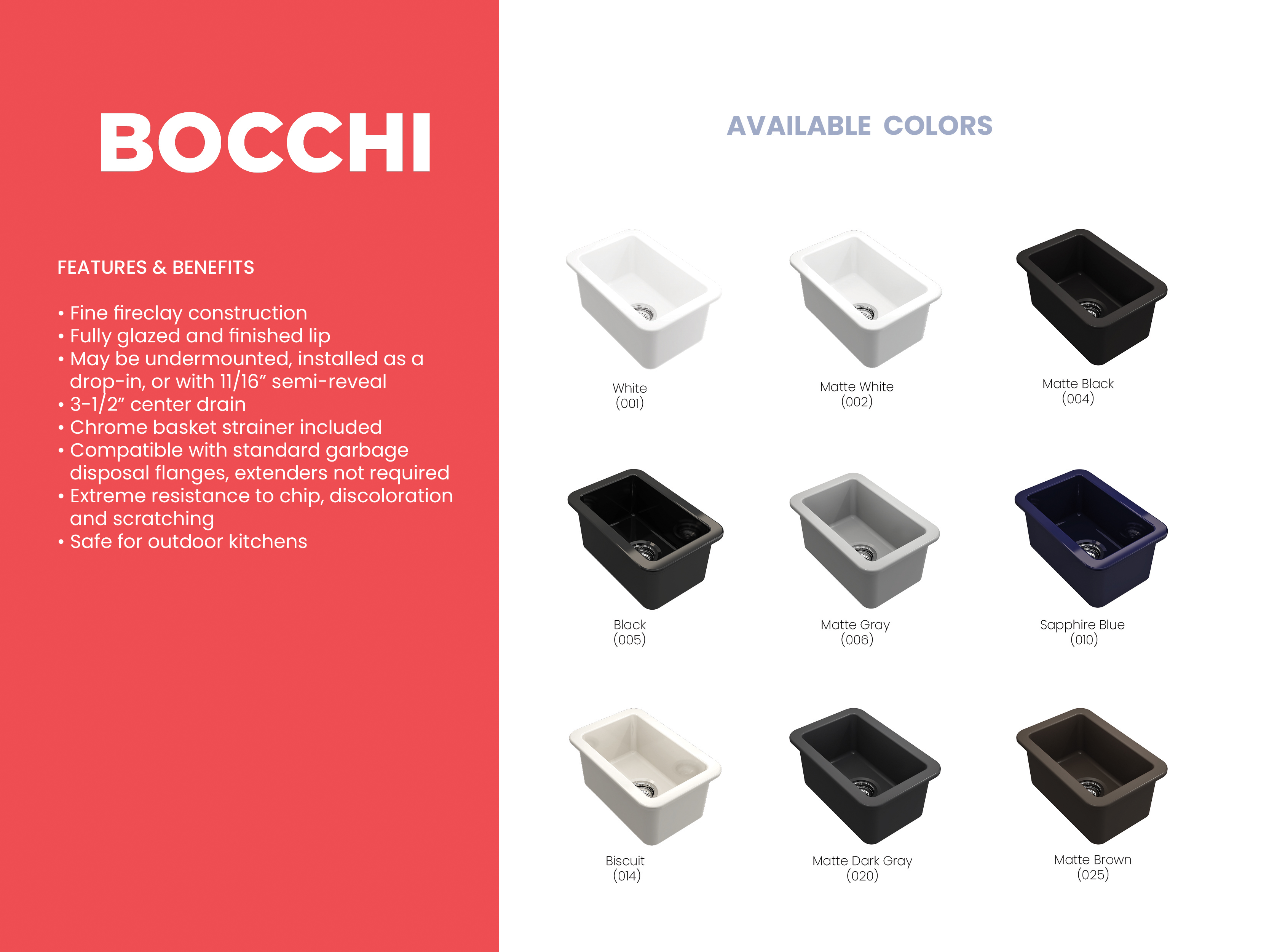 BOCCHI Sinks bring back the ultimate material to your kitchen. Fireclay, a 100% natural organic and recyclable material used by craftsman for centuries to create timeless appliances has now returned to your kitchen. With the firing in our kilns up to 2000°F temperatures, Fireclay becomes the most durable material used in today's kitchens. Thus, dealing with extreme heat coming from pots and pans is definitely not a problem. Due to their special glaze coating fused with the fireclay body, our sinks have a non-porous, uniform, scratch and stain resistant surface. With its distinctive looks, BOCCHI Sinks are truly crafted to match your design and functional desires.