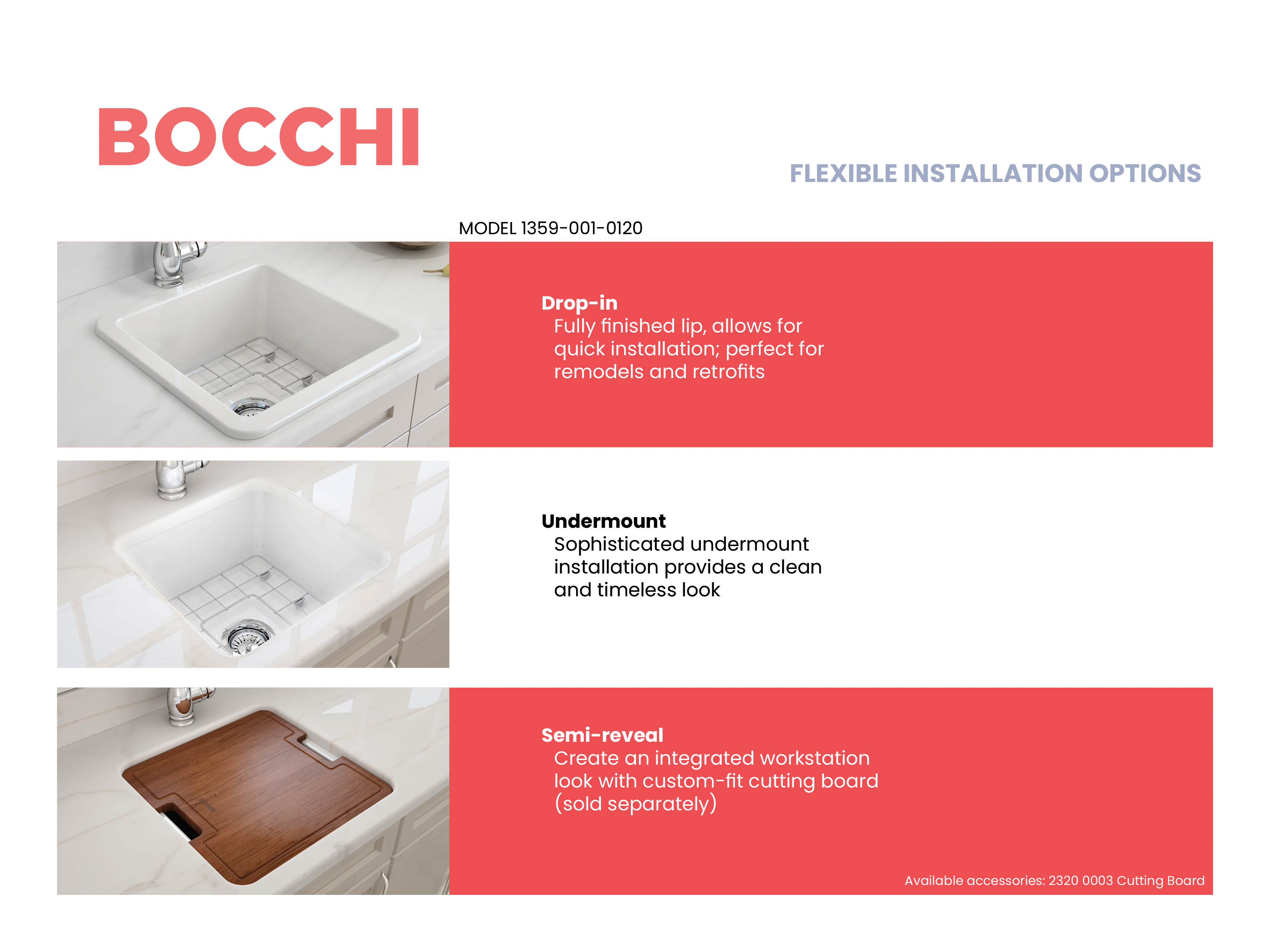 Uniquely crafted for to allow multiple installation types. May be installed as an undermount, drop-in, or with an 11/16” semi-reveal that creates a workstation sink ledge suitable for use with select accessories, including: cutting board, colanders, and roller mat. Note, the roller mat and expandable colander may also be used with the undermount and drop-in installations.