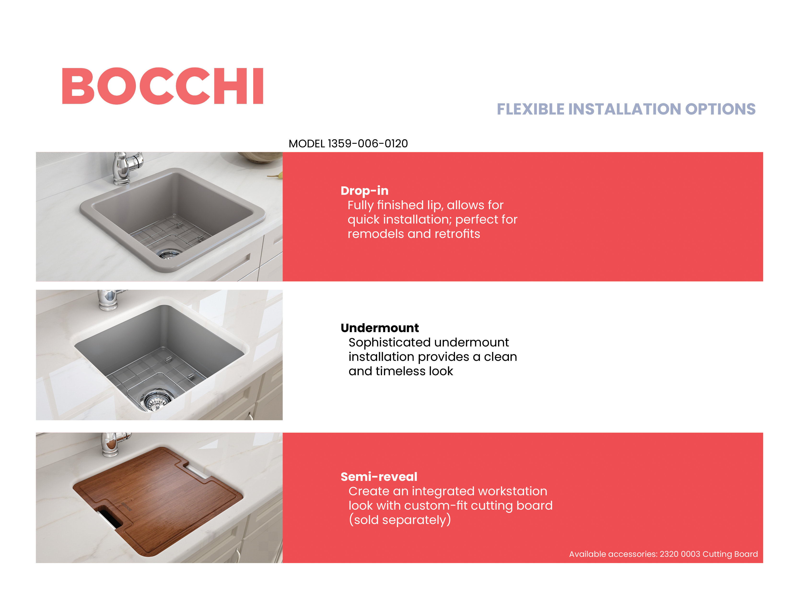 Uniquely crafted for to allow multiple installation types. May be installed as an undermount, drop-in, or with an 11/16” semi-reveal that creates a workstation sink ledge suitable for use with select accessories, including: cutting board, colanders, and roller mat. Note, the roller mat and expandable colander may also be used with the undermount and drop-in installations.