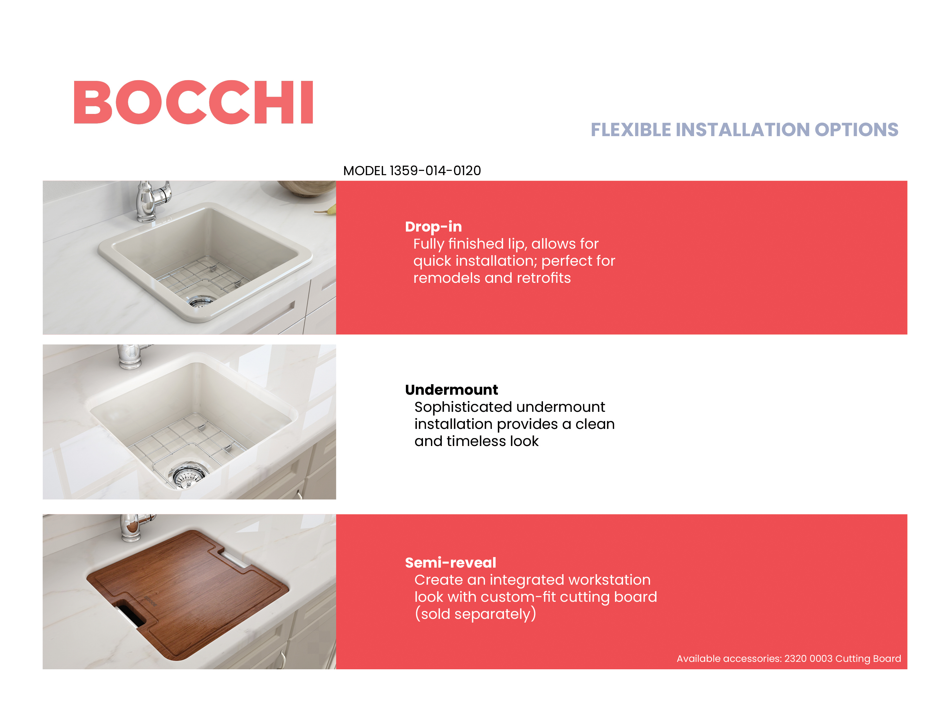 Uniquely crafted for to allow multiple installation types. May be installed as an undermount, drop-in, or with an 11/16” semi-reveal that creates a workstation sink ledge suitable for use with select accessories, including: cutting board, colanders, and roller mat. Note, the roller mat and expandable colander may also be used with the undermount and drop-in installations.