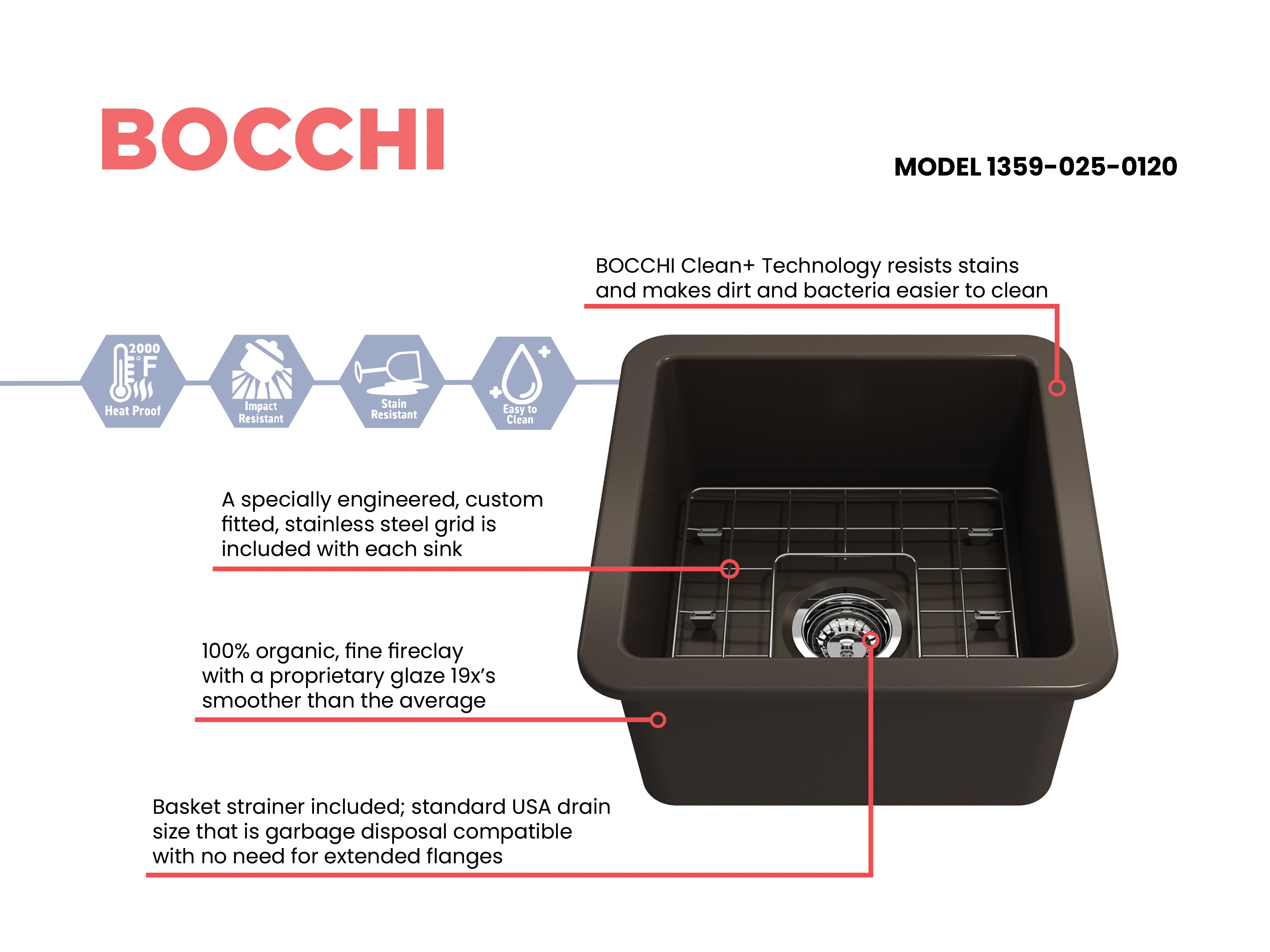 BOCCHI Sinks bring back the ultimate material to your kitchen. Fireclay, a 100% natural organic and recyclable material used by craftsman for centuries to create timeless appliances has now returned to your kitchen. With the firing in our kilns up to 2000°F temperatures, Fireclay becomes the most durable material used in today's kitchens. Thus, dealing with extreme heat coming from pots and pans is definitely not a problem. Due to their special glaze coating fused with the fireclay body, our sinks have a non-porous, uniform, scratch and stain resistant surface. With its protective bottom grid and distinctive looks, BOCCHI Sinks are truly crafted to match your design and functional desires.