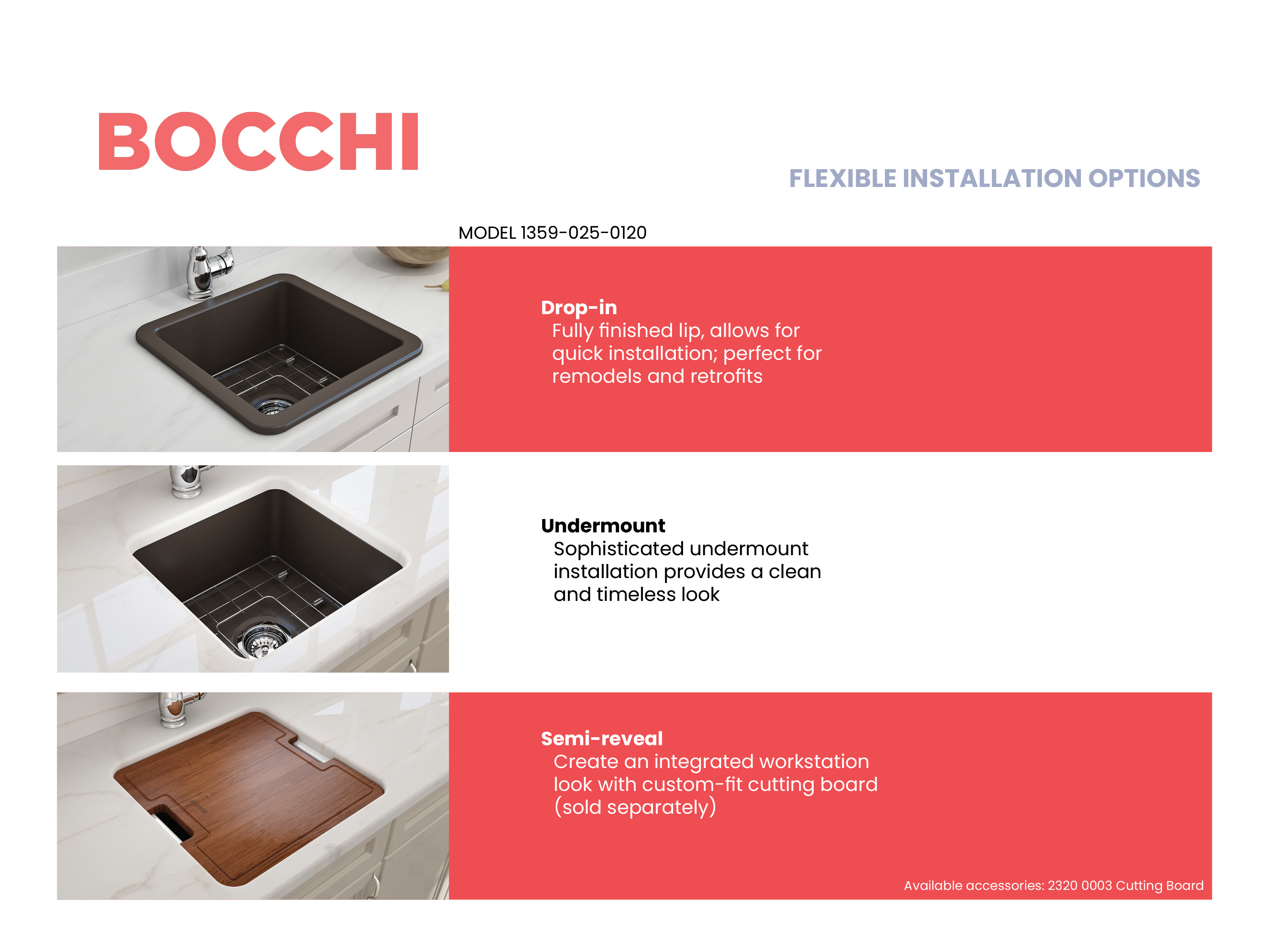 Uniquely crafted for to allow multiple installation types. May be installed as an undermount, drop-in, or with an 11/16” semi-reveal that creates a workstation sink ledge suitable for use with select accessories, including: cutting board, colanders, and roller mat. Note, the roller mat and expandable colander may also be used with the undermount and drop-in installations.