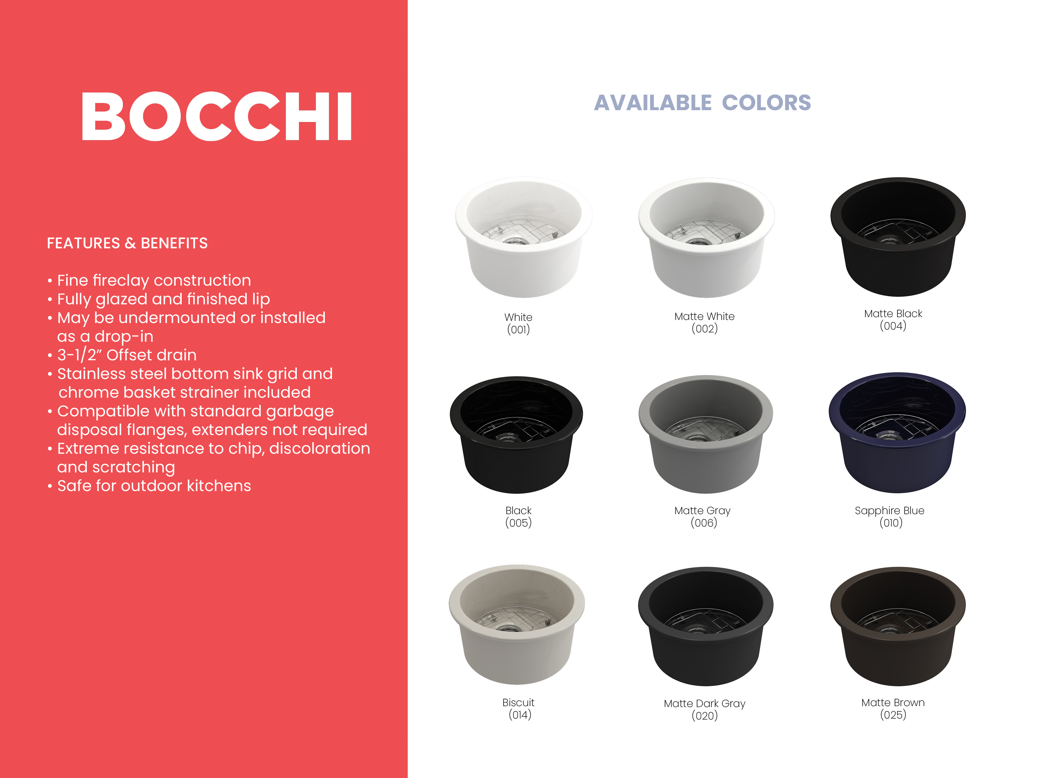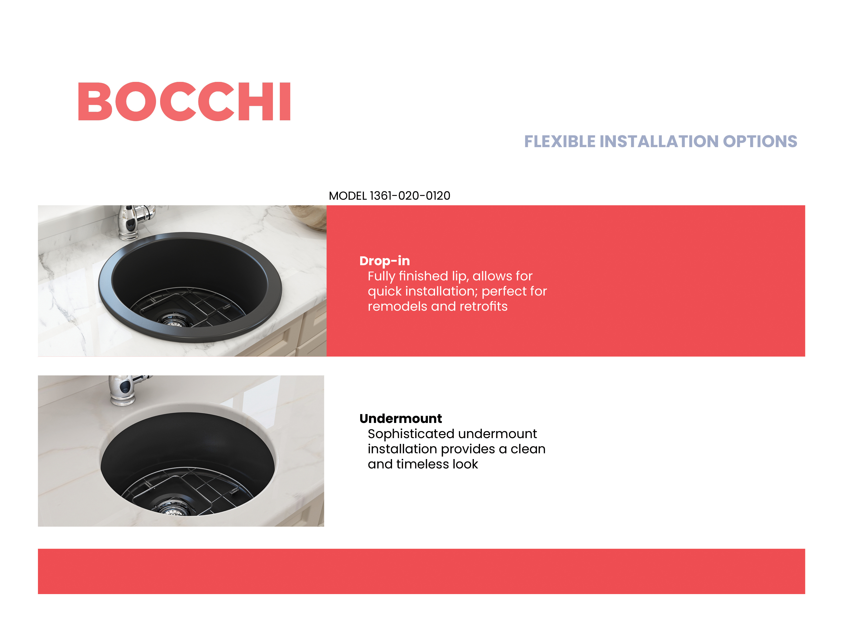 BOCCHI Sinks bring back the ultimate material to your kitchen. Fireclay, a 100% natural organic and recyclable material used by craftsman for centuries to create timeless appliances has now returned to your kitchen. With the firing in our kilns up to 2000°F temperatures, Fireclay becomes the most durable material used in today's kitchens. Thus, dealing with extreme heat coming from pots and pans is definitely not a problem. Due to their special glaze coating fused with the fireclay body, our sinks have a non-porous, uniform, scratch and stain resistant surface. With its protective bottom grid and distinctive looks, BOCCHI Sinks are truly crafted to match your design and functional desires.