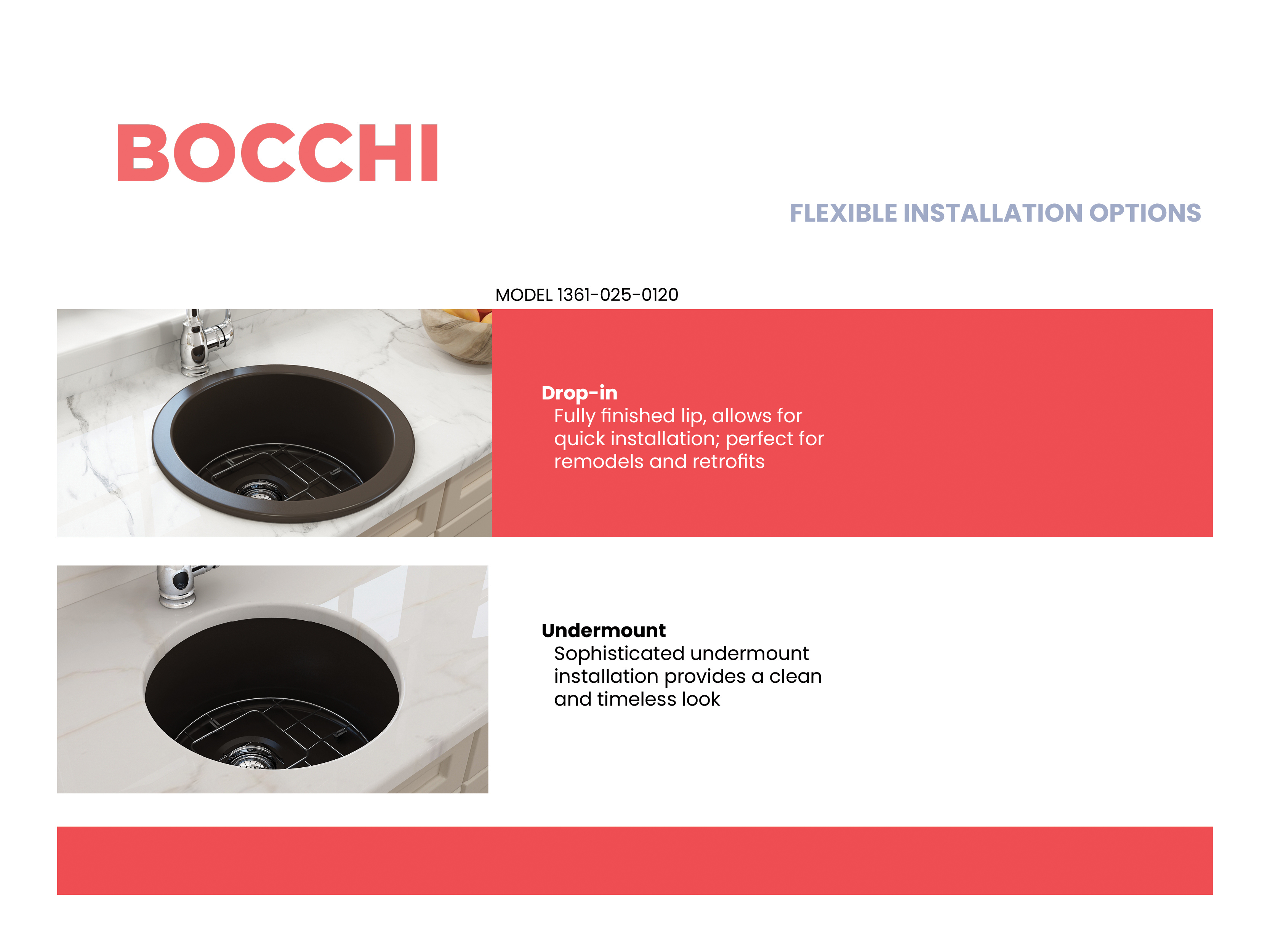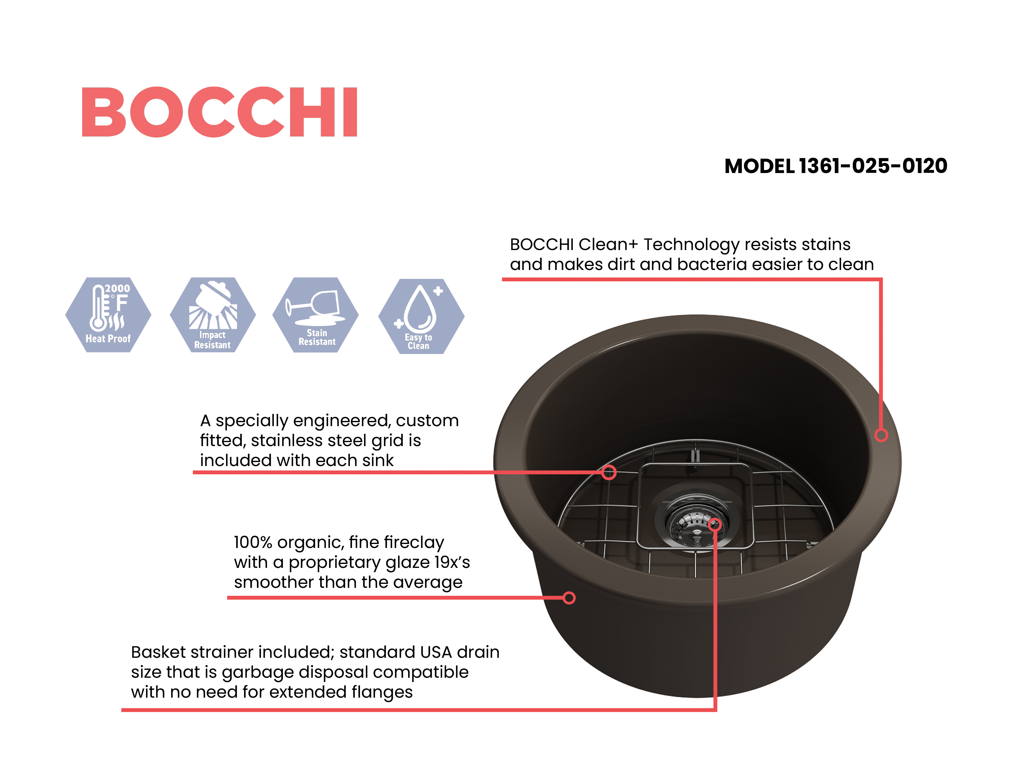 BOCCHI Sinks bring back the ultimate material to your kitchen. Fireclay, a 100% natural organic and recyclable material used by craftsman for centuries to create timeless appliances has now returned to your kitchen. With the firing in our kilns up to 2000°F temperatures, Fireclay becomes the most durable material used in today's kitchens. Thus, dealing with extreme heat coming from pots and pans is definitely not a problem. Due to their special glaze coating fused with the fireclay body, our sinks have a non-porous, uniform, scratch and stain resistant surface. With its protective bottom grid and distinctive looks, BOCCHI Sinks are truly crafted to match your design and functional desires.