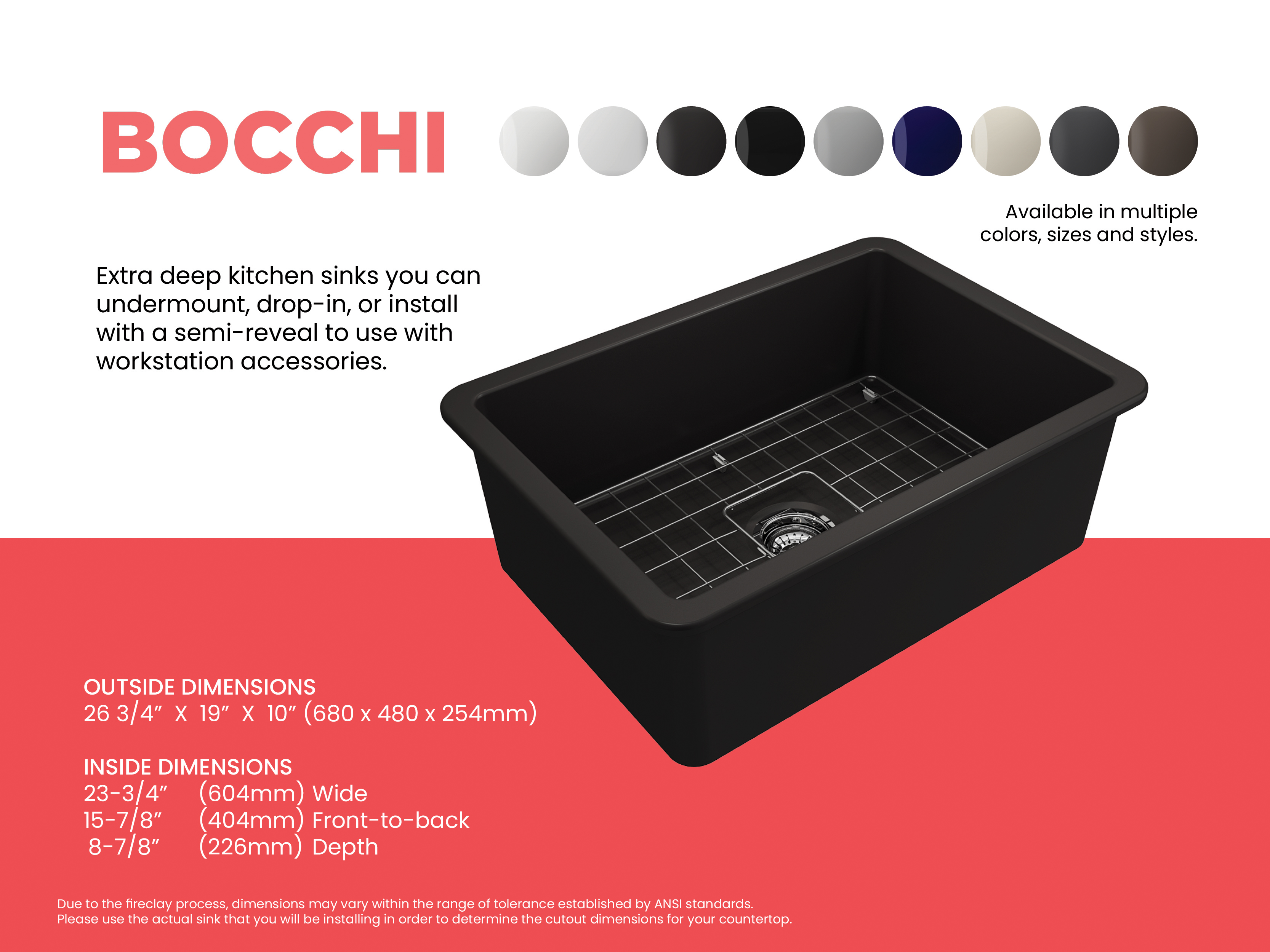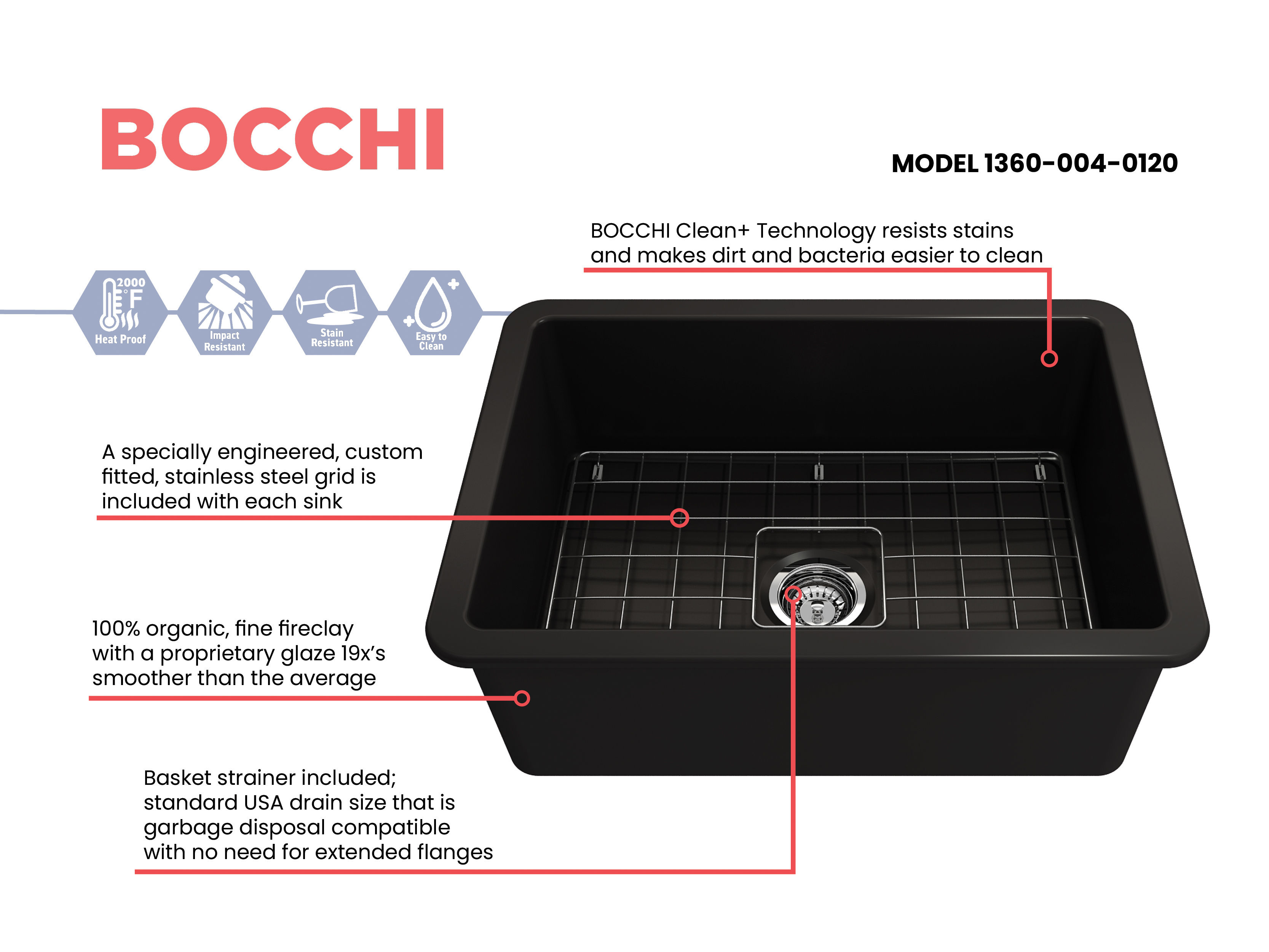 BOCCHI Sinks bring back the ultimate material to your kitchen. Fireclay, a 100% natural organic and recyclable material used by craftsman for centuries to create timeless appliances has now returned to your kitchen. With the firing in our kilns up to 2000°F temperatures, Fireclay becomes the most durable material used in today's kitchens. Thus, dealing with extreme heat coming from pots and pans is definitely not a problem. Due to their special glaze coating fused with the fireclay body, our sinks have a non-porous, uniform, scratch and stain resistant surface. With its protective bottom grid and distinctive looks, BOCCHI Sinks are truly crafted to match your design and functional desires.