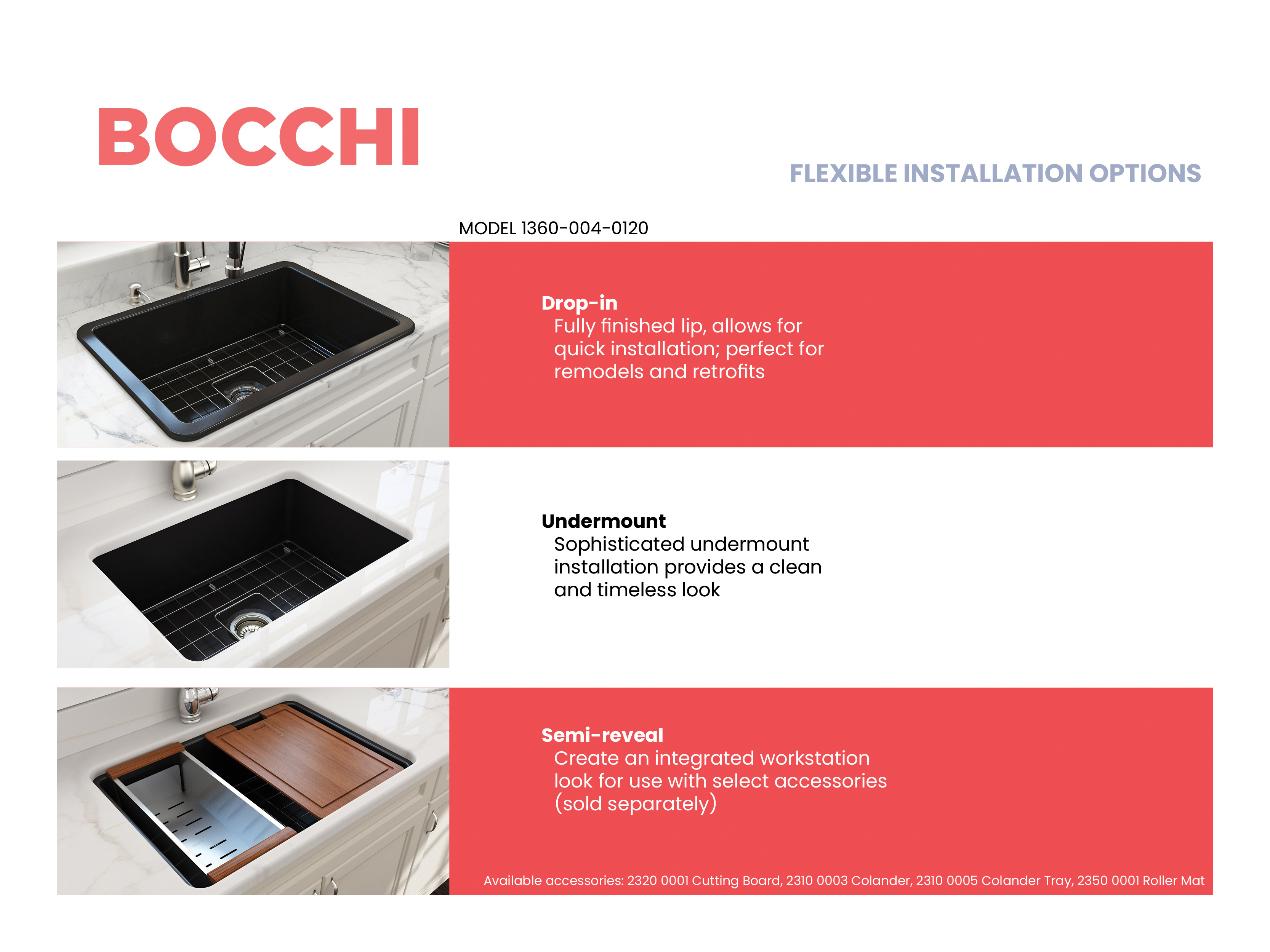 Uniquely crafted for to allow multiple installation types. May be installed as an undermount, drop-in, or with an 11/16” semi-reveal that creates a workstation sink ledge suitable for use with select accessories, including: cutting board, colanders, and roller mat. Note, the roller mat and expandable colander may also be used with the undermount and drop-in installations.