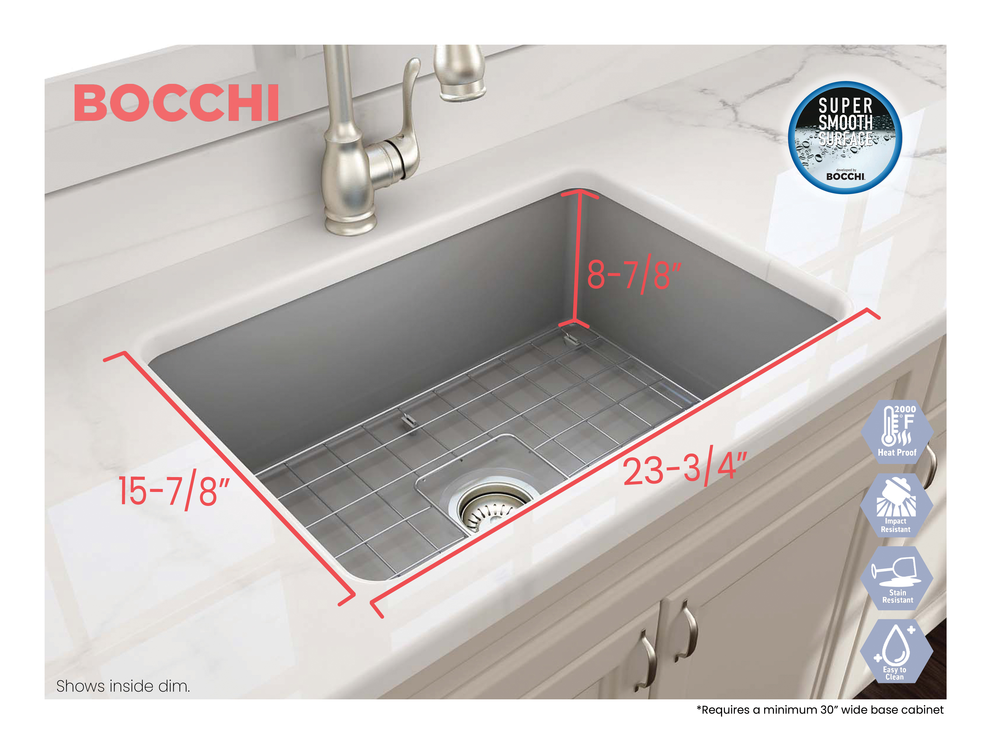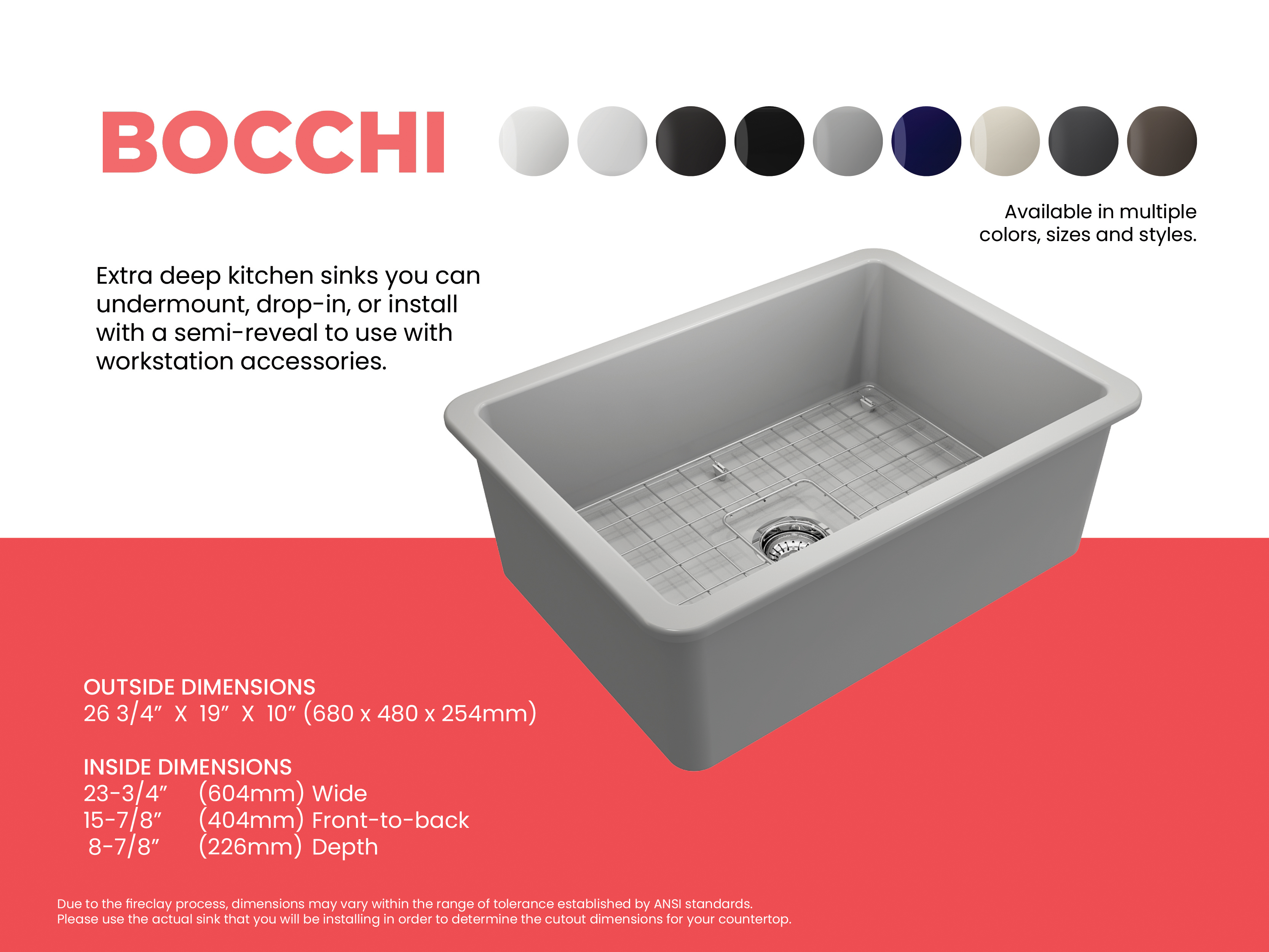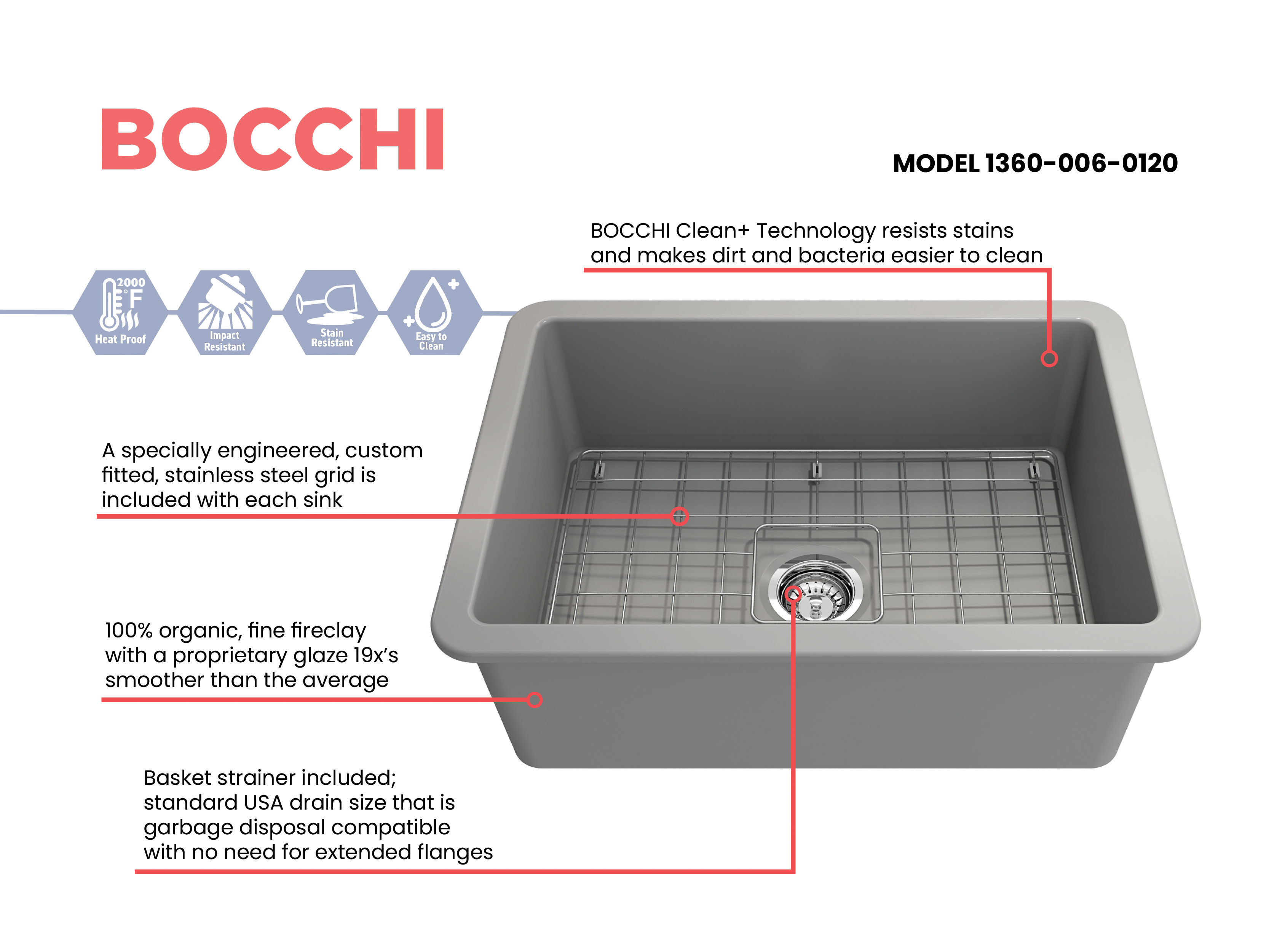 BOCCHI Sinks bring back the ultimate material to your kitchen. Fireclay, a 100% natural organic and recyclable material used by craftsman for centuries to create timeless appliances has now returned to your kitchen. With the firing in our kilns up to 2000°F temperatures, Fireclay becomes the most durable material used in today's kitchens. Thus, dealing with extreme heat coming from pots and pans is definitely not a problem. Due to their special glaze coating fused with the fireclay body, our sinks have a non-porous, uniform, scratch and stain resistant surface. With its protective bottom grid and distinctive looks, BOCCHI Sinks are truly crafted to match your design and functional desires.