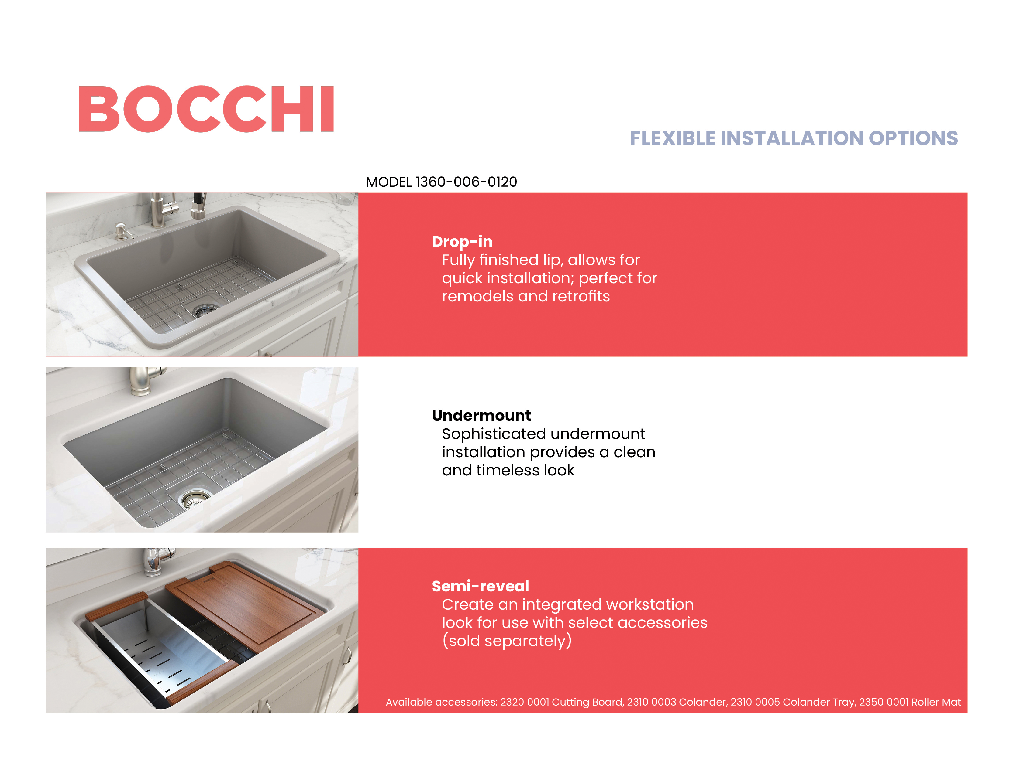 Uniquely crafted for to allow multiple installation types. May be installed as an undermount, drop-in, or with an 11/16” semi-reveal that creates a workstation sink ledge suitable for use with select accessories, including: cutting board, colanders, and roller mat. Note, the roller mat and expandable colander may also be used with the undermount and drop-in installations.