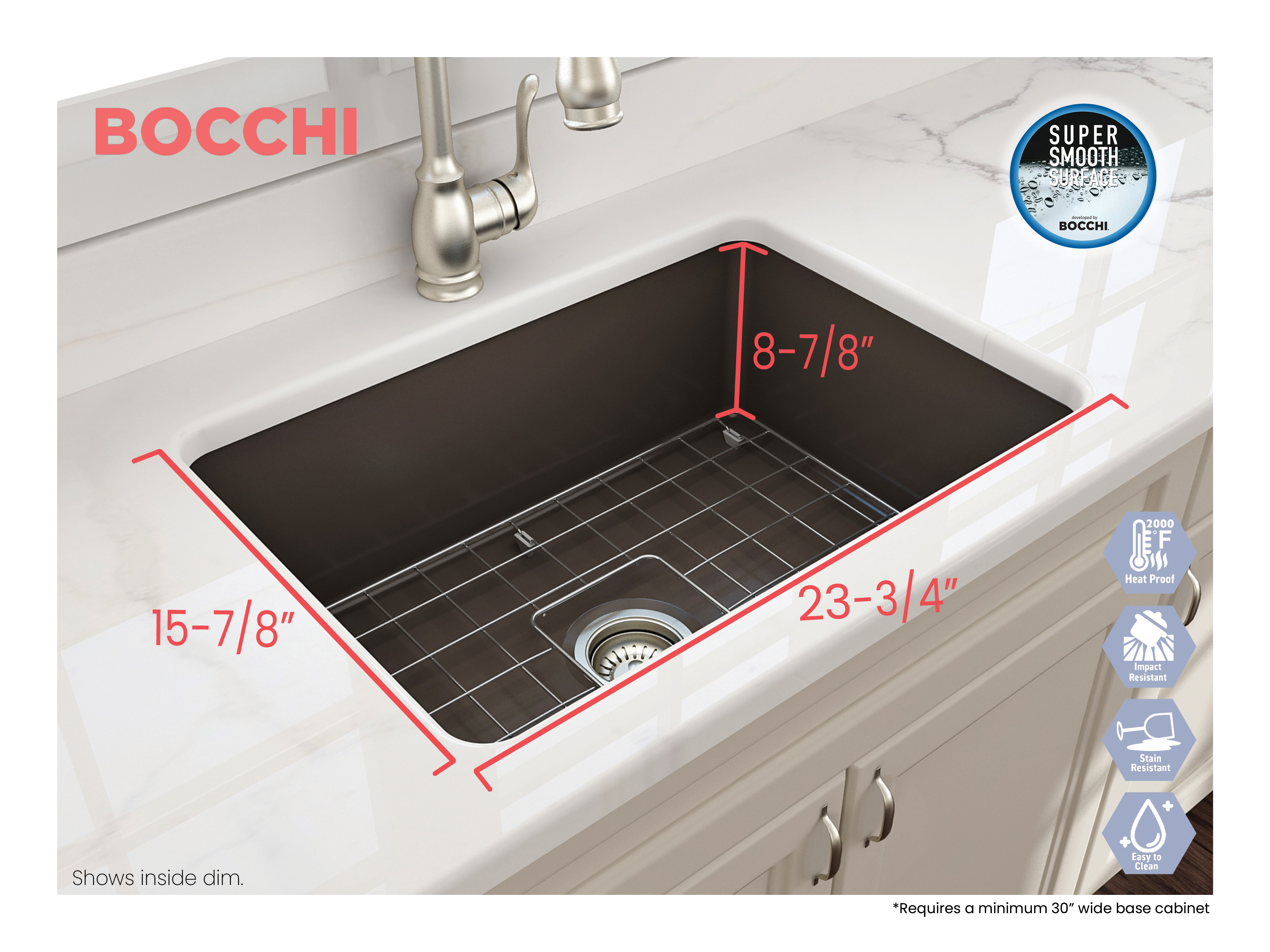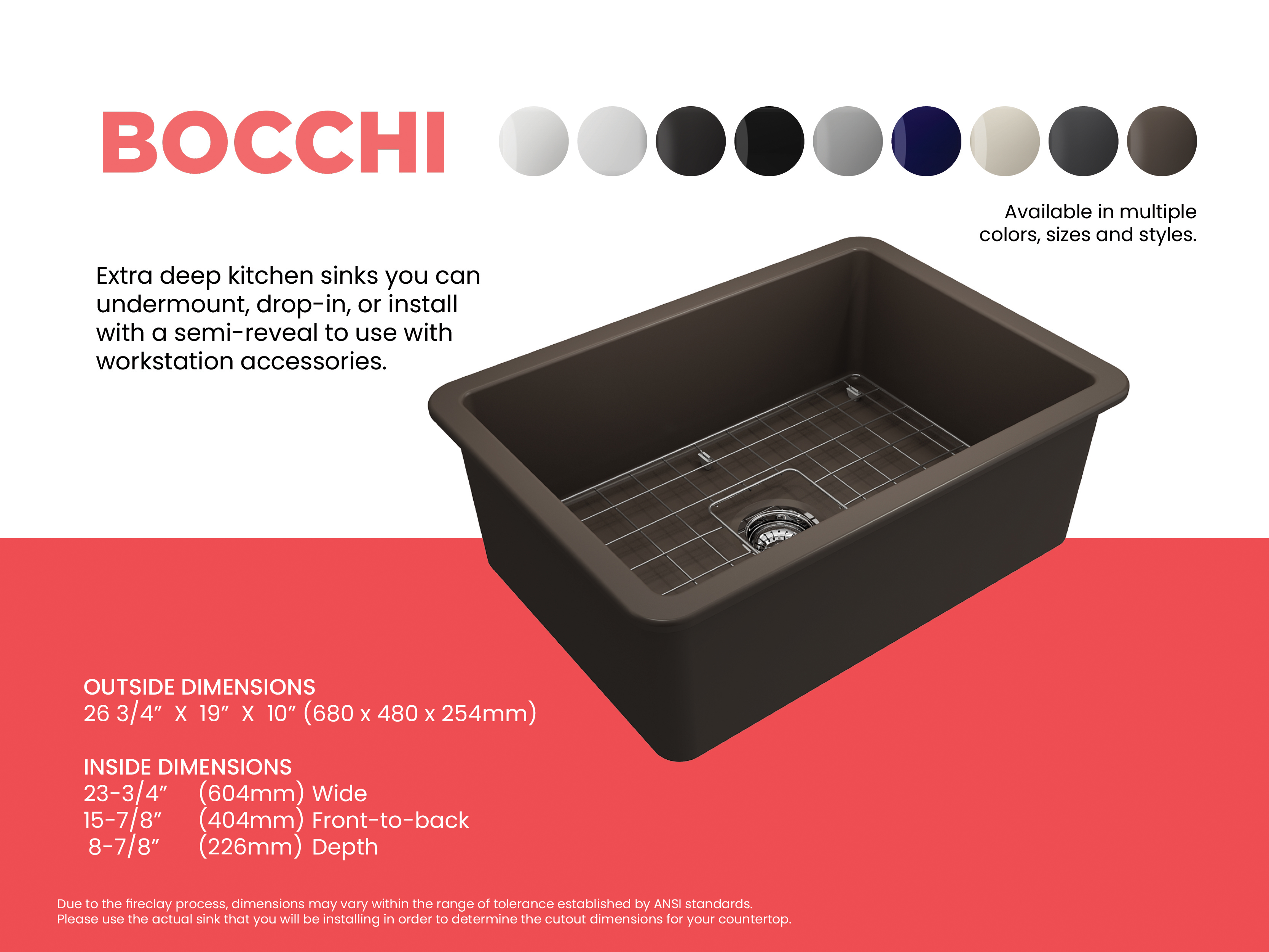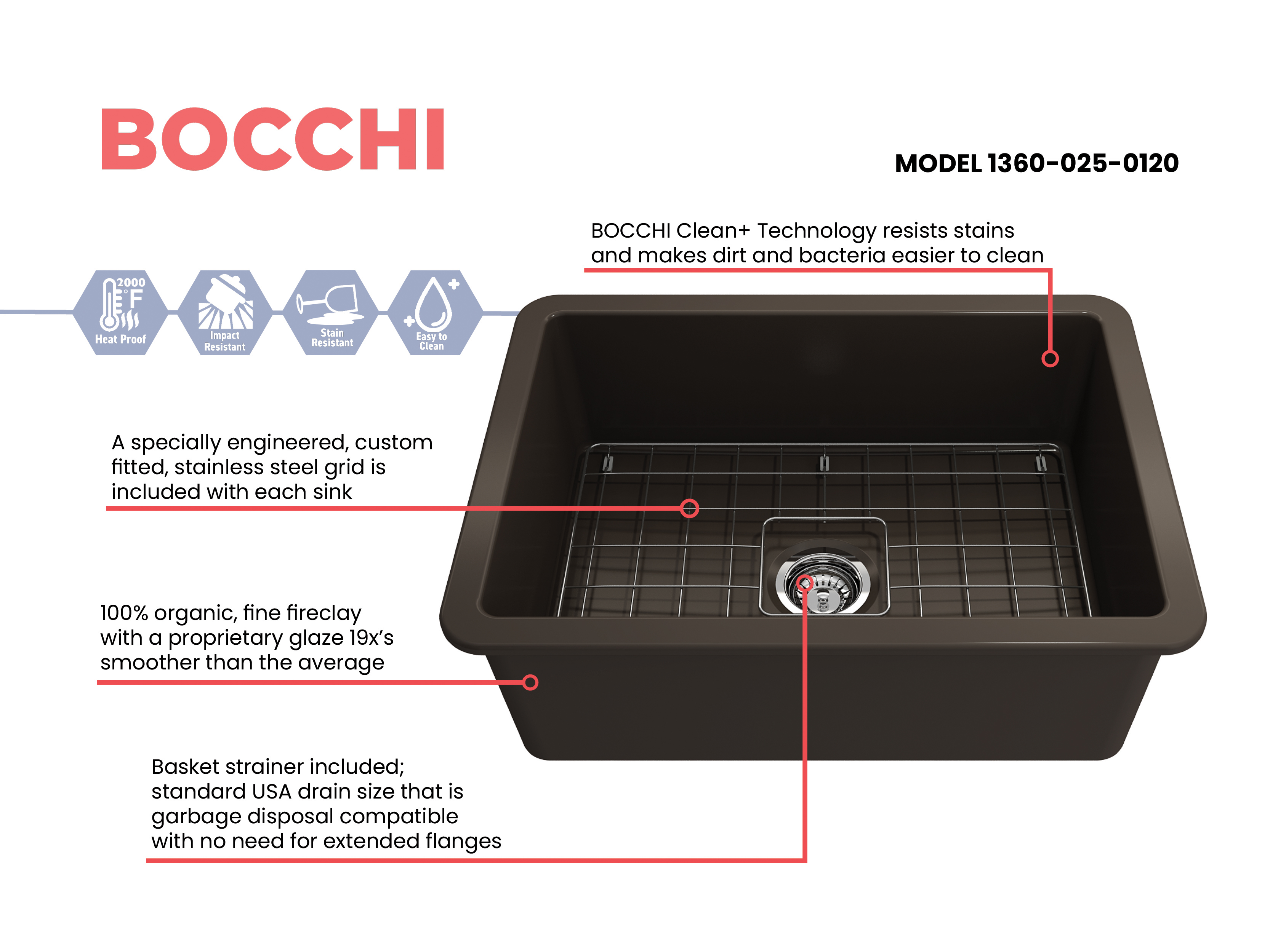 BOCCHI Sinks bring back the ultimate material to your kitchen. Fireclay, a 100% natural organic and recyclable material used by craftsman for centuries to create timeless appliances has now returned to your kitchen. With the firing in our kilns up to 2000°F temperatures, Fireclay becomes the most durable material used in today's kitchens. Thus, dealing with extreme heat coming from pots and pans is definitely not a problem. Due to their special glaze coating fused with the fireclay body, our sinks have a non-porous, uniform, scratch and stain resistant surface. With its protective bottom grid and distinctive looks, BOCCHI Sinks are truly crafted to match your design and functional desires.