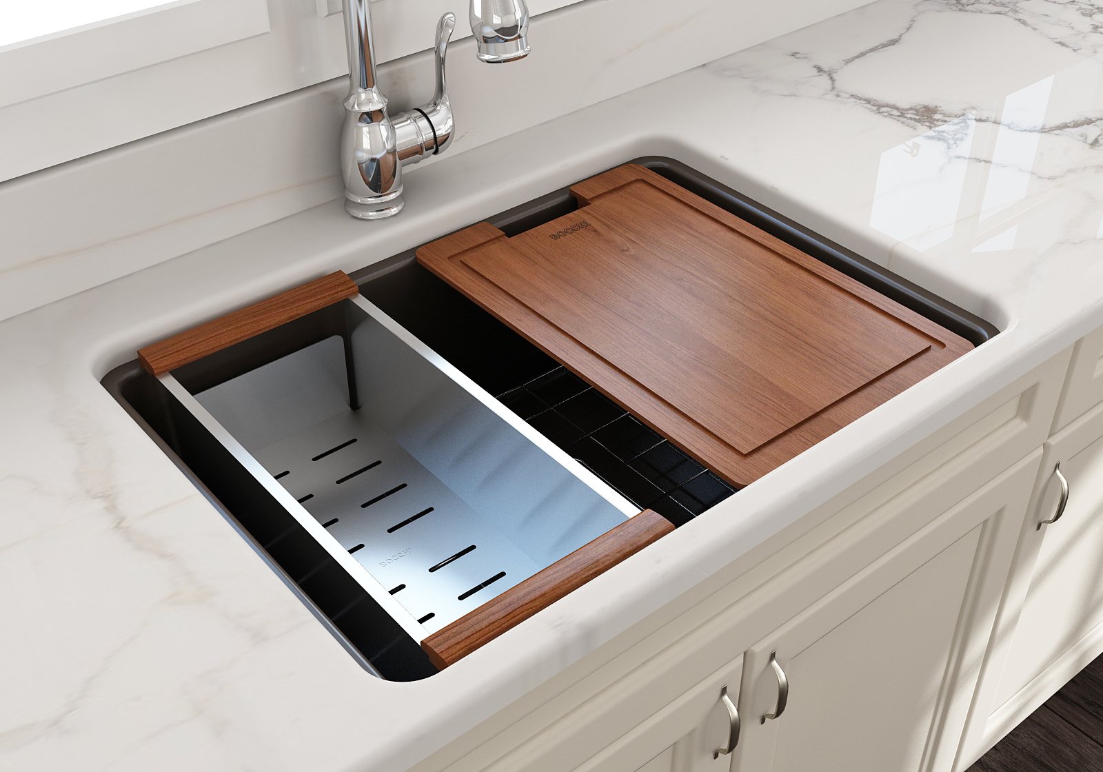 Uniquely crafted for to allow multiple installation types. May be installed as an undermount, drop-in, or with an 11/16” semi-reveal that creates a workstation sink ledge suitable for use with select accessories, including: cutting board, colanders, and roller mat. Note, the roller mat and expandable colander may also be used with the undermount and drop-in installations.