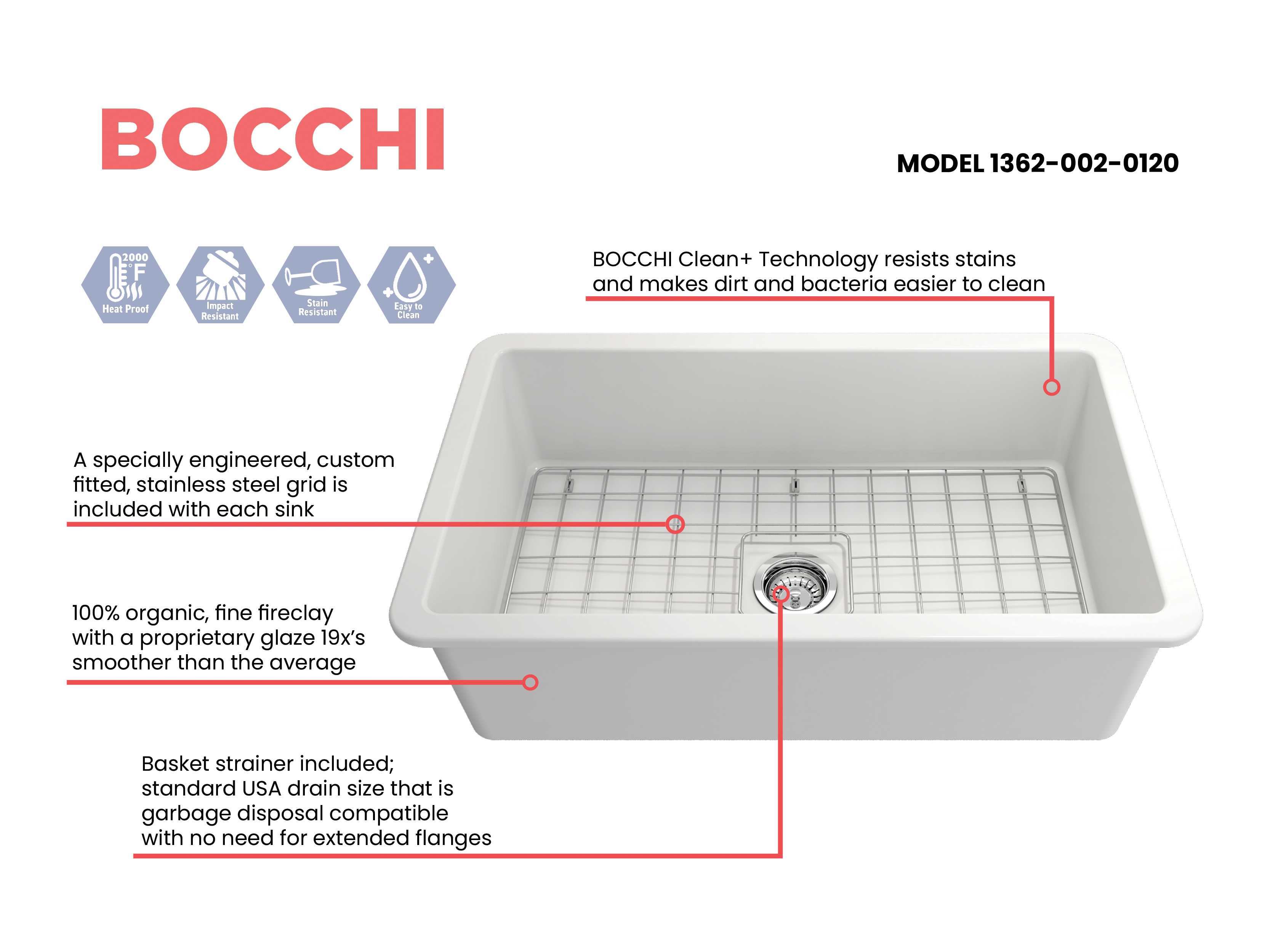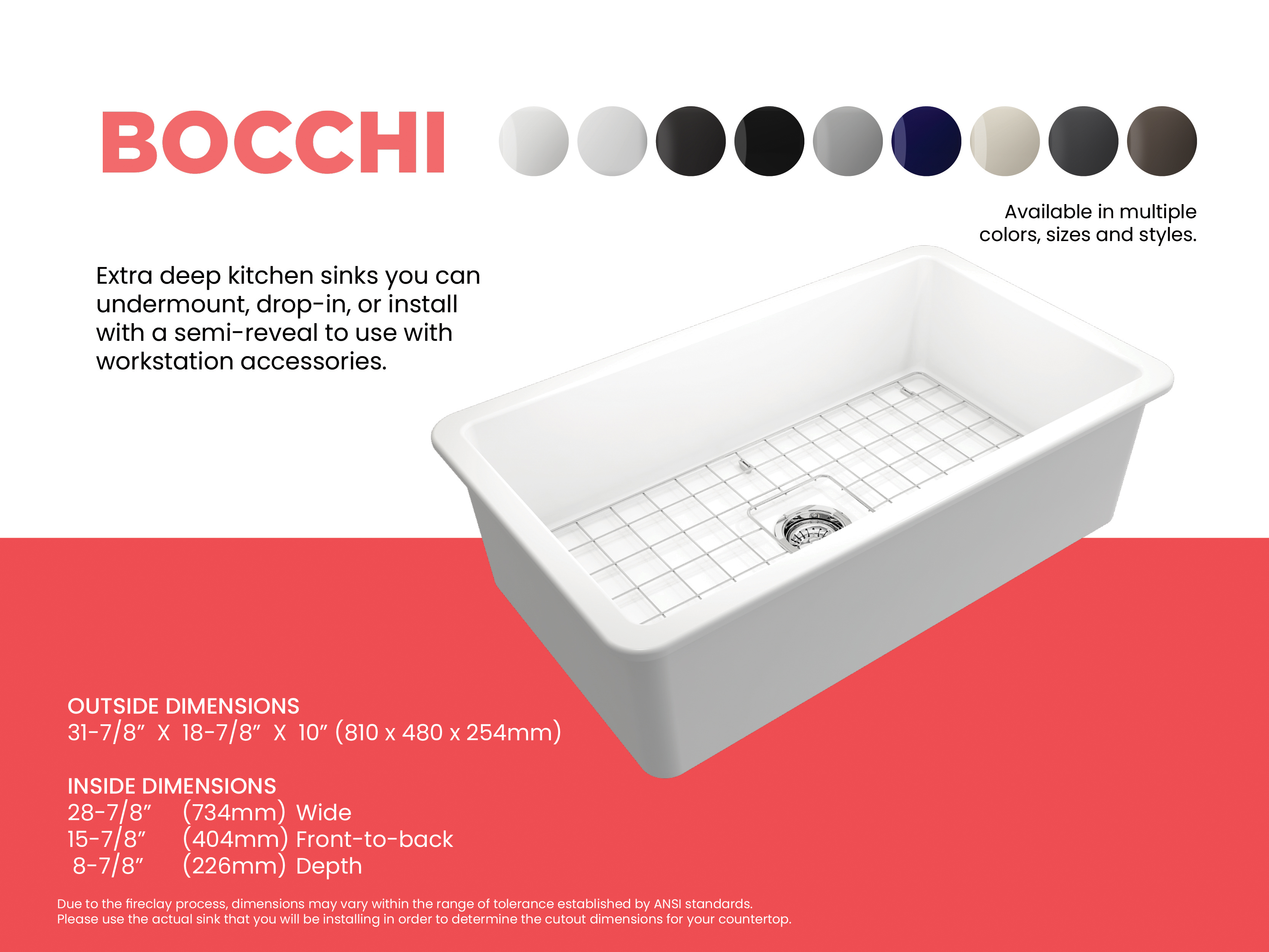 BOCCHI Sinks bring back the ultimate material to your kitchen. Fireclay, a 100% natural organic and recyclable material used by craftsman for centuries to create timeless appliances has now returned to your kitchen. With the firing in our kilns up to 2000°F temperatures, Fireclay becomes the most durable material used in today's kitchens. Thus, dealing with extreme heat coming from pots and pans is definitely not a problem. Due to their special glaze coating fused with the fireclay body, our sinks have a non-porous, uniform, scratch and stain resistant surface. With its protective bottom grid and distinctive looks, BOCCHI Sinks are truly crafted to match your design and functional desires.